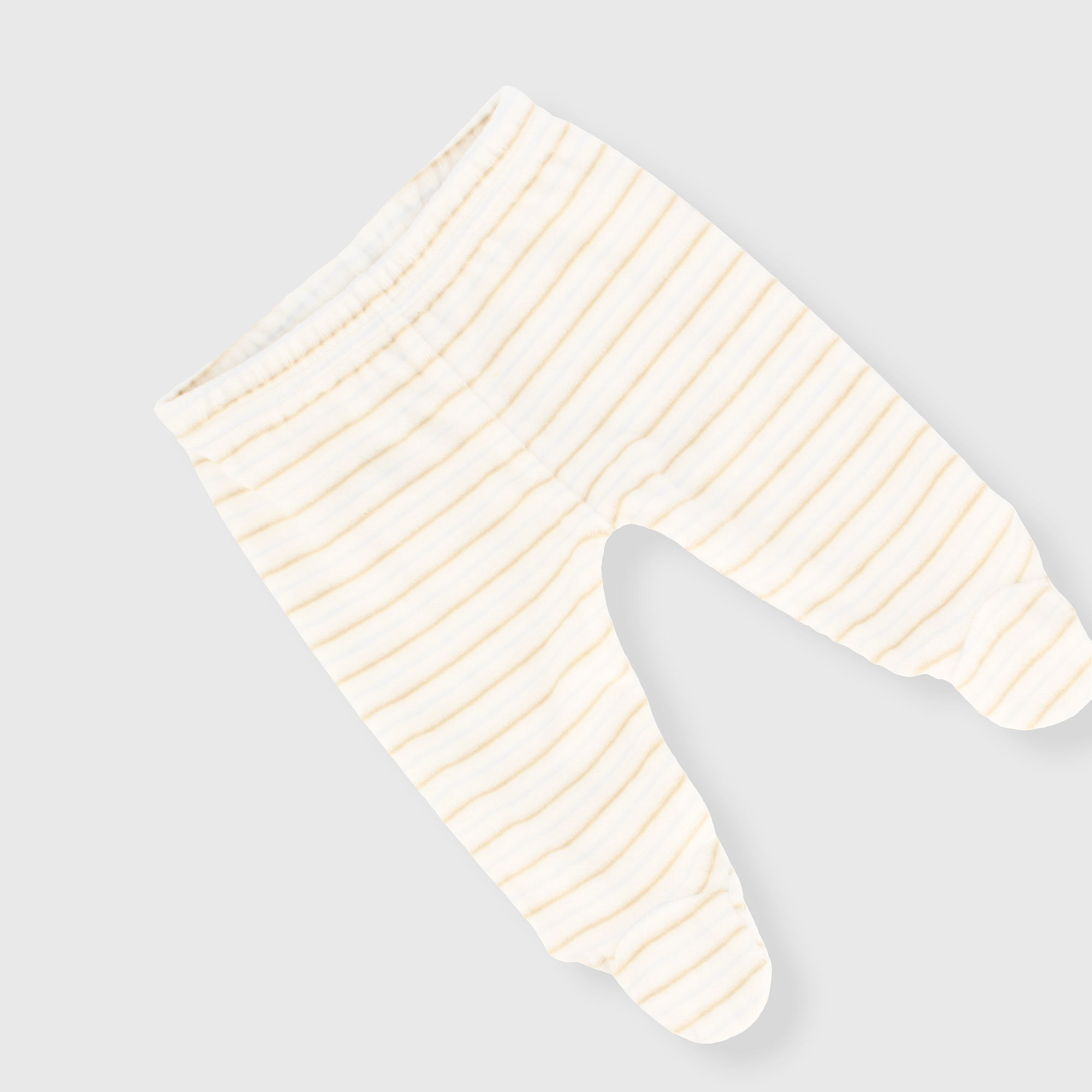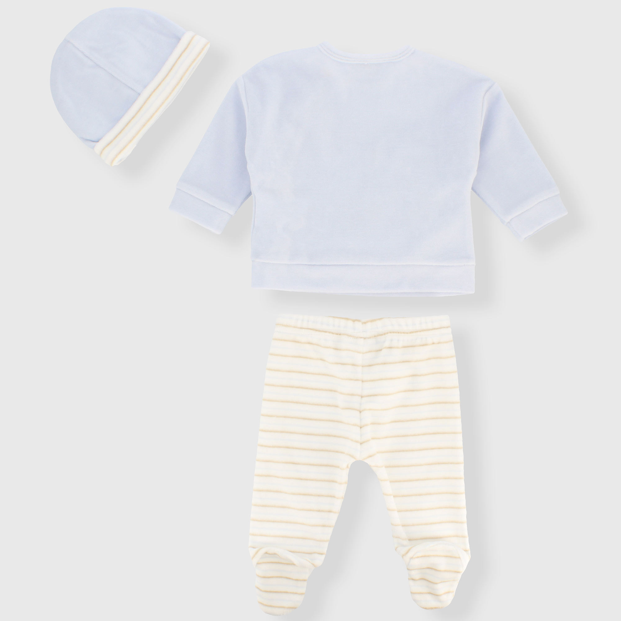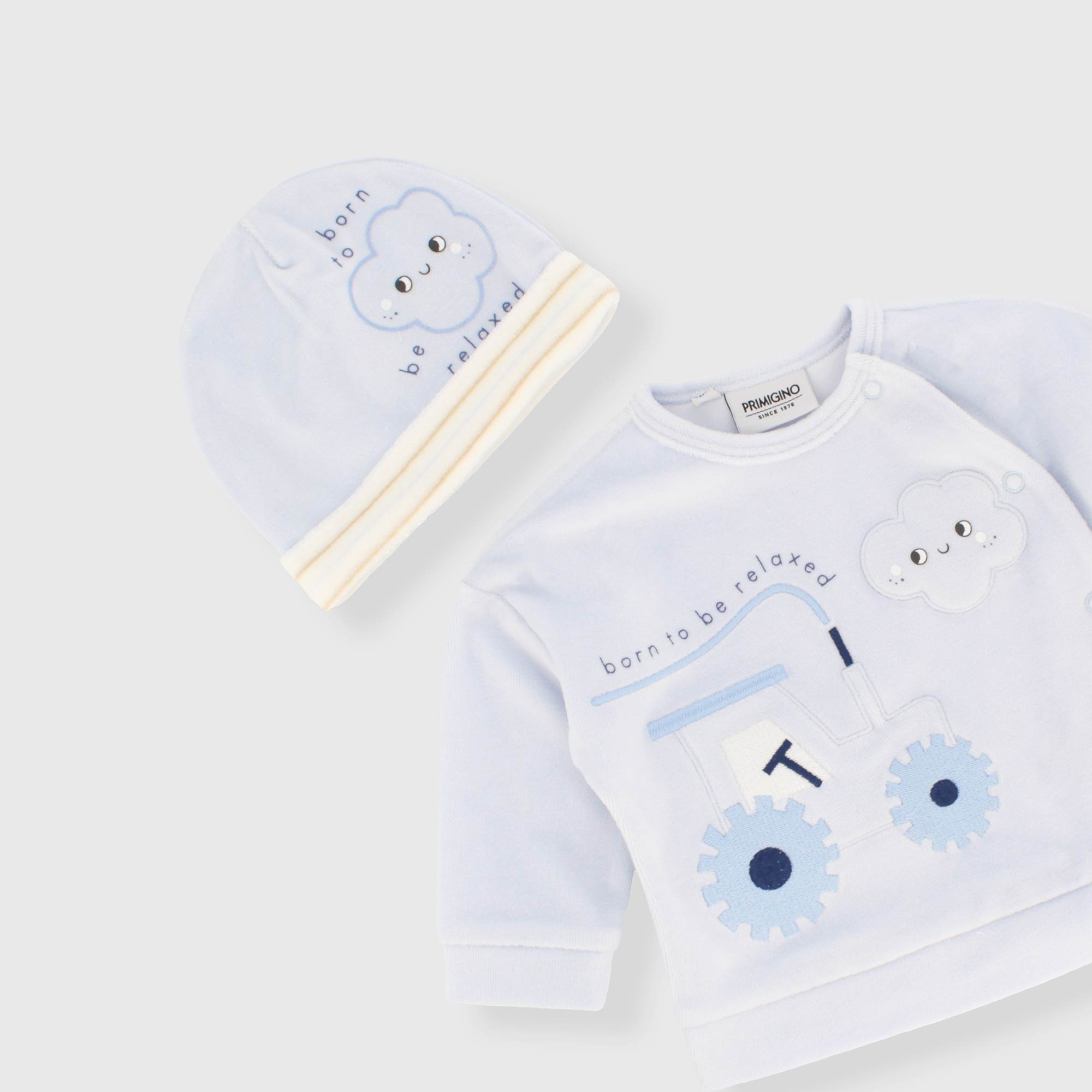 Completo composto da tre pezzi. Maglietta in ciniglia, a maniche lunghe. Chiusura a kimono con bottoni automatici. Ricami sul davanti. Ghettina in ciniglia, con righe tinto filo, vita elasticizzata e piedini. Cappello in ciniglia con piccola stampa.