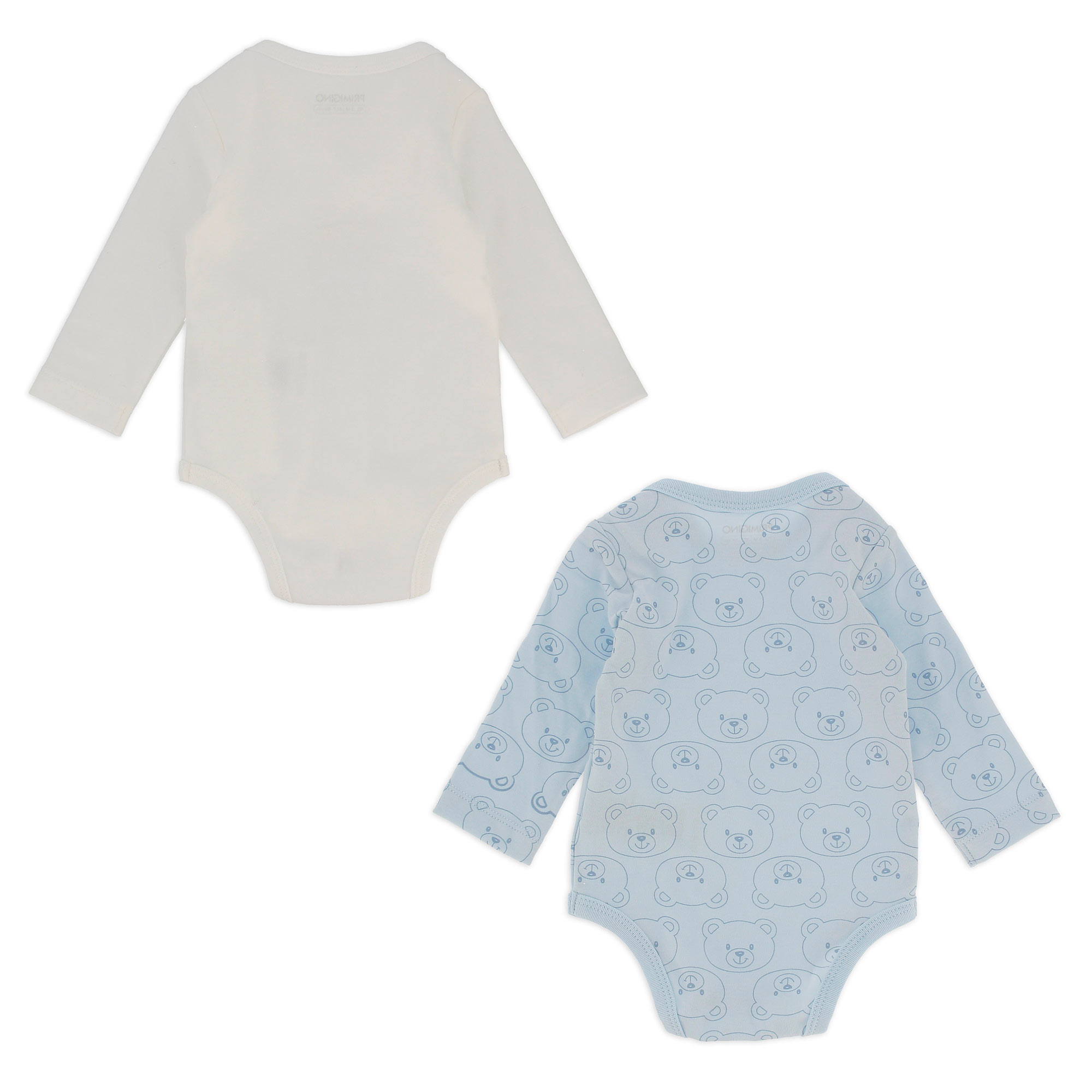Confezione da due body in jersey con collo rotondo, a maniche lunghe. Chiusura con bottoni automatici sulla parte inferiore. Un body con stampa all-over, e un body con stampa sul davanti.