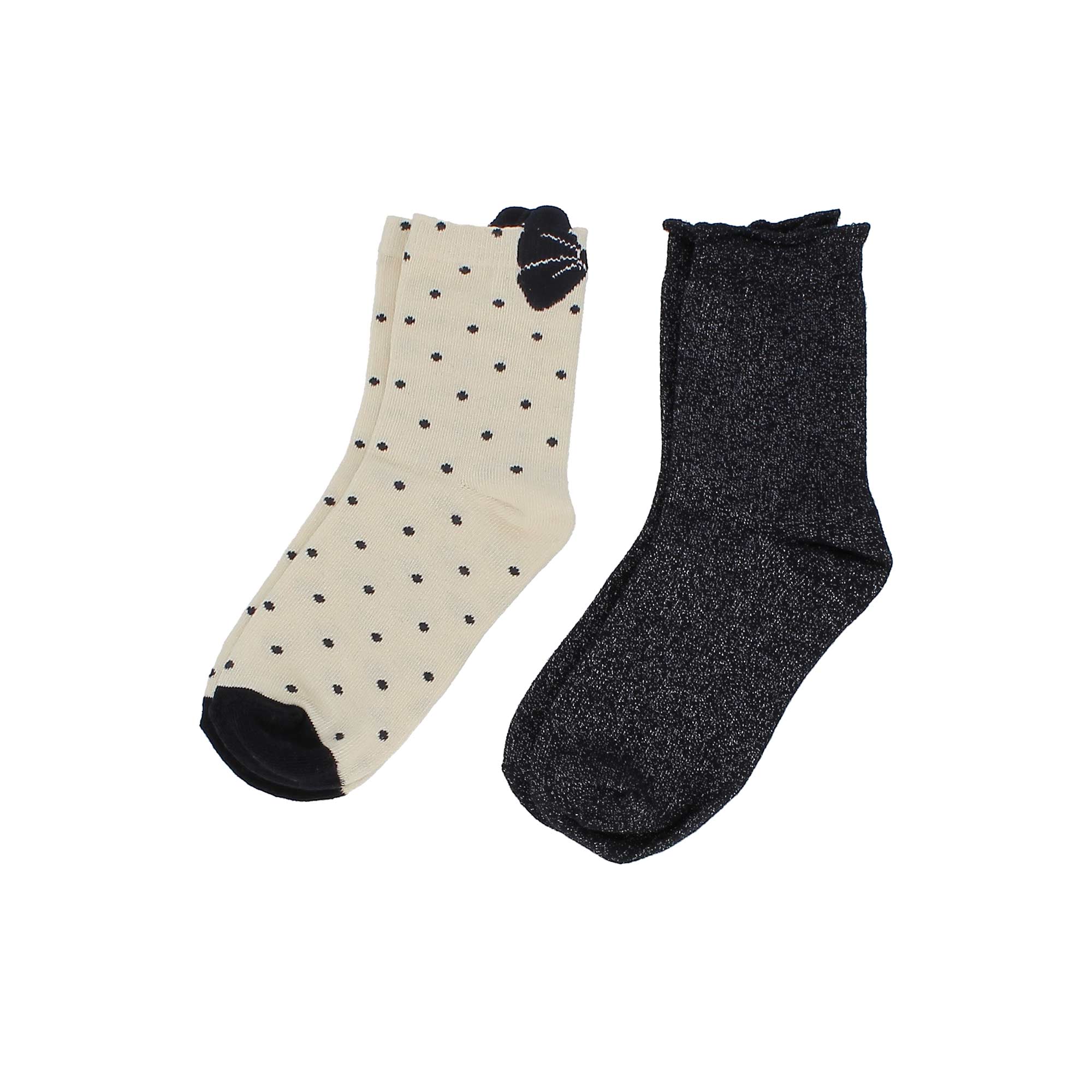 Confezione composta da due paia di calzini. Uno con motivo a pois e uno con filato lurex. Bordi elasticizzati.