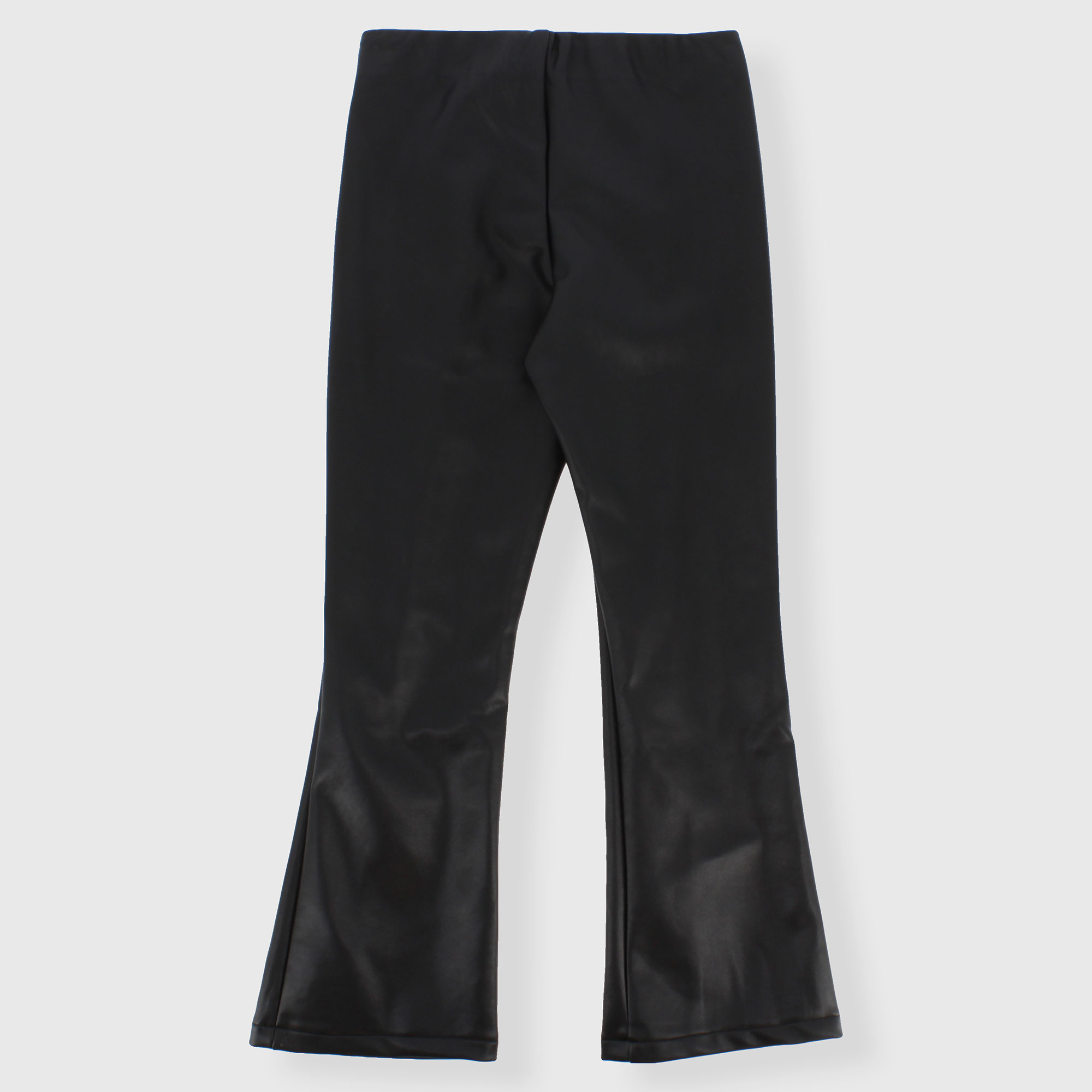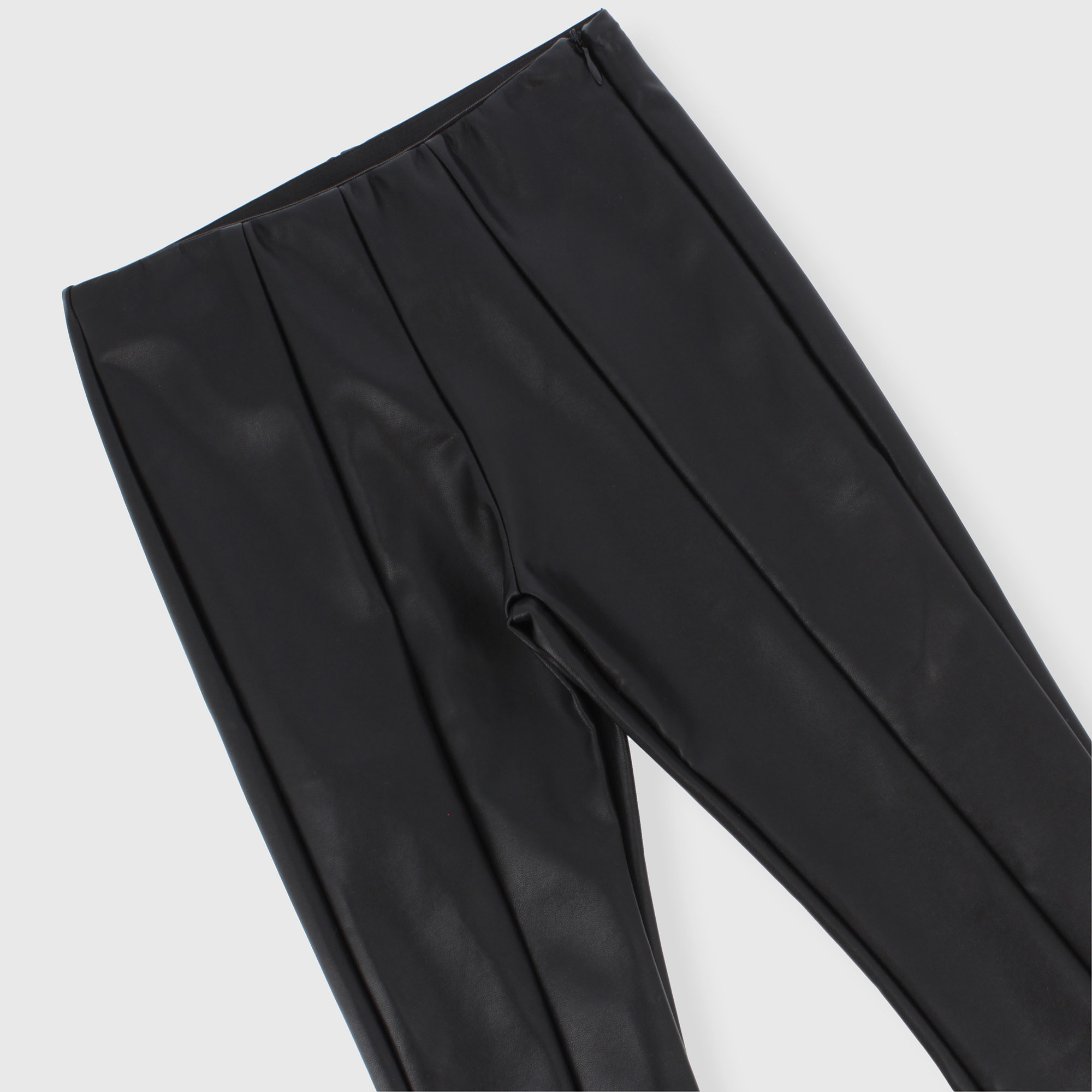 Pantalone bootcut in ecopelle con cucitura centrale. Chiusura con zip invisibile sul lato.