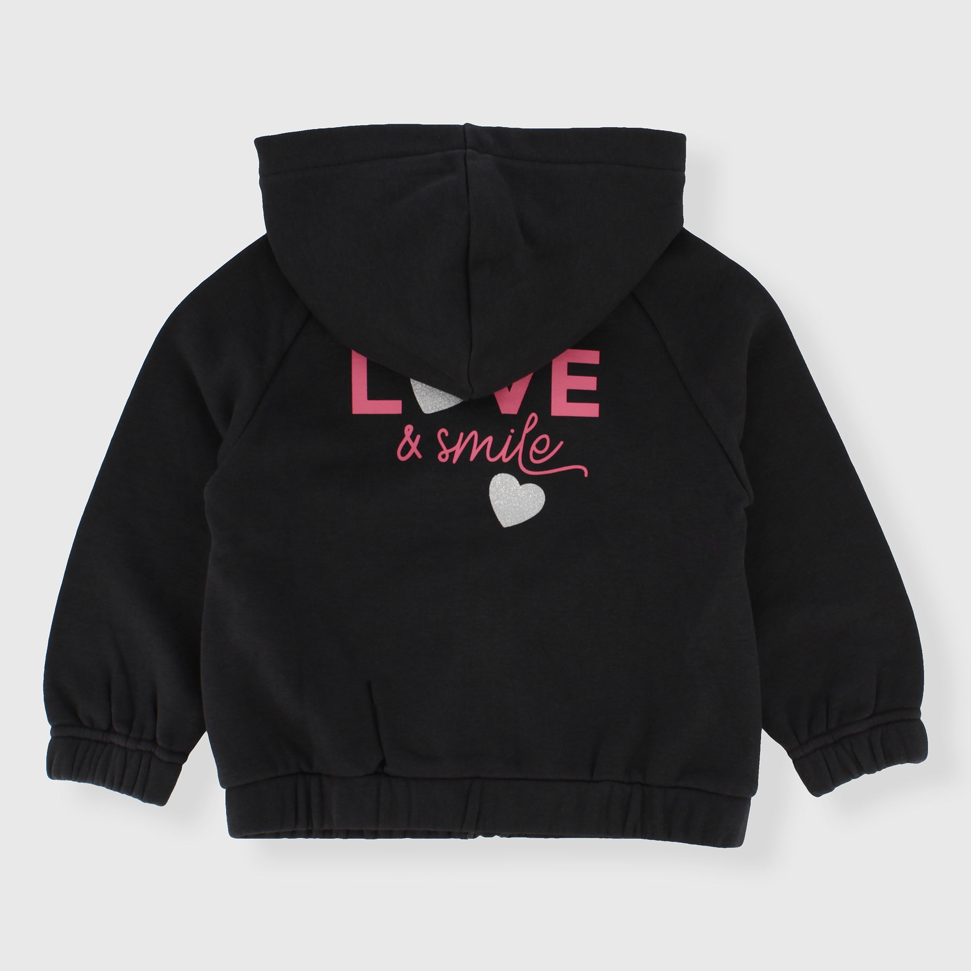 Felpa con cappuccio a maniche lunghe. Chiusura con zip sul davanti. Stampe con dettagli glitter sul fronte e sul retro. Polsini e fondo elasticati.