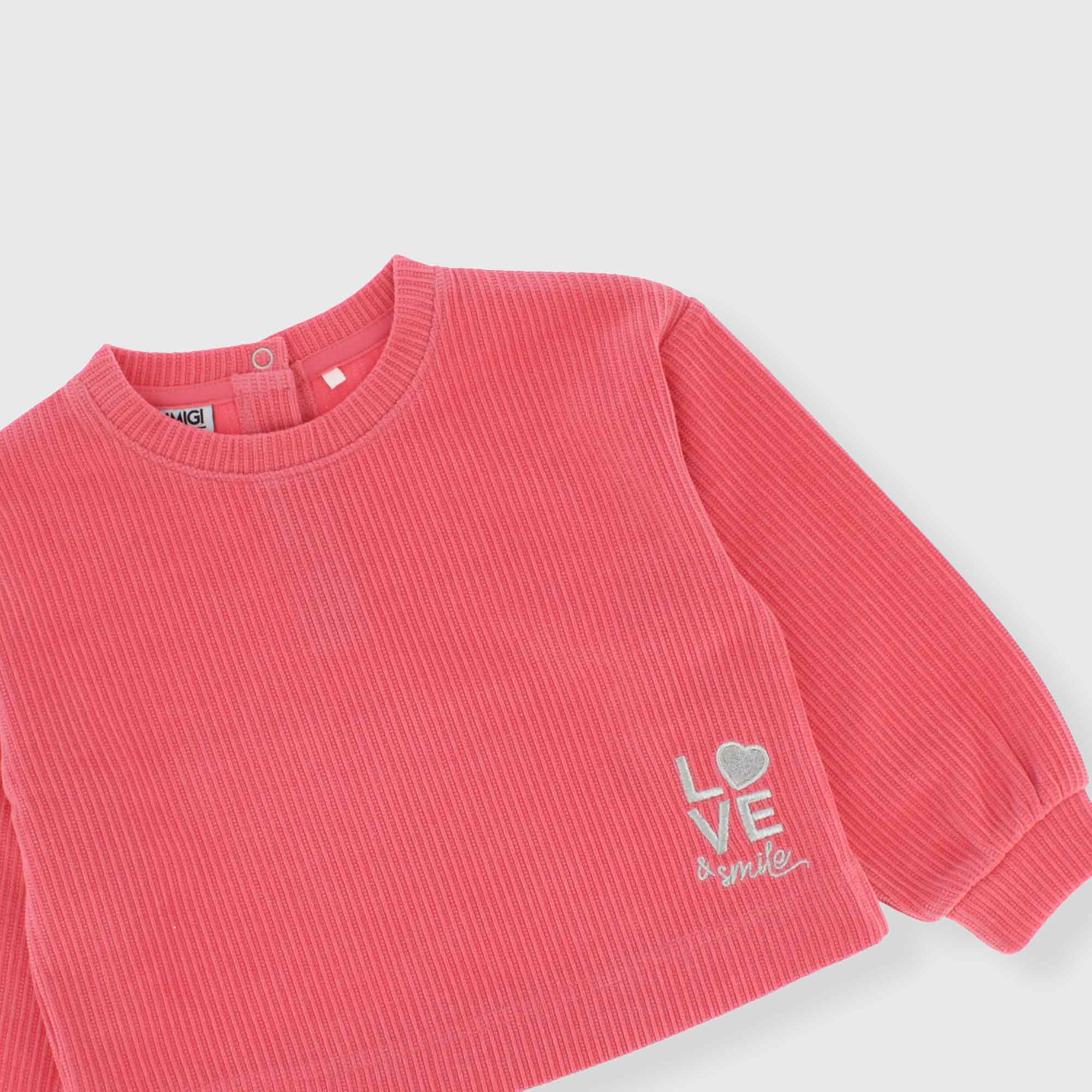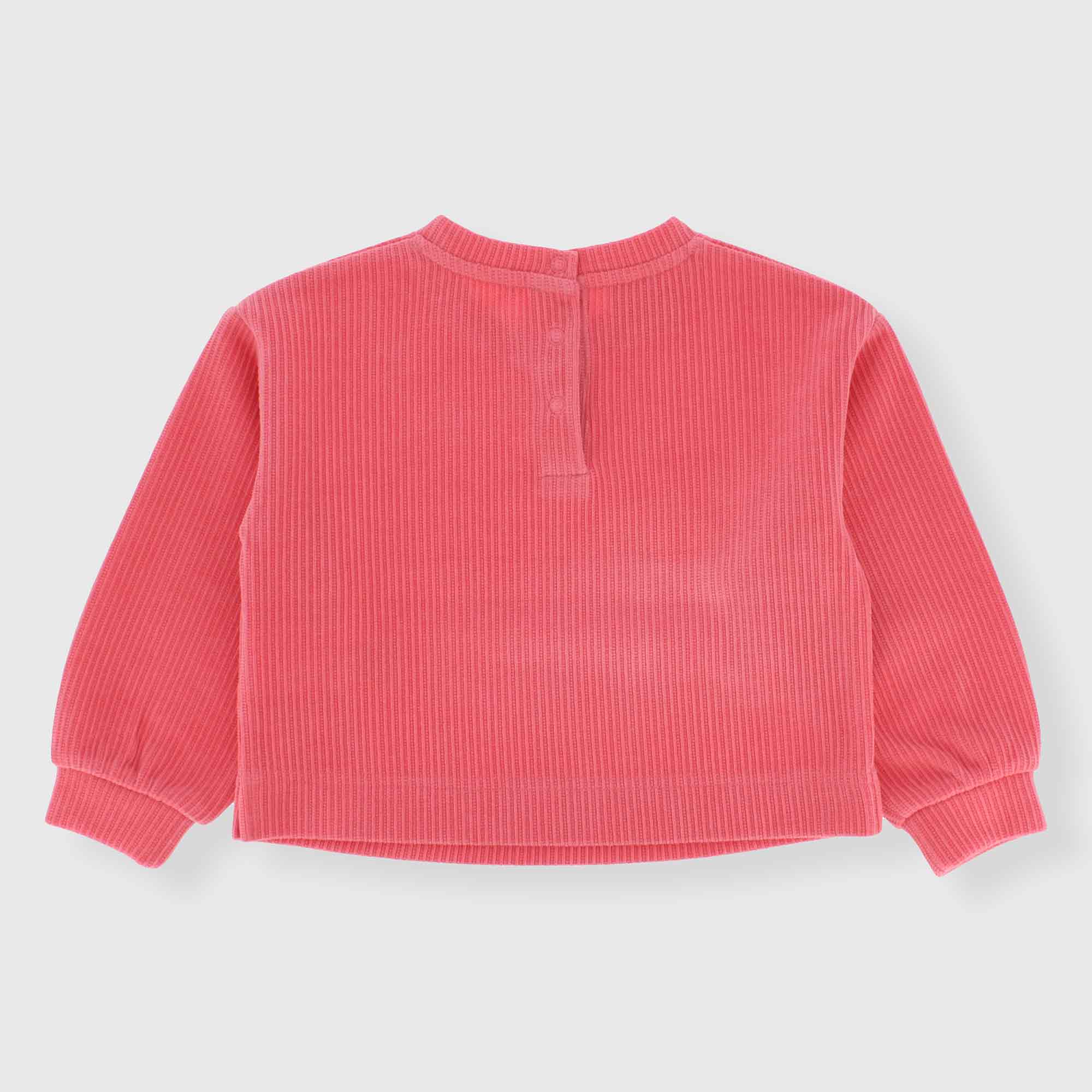 Felpa a coste, girocollo, con maniche lunghe. Chiusura con bottoncini automatici sul retro. Piccolo ricamo lurex sul davanti.