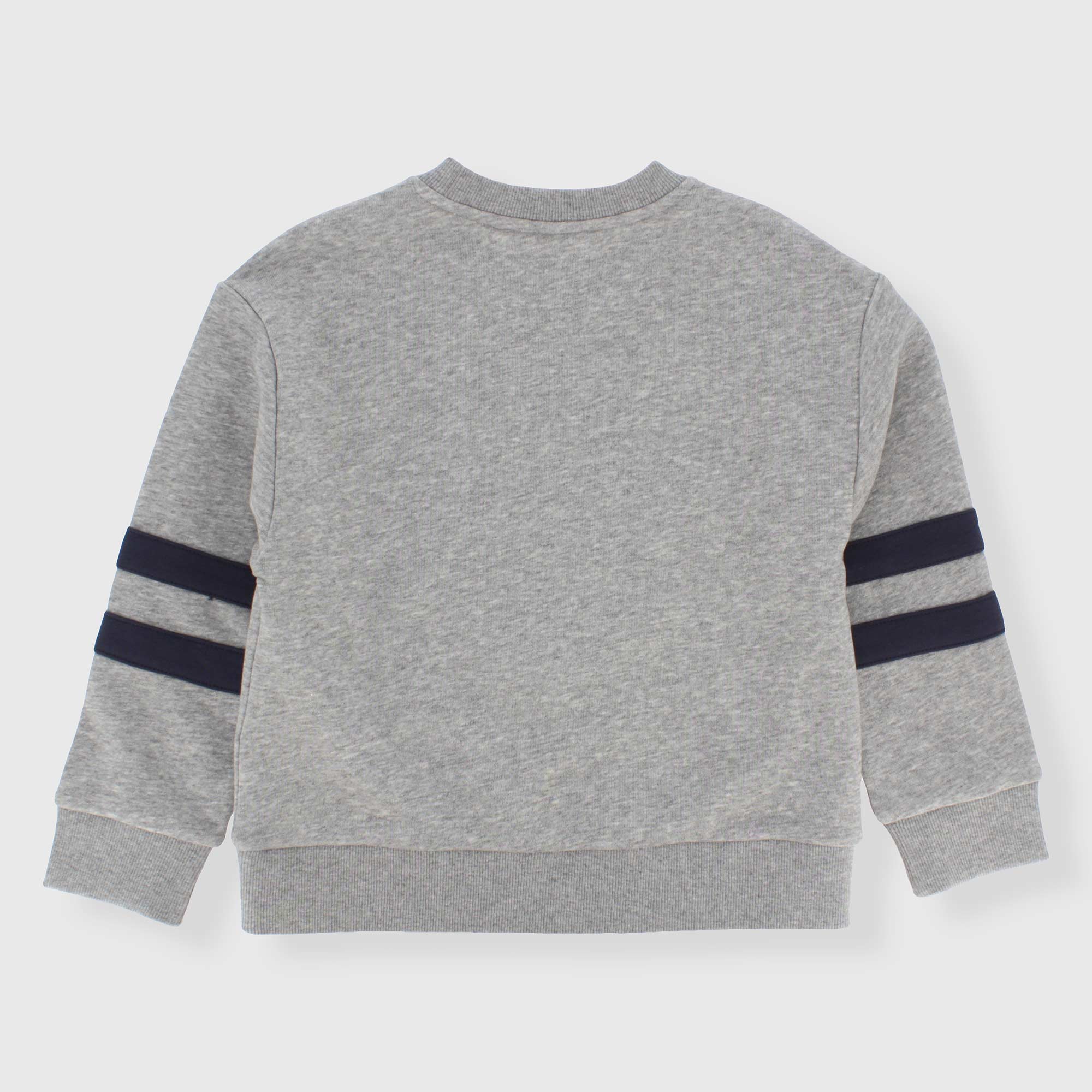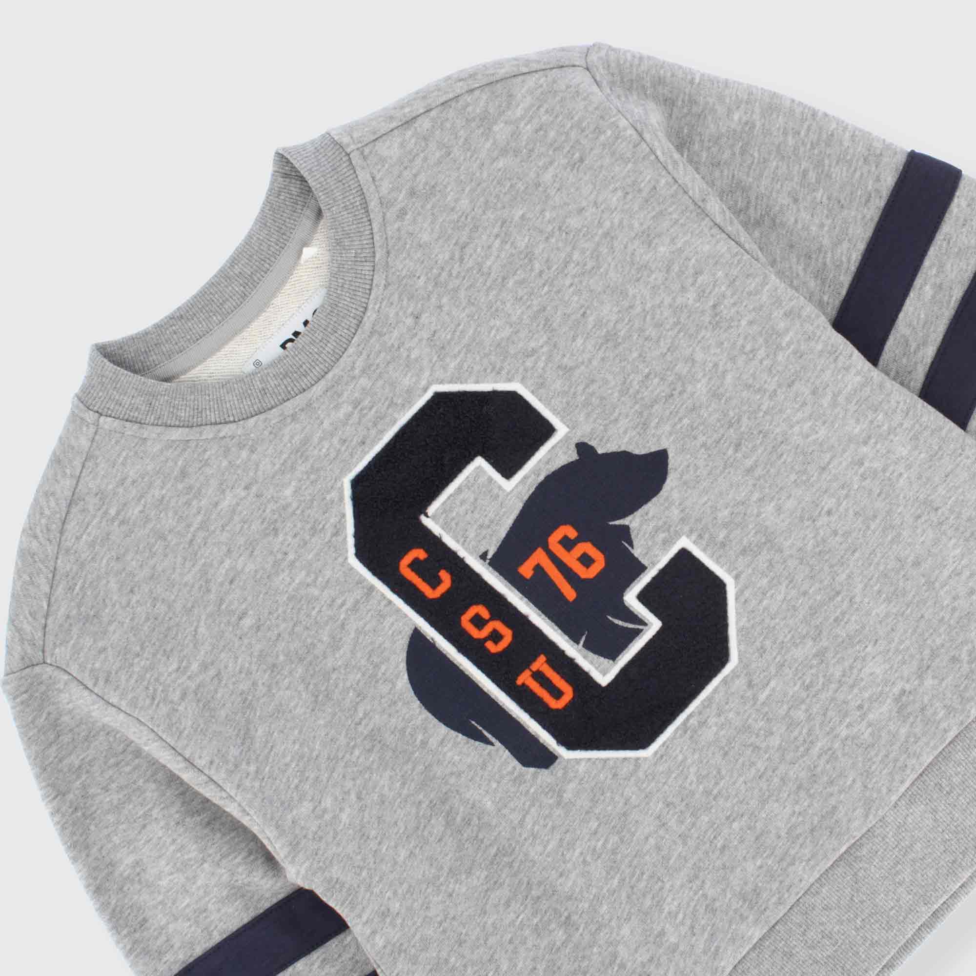 Felpa girocollo, a maniche lunghe. Patch e ricami sul davanti. Bande a contrasto applicate sulle maniche. Collo, polsini e fondo in costina.