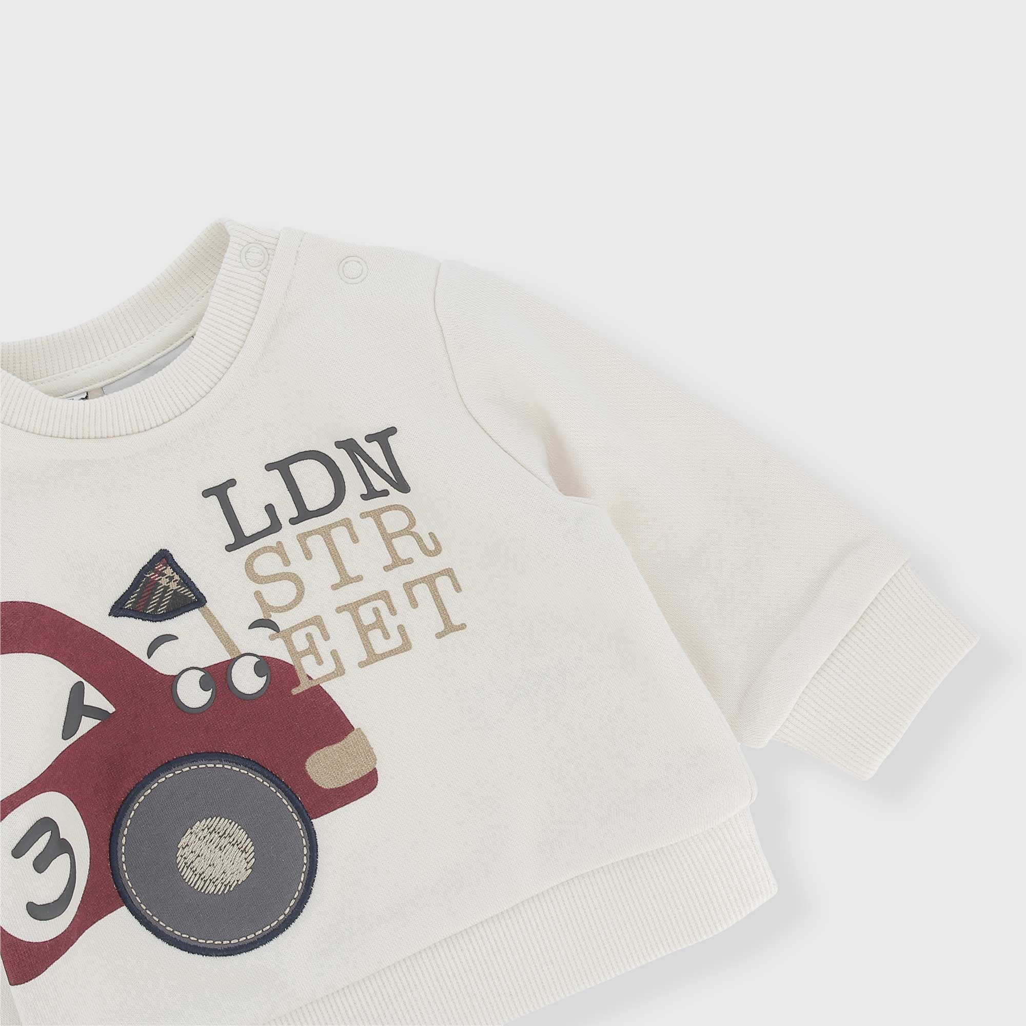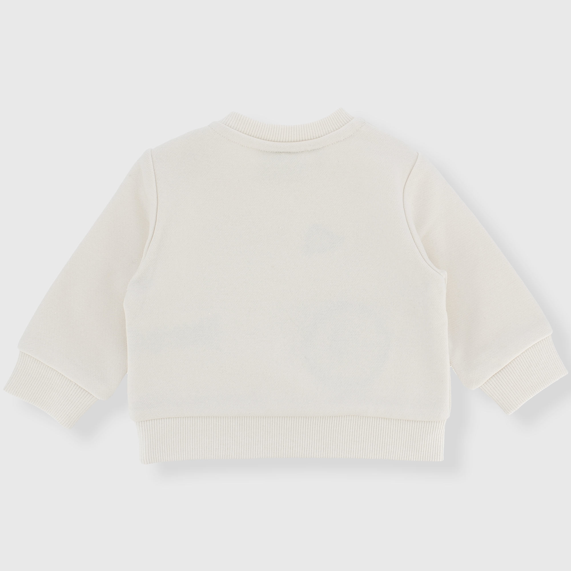 Felpa con morbido interno spazzolato, girocollo, a maniche lunghe. Chiusura con bottoncini automatici sulle spalle. Stampa e patch sul davanti. Collo, polsini e fondo in costina.