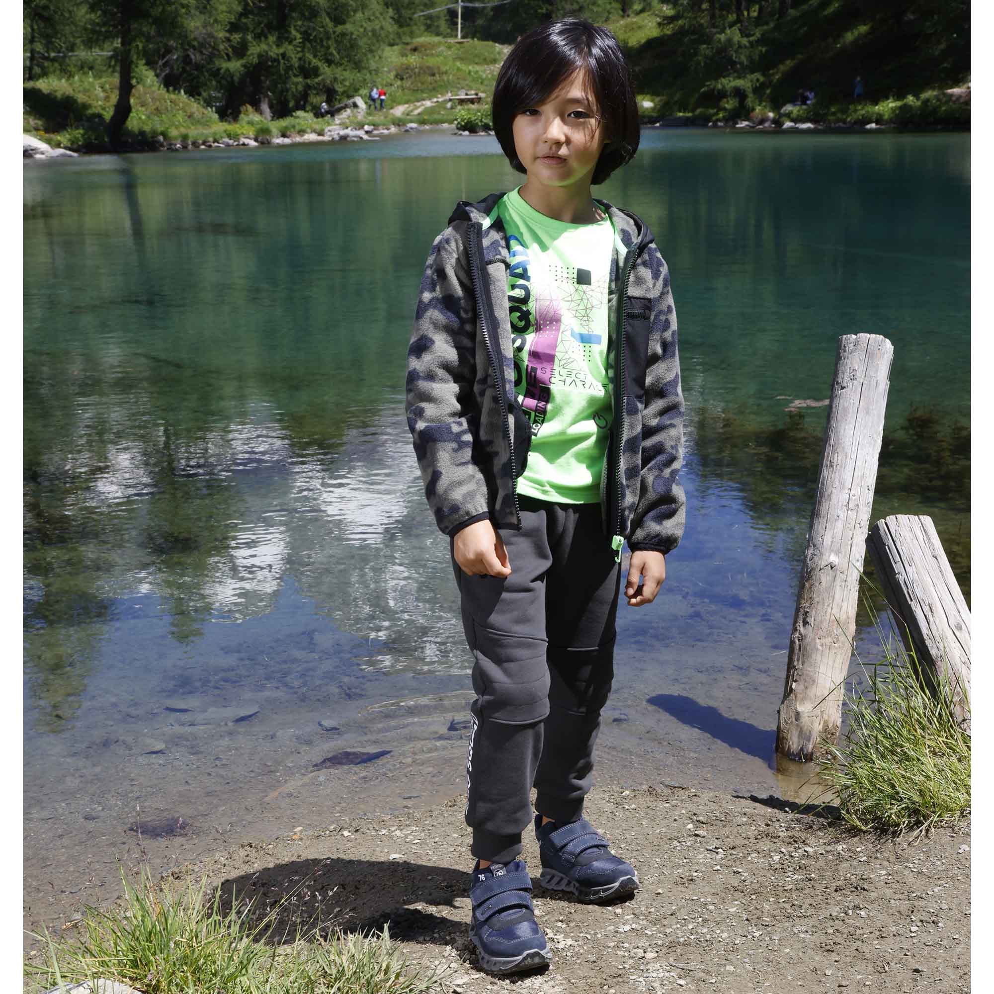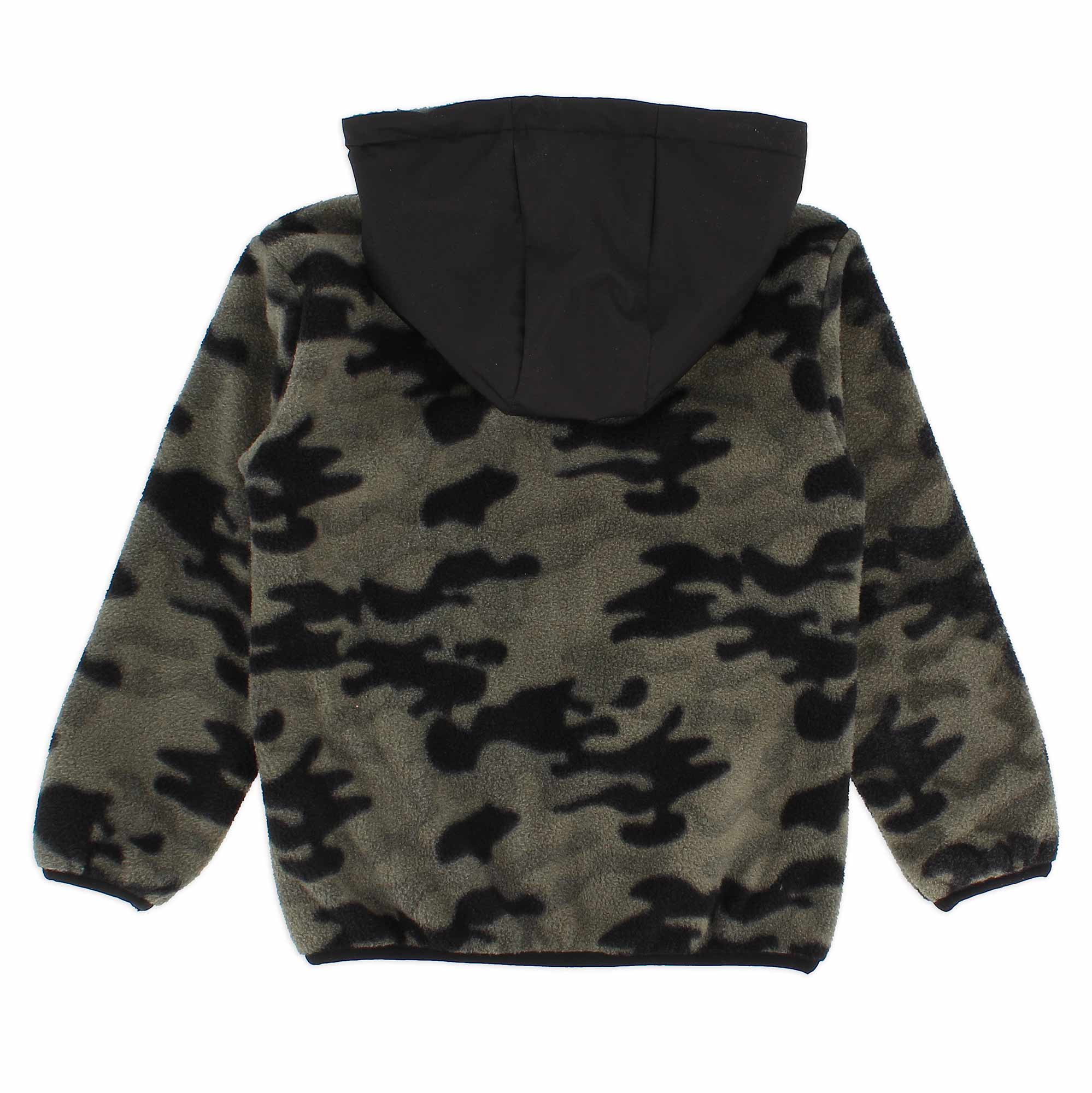 Felpa in pile stampato camouflage, con cappuccio rivestito in nylon, a maniche lunghe. Chiusura con zip sul davanti. Taschino sul davanti e tasche laterali con zip.