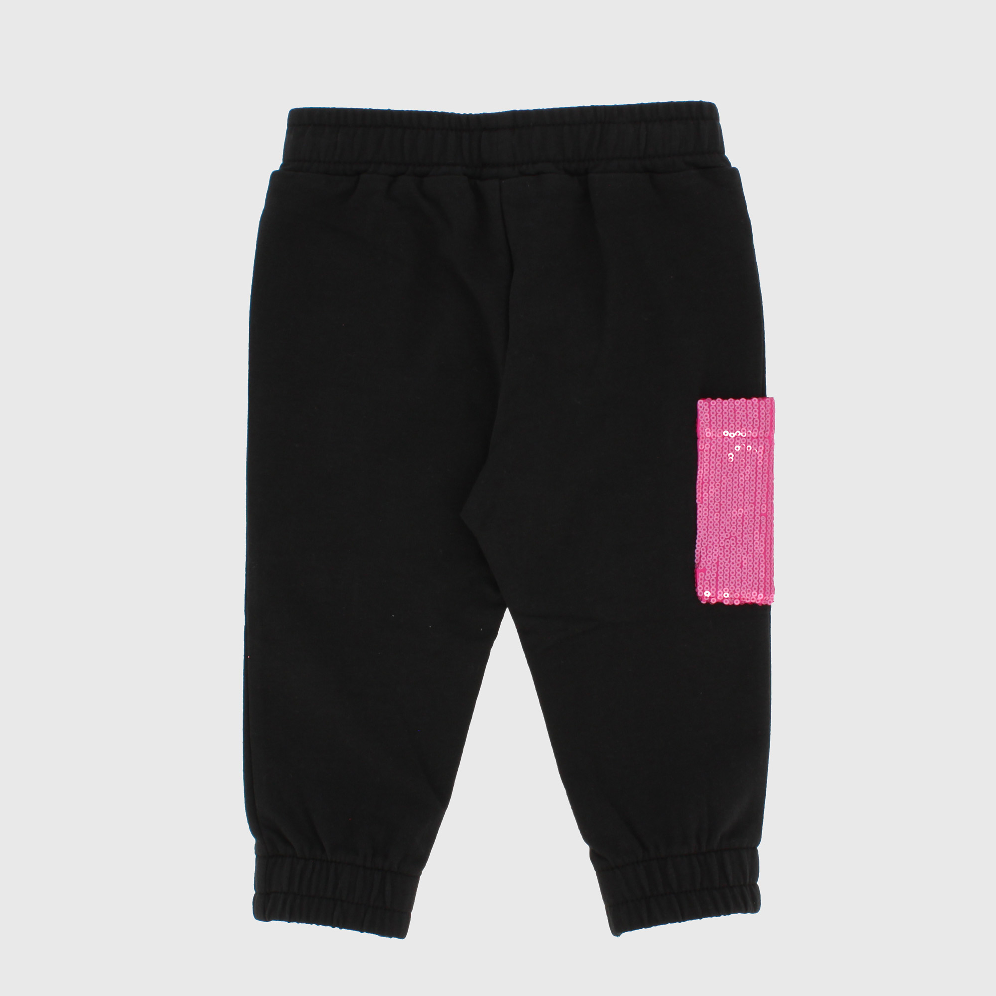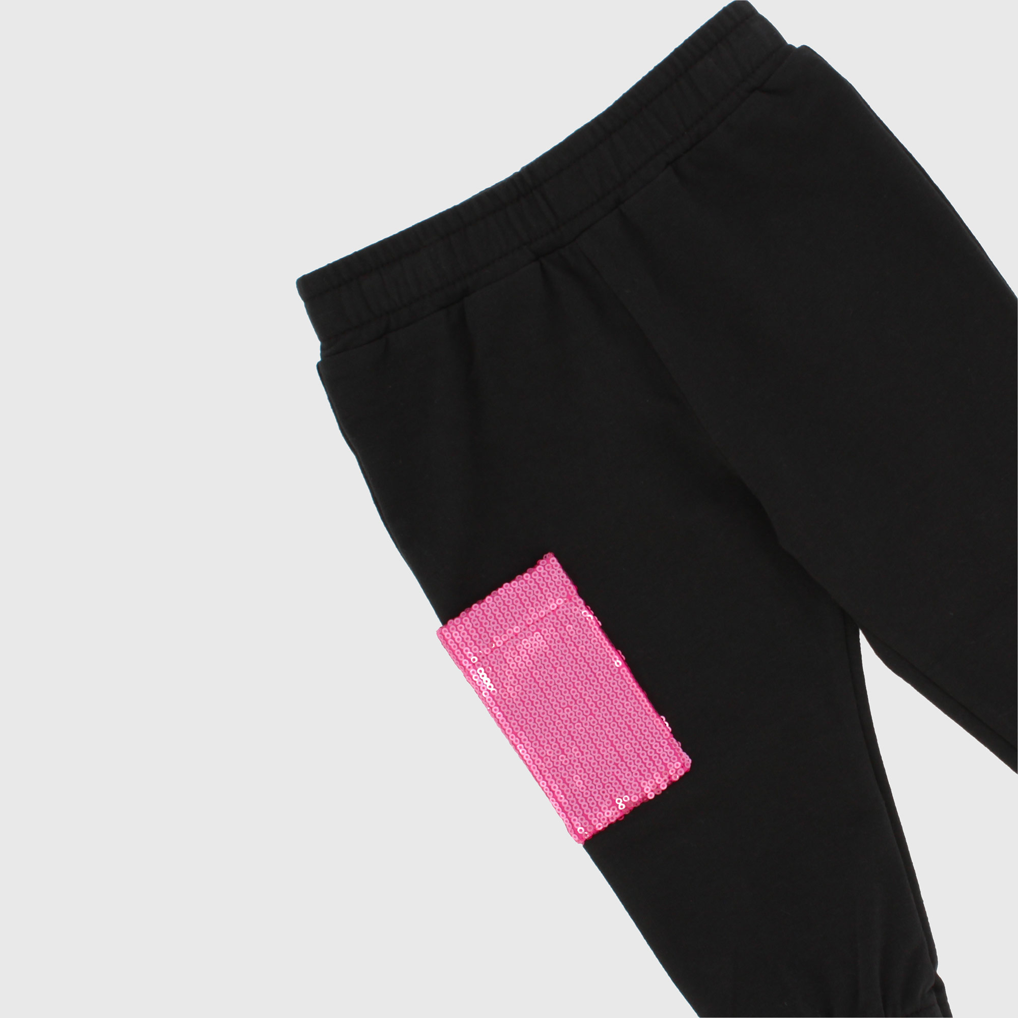 Jogger in felpa con vita elasticizzata. Tascona laterale in paillettes. Fondo con elastico.