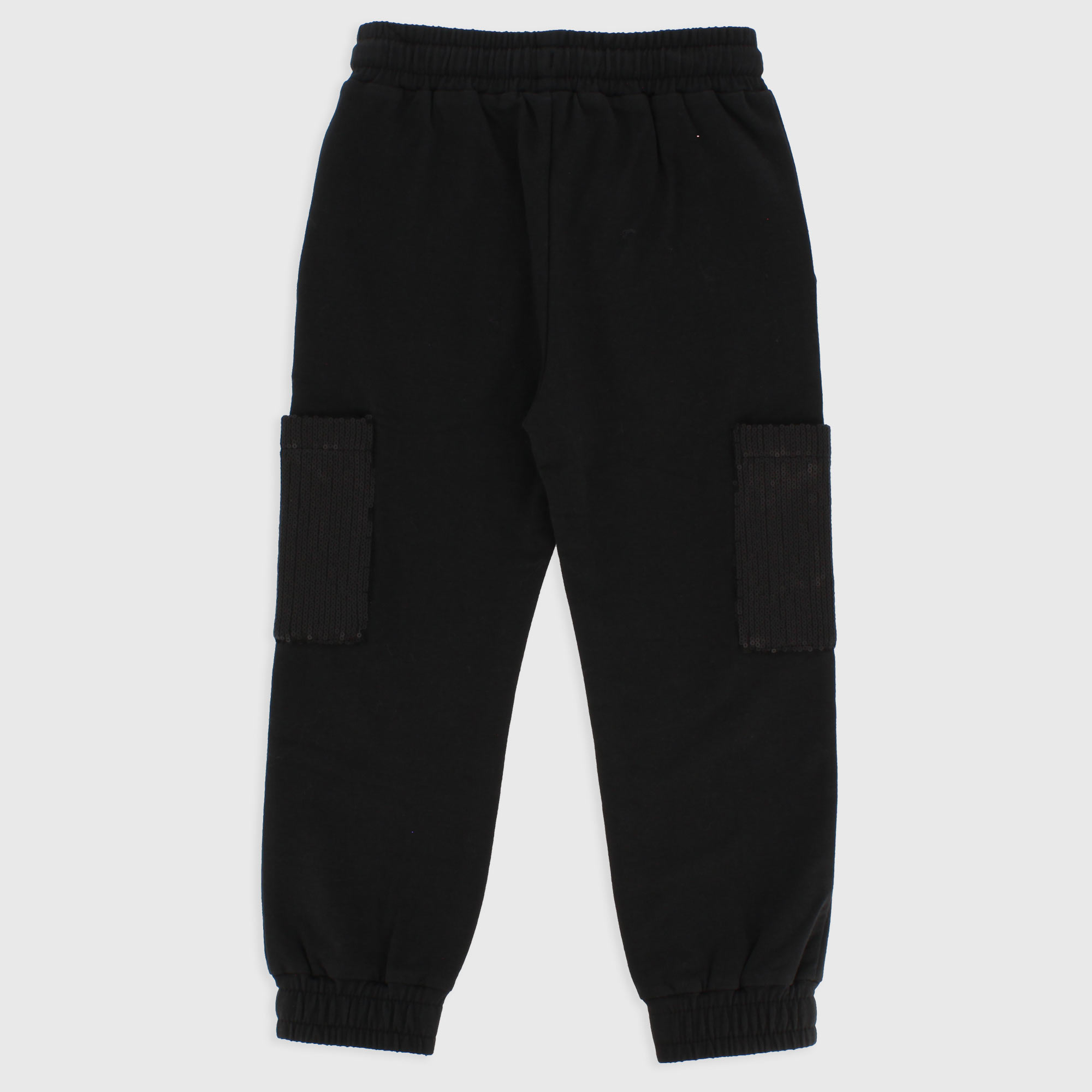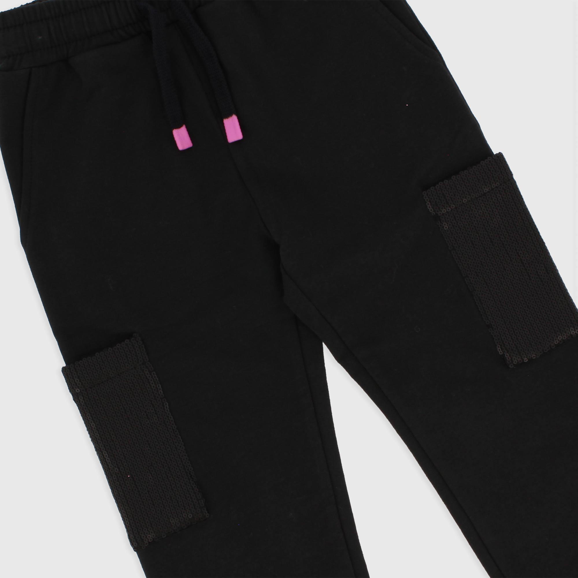 Jogger in felpa con vita elasticizzata e lacci sul davanti. Tasconi laterali in paillettes. Fondo con elastico.