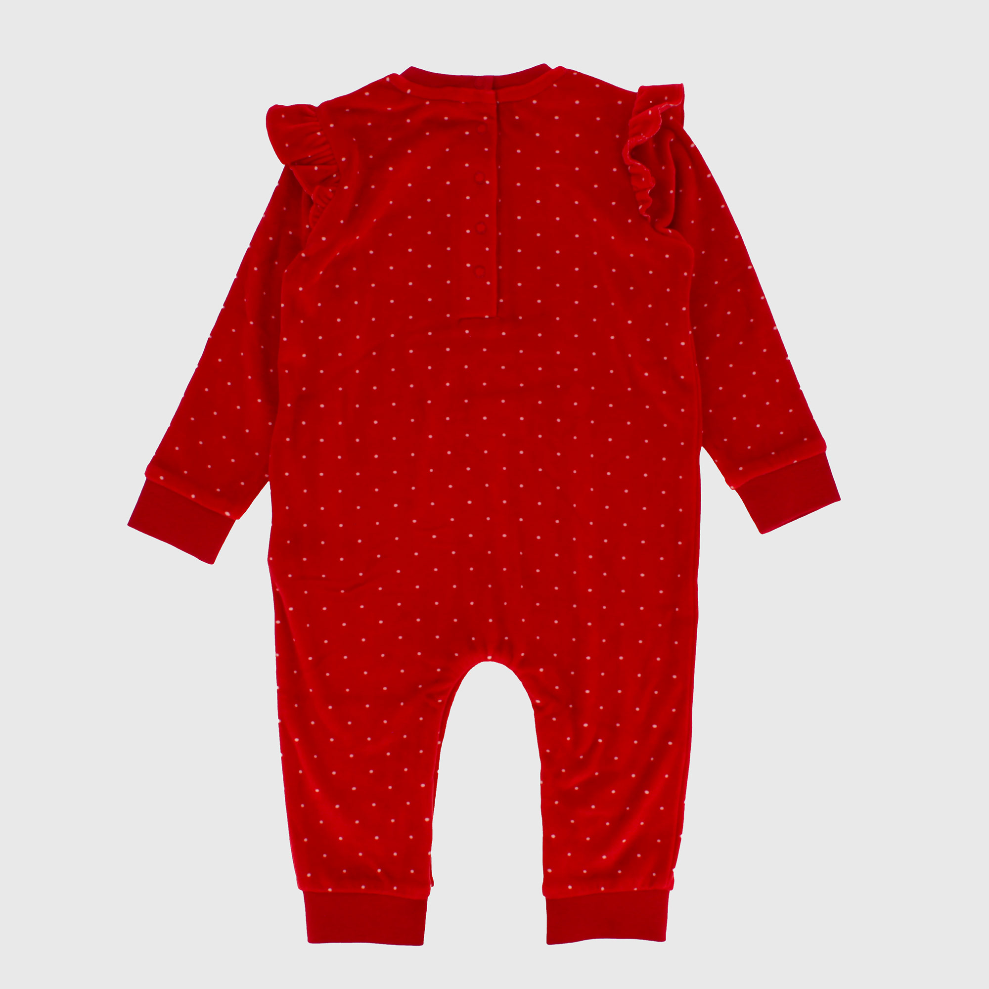 Pigiama a pois in pile girocollo, a maniche lunghe. Chiusura con bottoncini automatici sul retro e sul cavallo. Piccoli volants sulle maniche. Ricami a tema natalizio sul davanti.