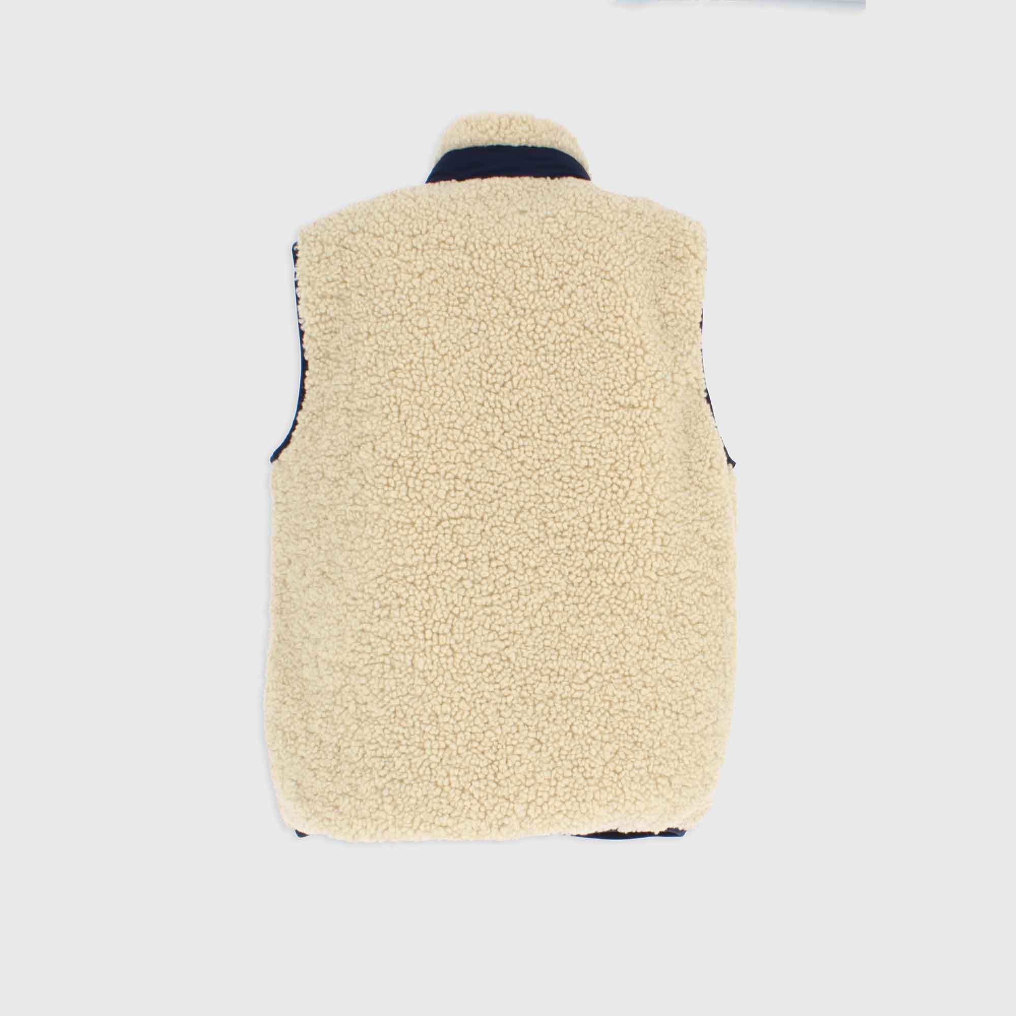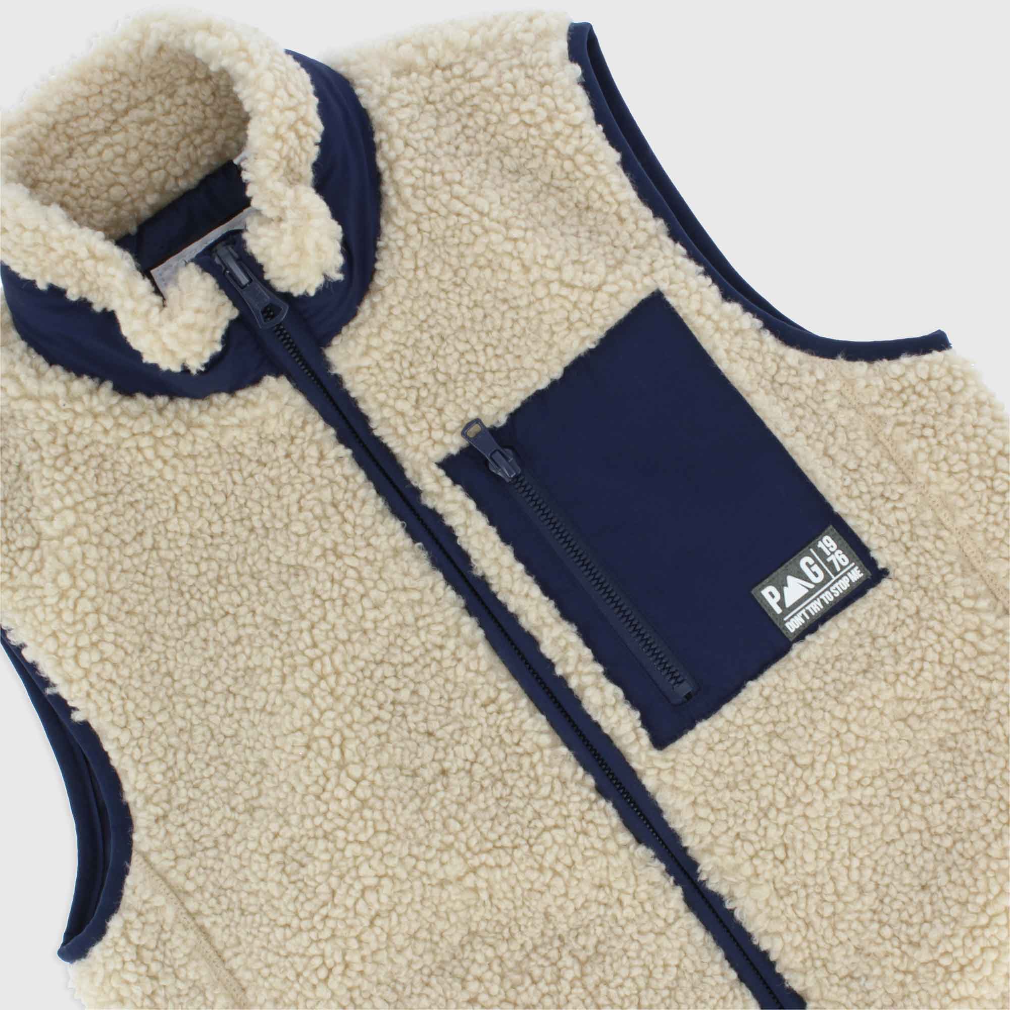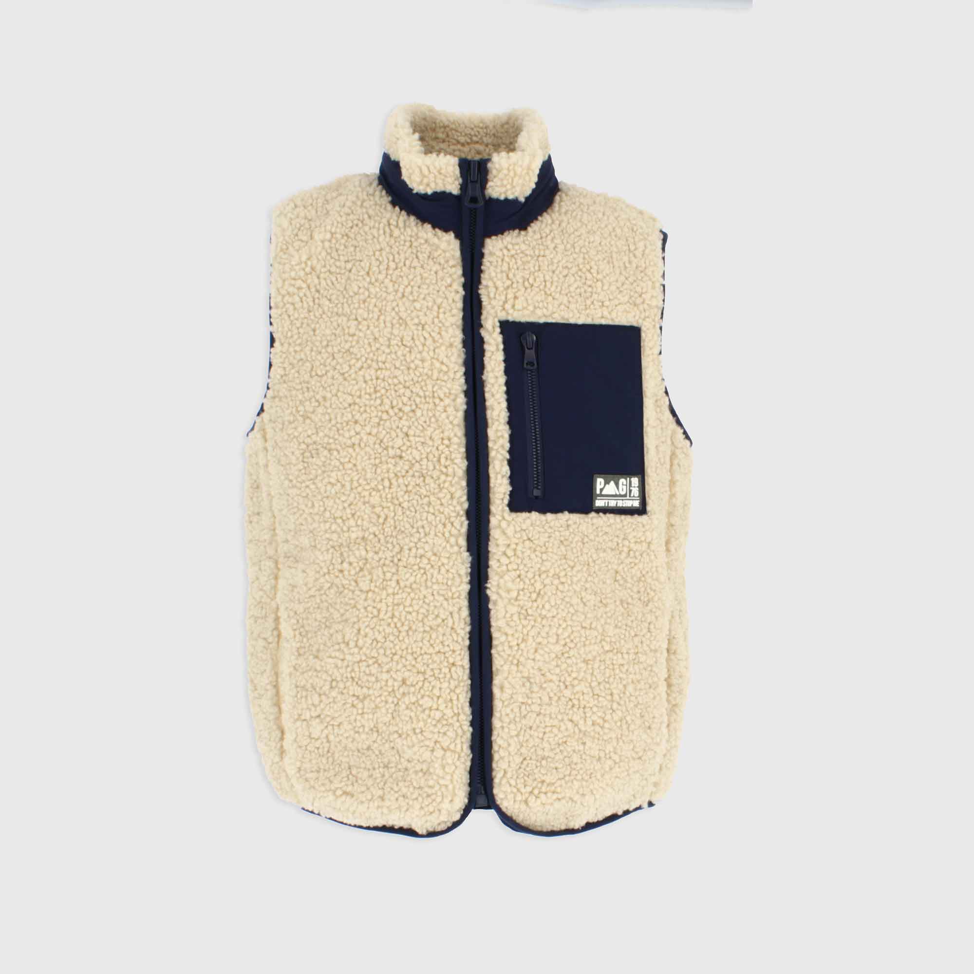 Gilet in pile effetto teddy. Chiusura con zip sul davanti. Tasca in nylon con zip. Profili a contrasto.