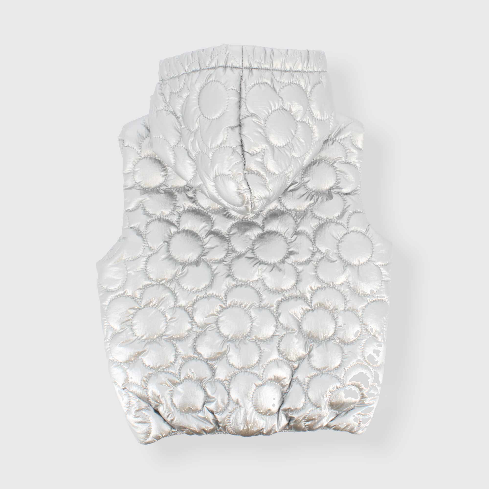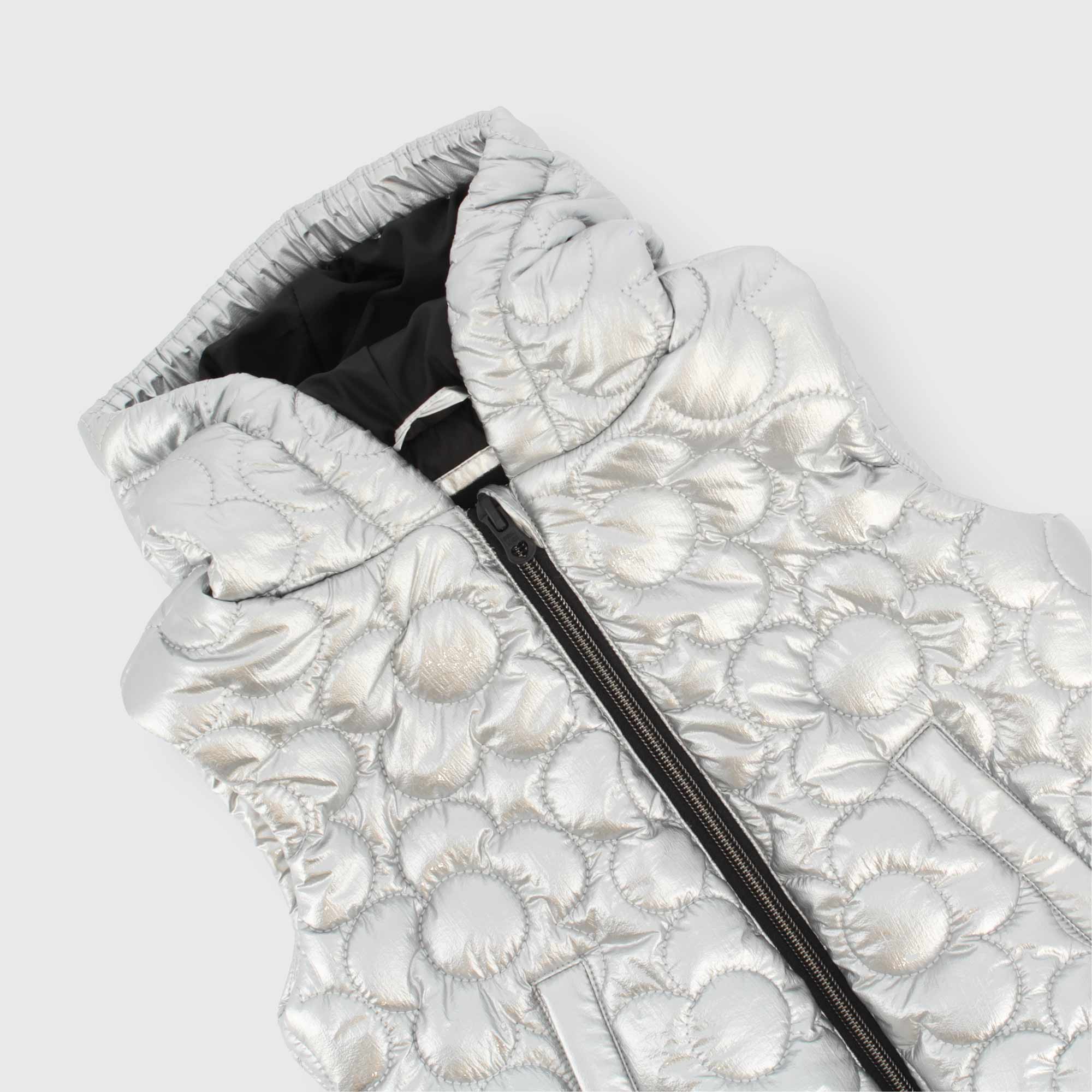 Gilet metallizzato trapuntato con cappuccio. Chiusura con zip sul davanti. Tasche a filetto.