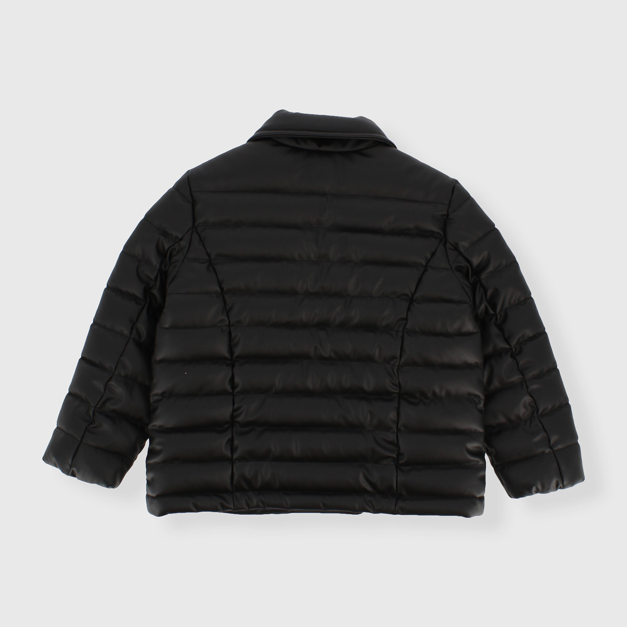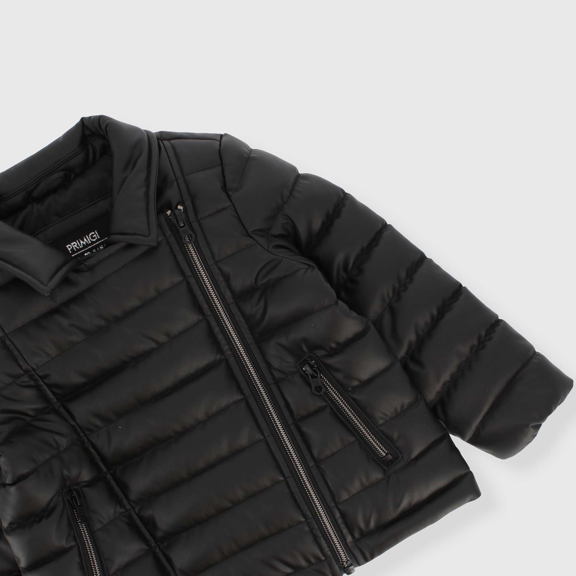 Giubbino imbottito modello chiodo in ecopelle a maniche lunghe. Chiusura con zip sul davanti. Taschine laterali con zip.