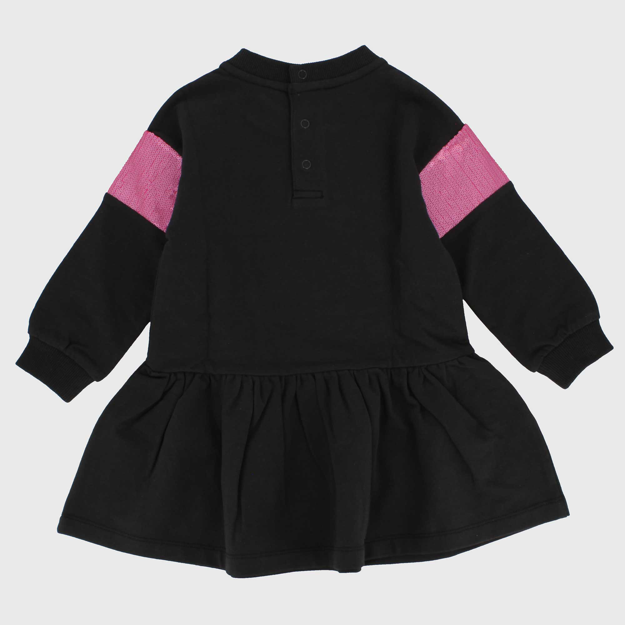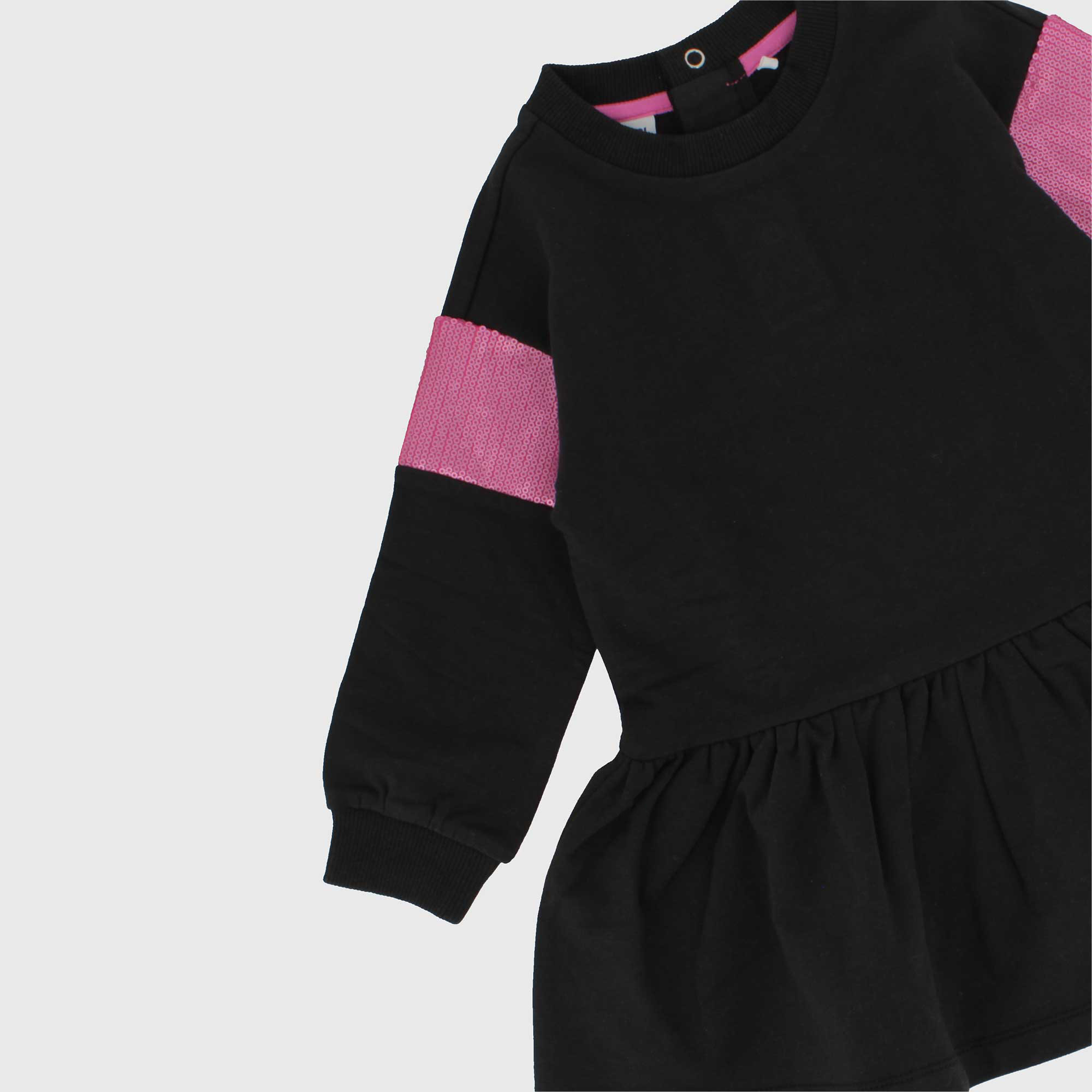 Vestito in felpa girocollo, a maniche lunghe. Chiusura sul retro con bottoncini automatici. Inserti in paillettes sulle maniche. Polsini in costina.