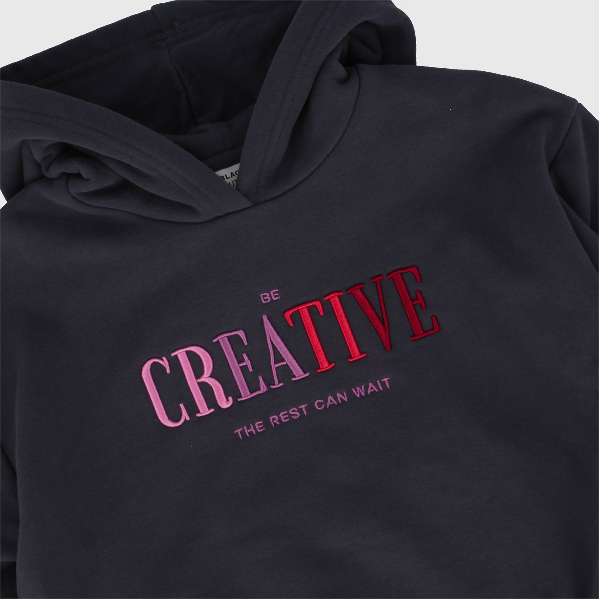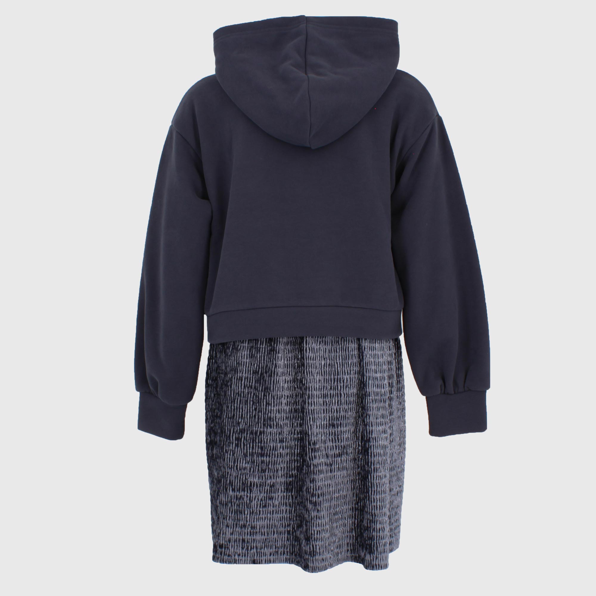 Vestito in felpa con cappuccio, con maniche lunghe a palloncino. Scritta ricamata sul davanti. Balza sul fondo in tessuto plissettato.