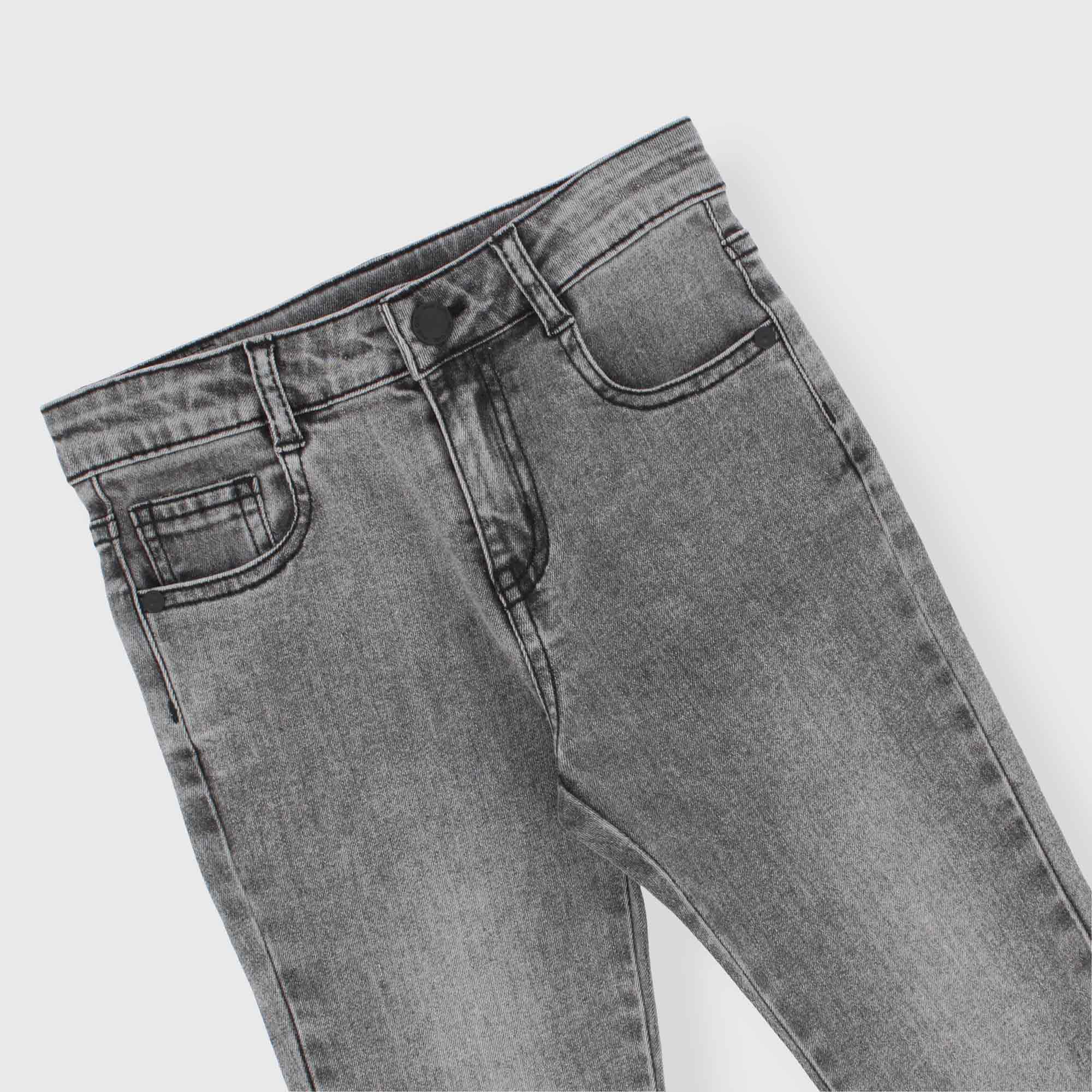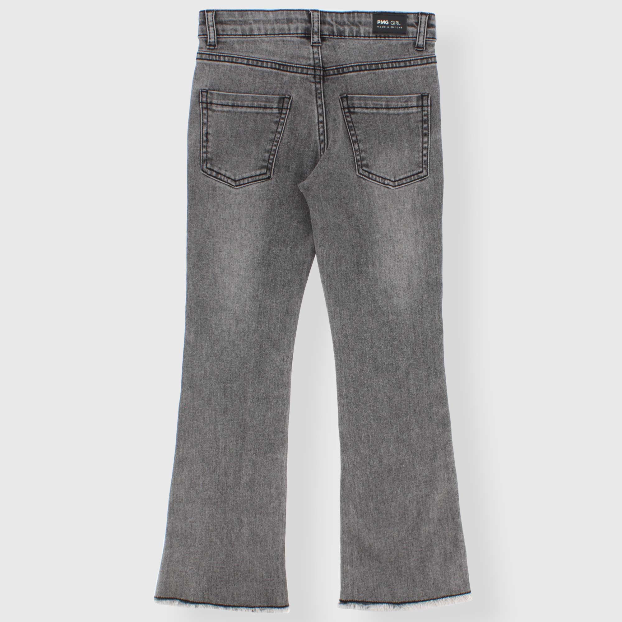 Pantalone bootcut in jeans con vita regolabile all'interno. Chiusura con gancio e zip. Cinque tasche. Orlo sfrangiato.
