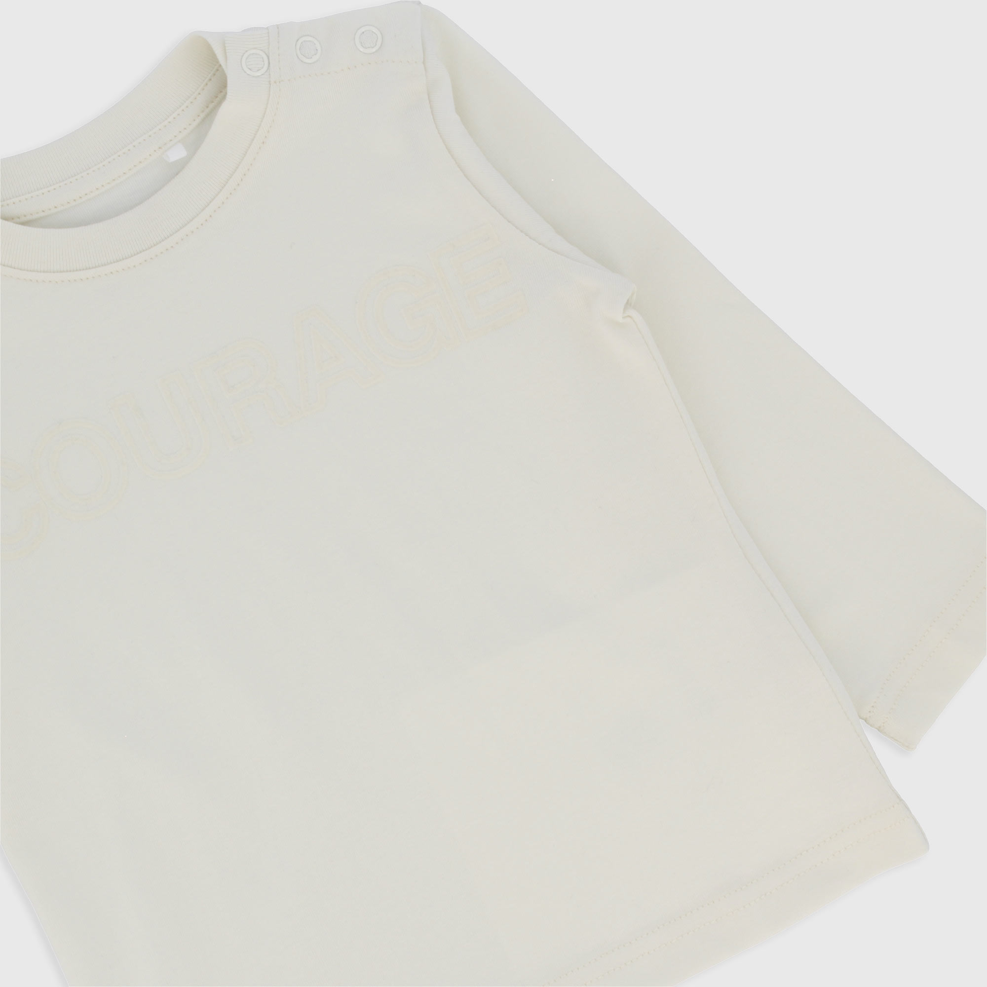 Maglietta regular fit in jersey, girocollo, a maniche lunghe. Chiusura con bottoni automatici sulla spalla. Stampa flock sul davanti. Collo in costina.