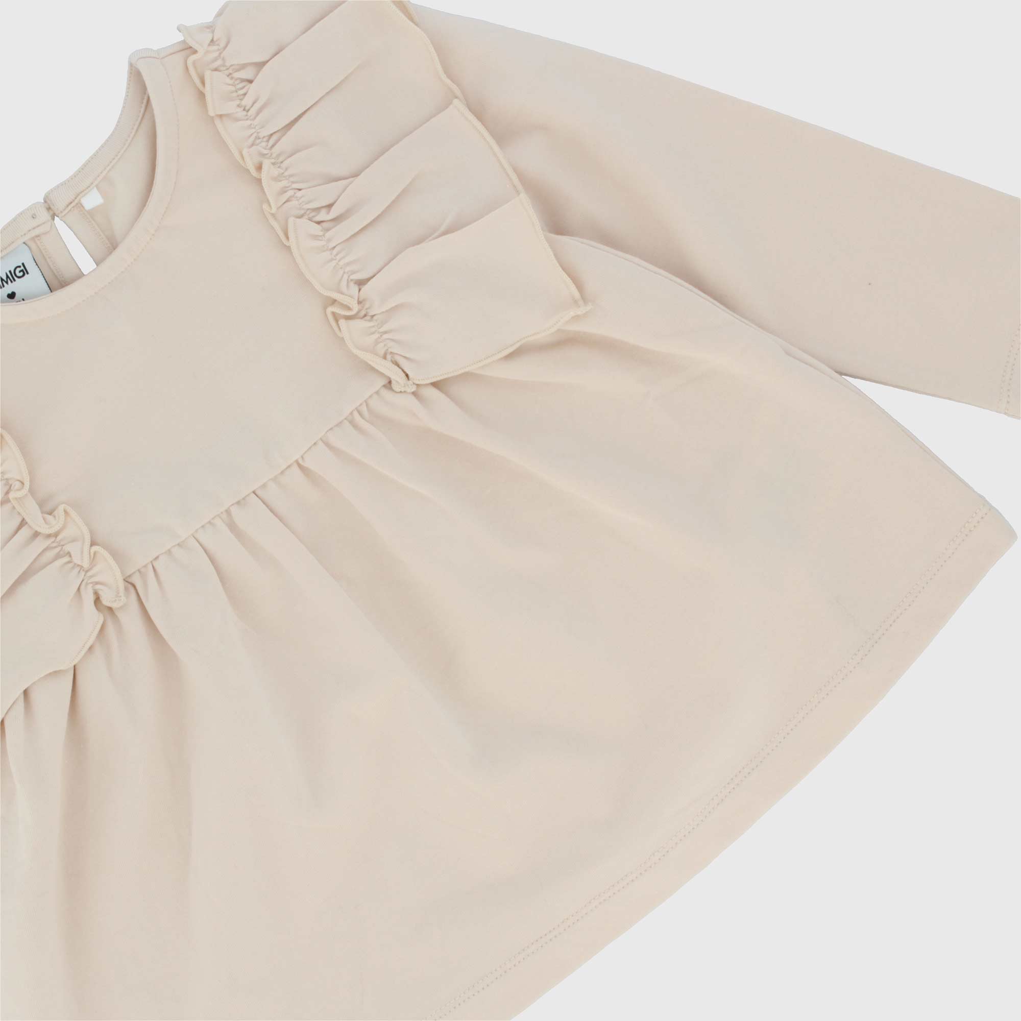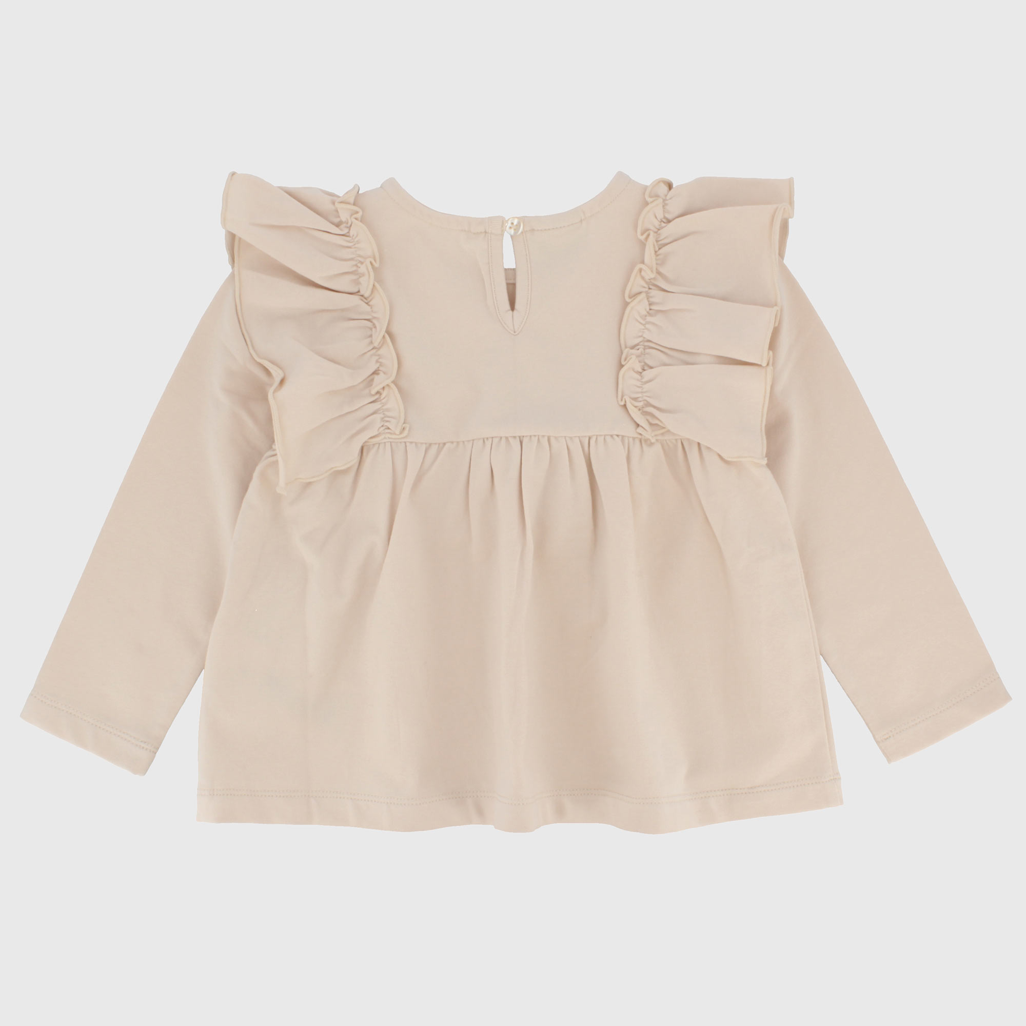Maglietta in jersey elasticizzato, girocollo, a maniche lunghe. Chiusura a goccia con bottone sul retro. Applicazioni di volants.