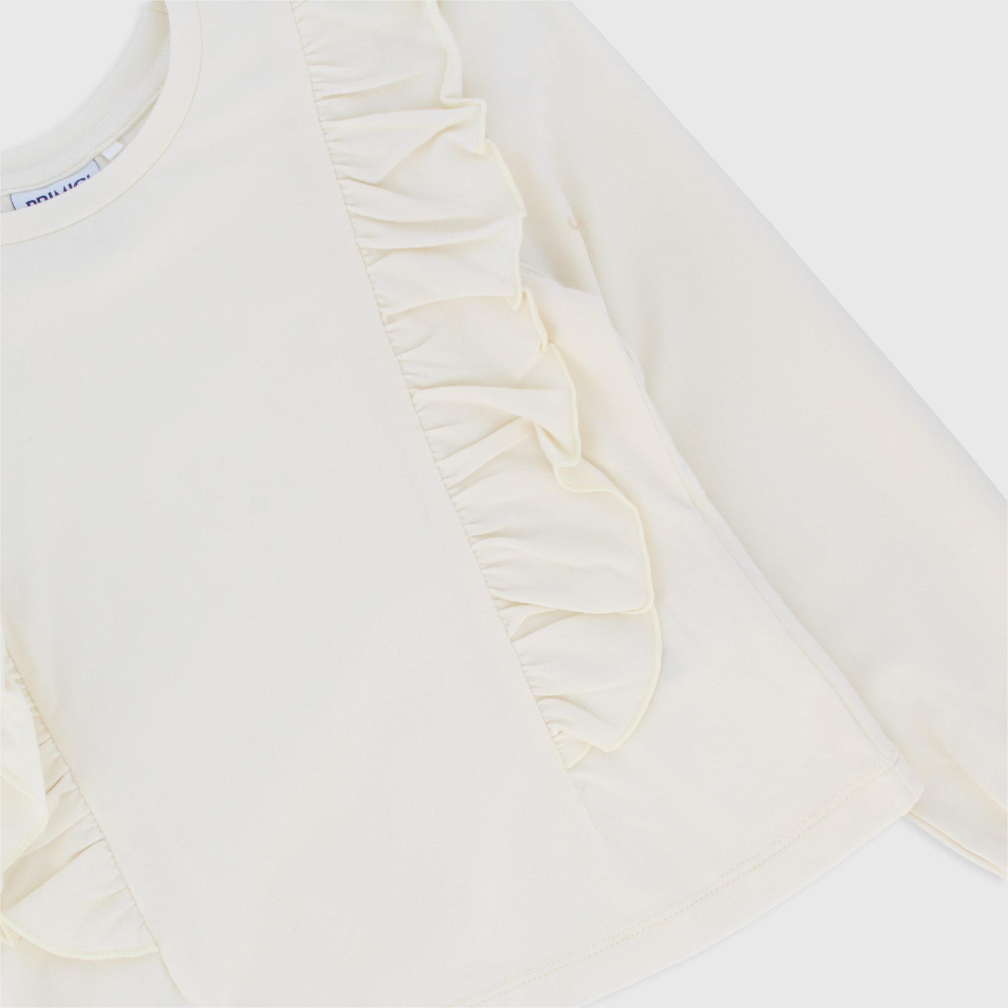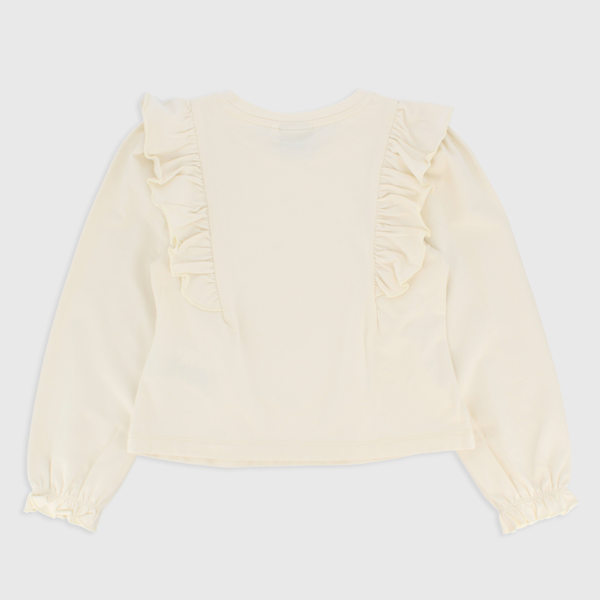 Maglietta in jersey elasticizzato, girocollo, a maniche lunghe. Applicazioni di volants. Polsini arricciati.