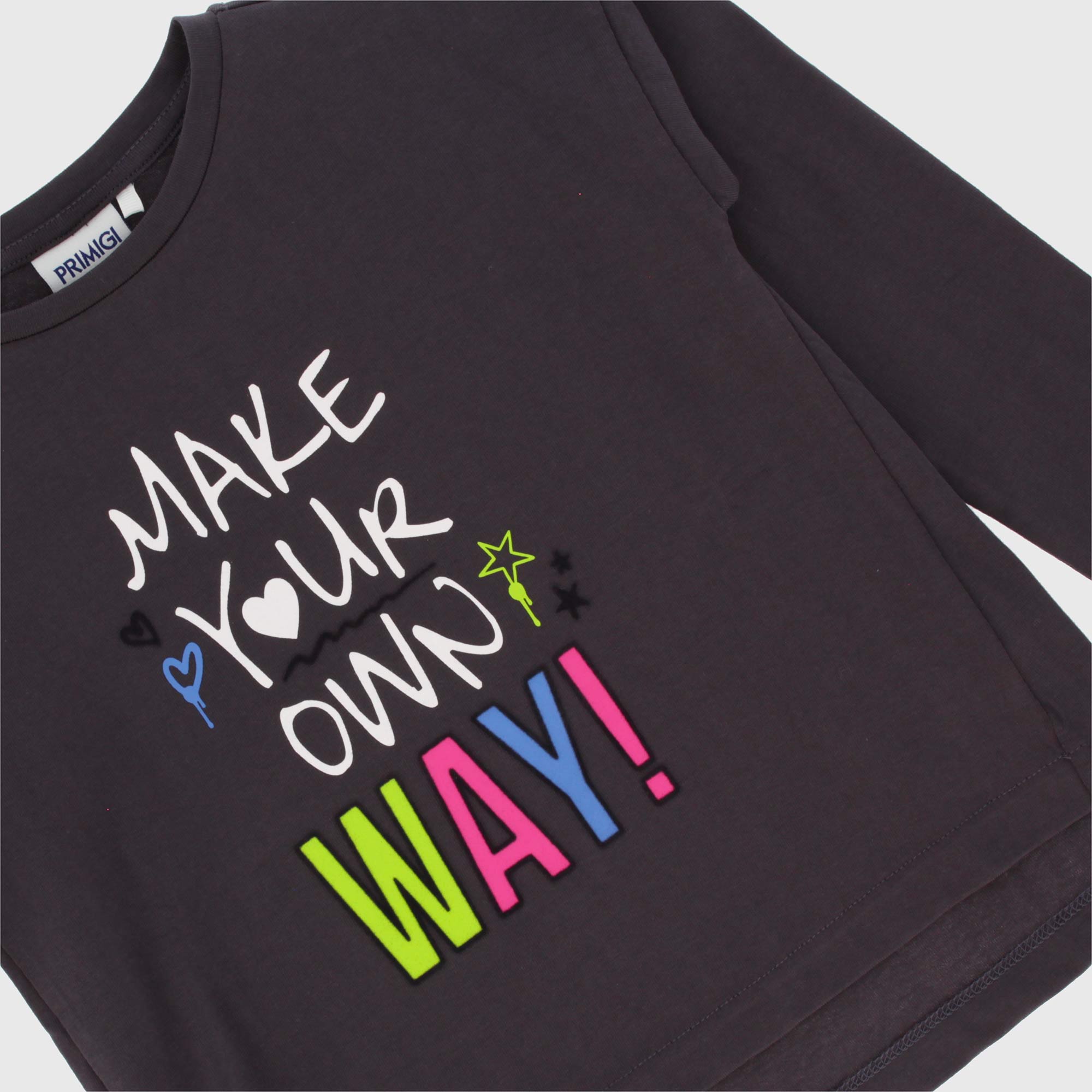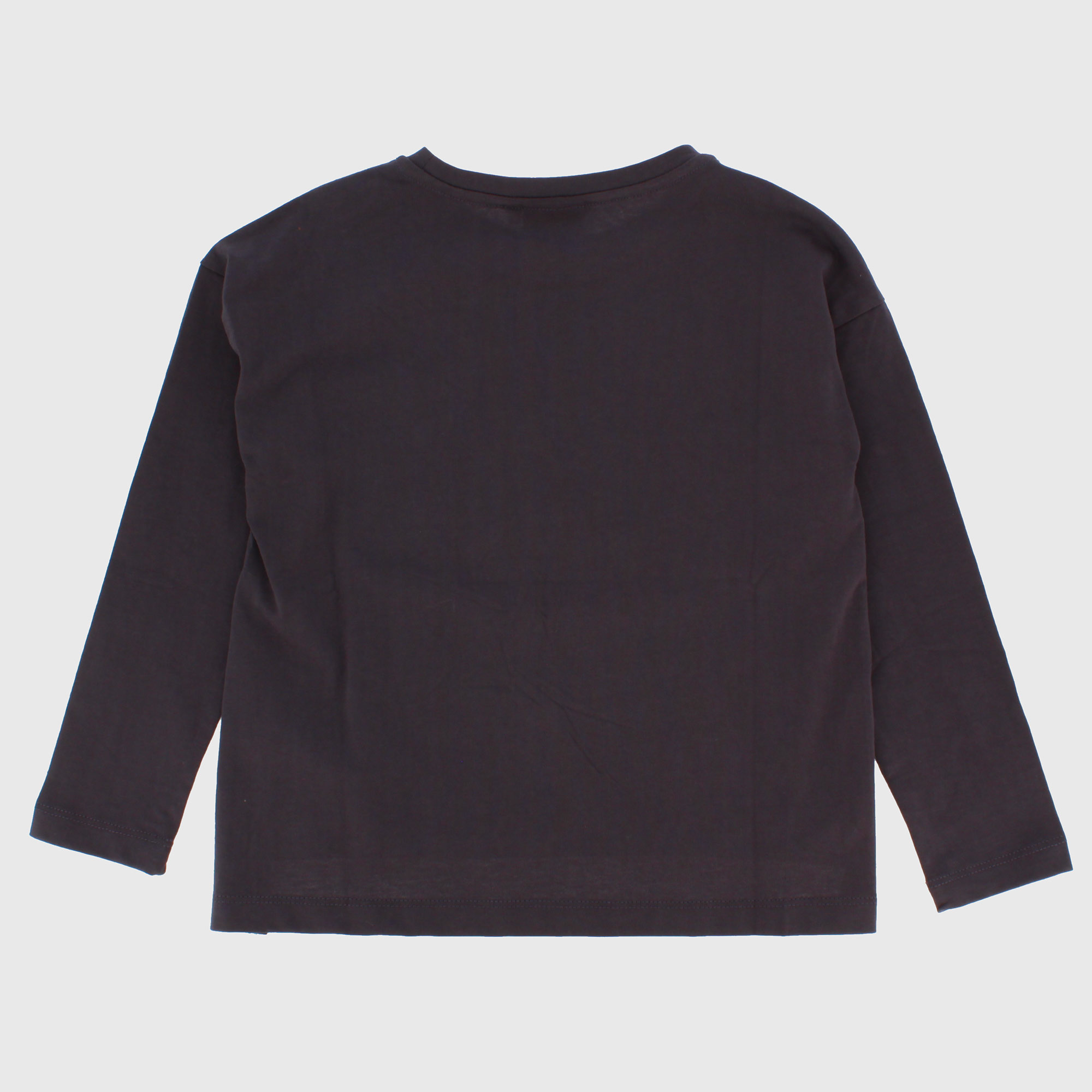 Maglietta in jersey, girocollo, a maniche lunghe. Stampa con dettagli flock sul davanti. Fondo asimmetrico.