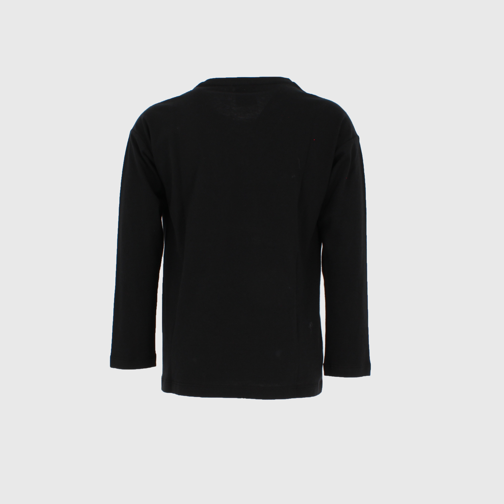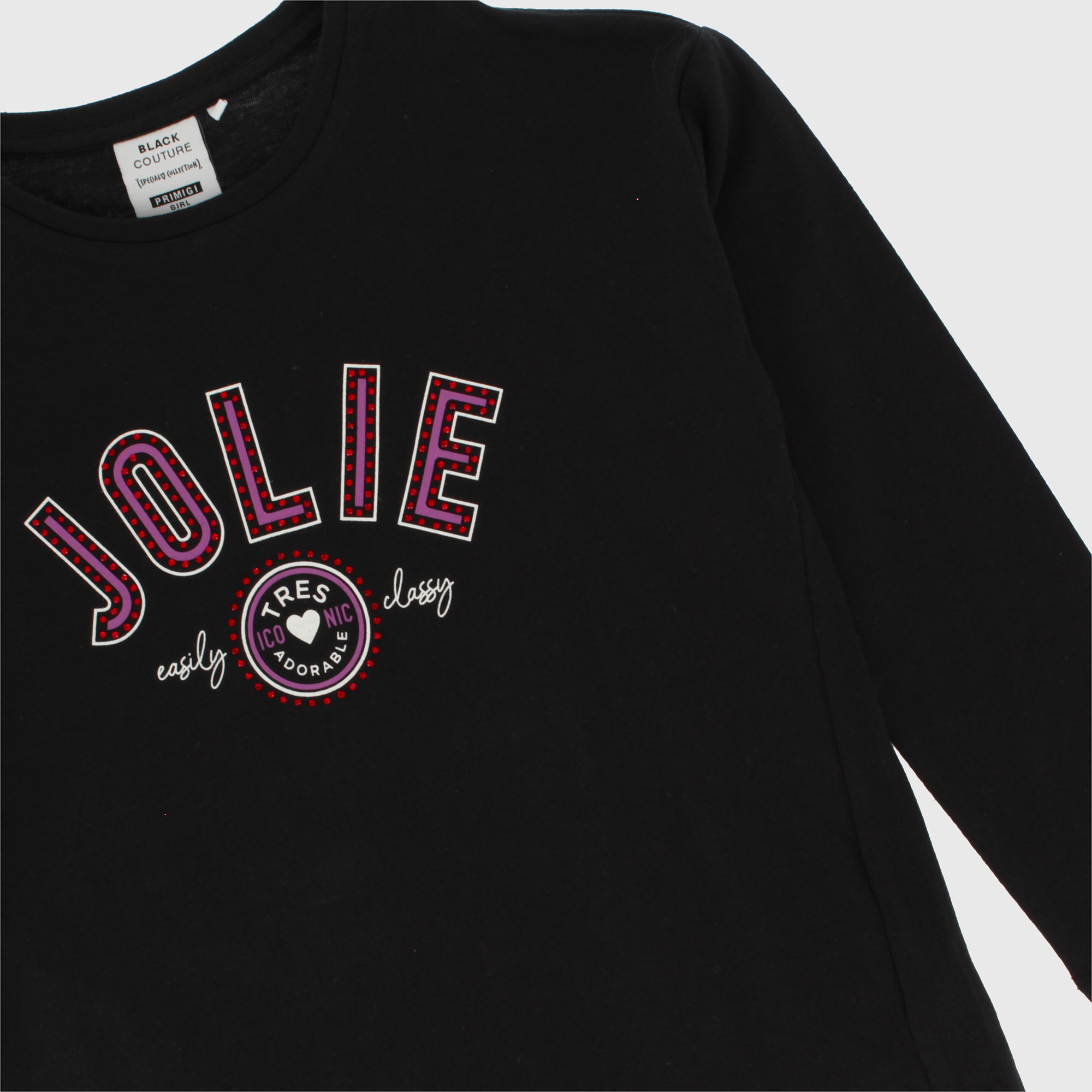 Maglietta in jersey, girocollo, a maniche lunghe. Stampa con strass sul davanti. Fondo asimmetrico.