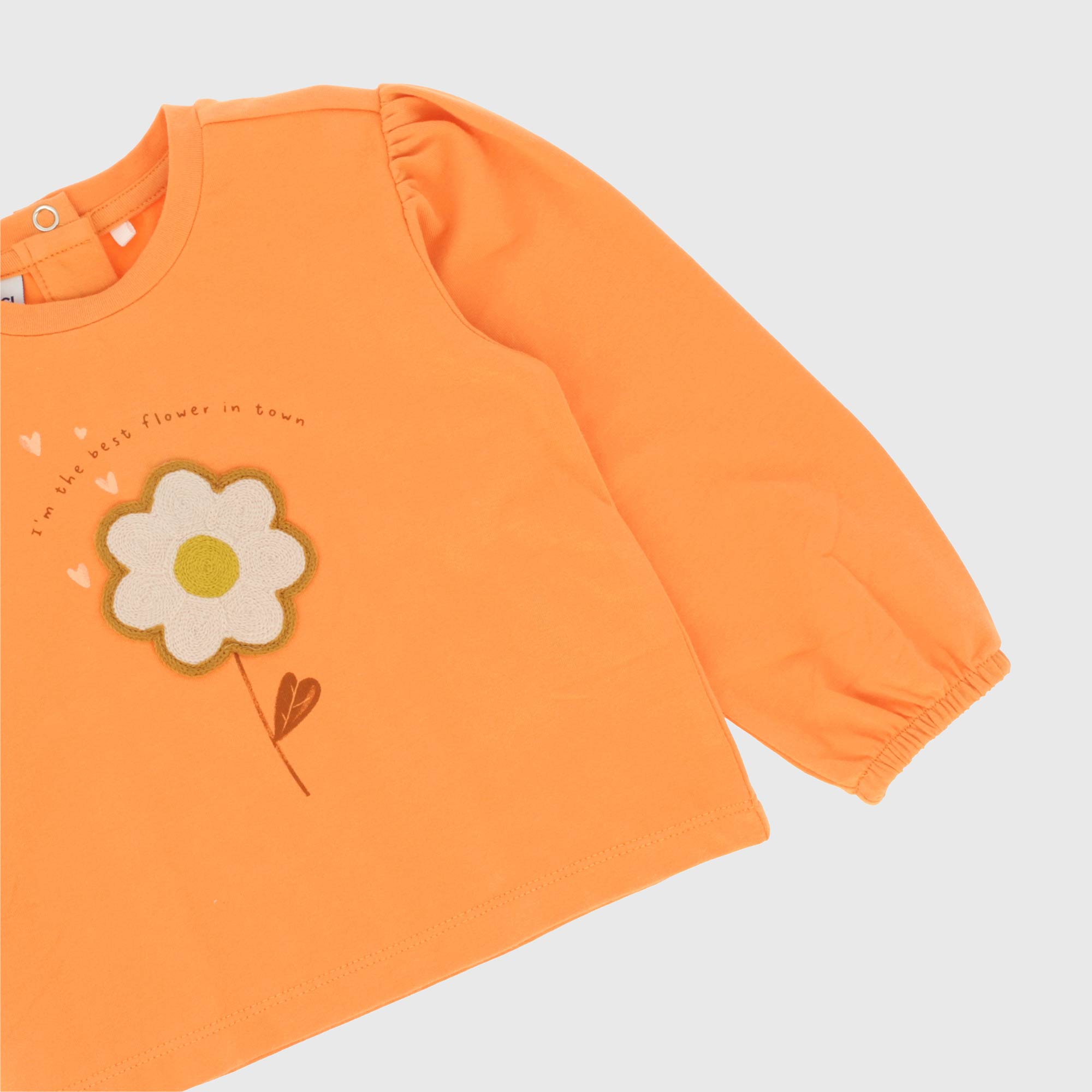 Maglietta in jersey elasticizzato, girocollo, con maniche lunghe a palloncino. Chiusura con bottoni automatici sul retro. Stampa ed applicazione ricamata sul davanti. Polsini con elastico.