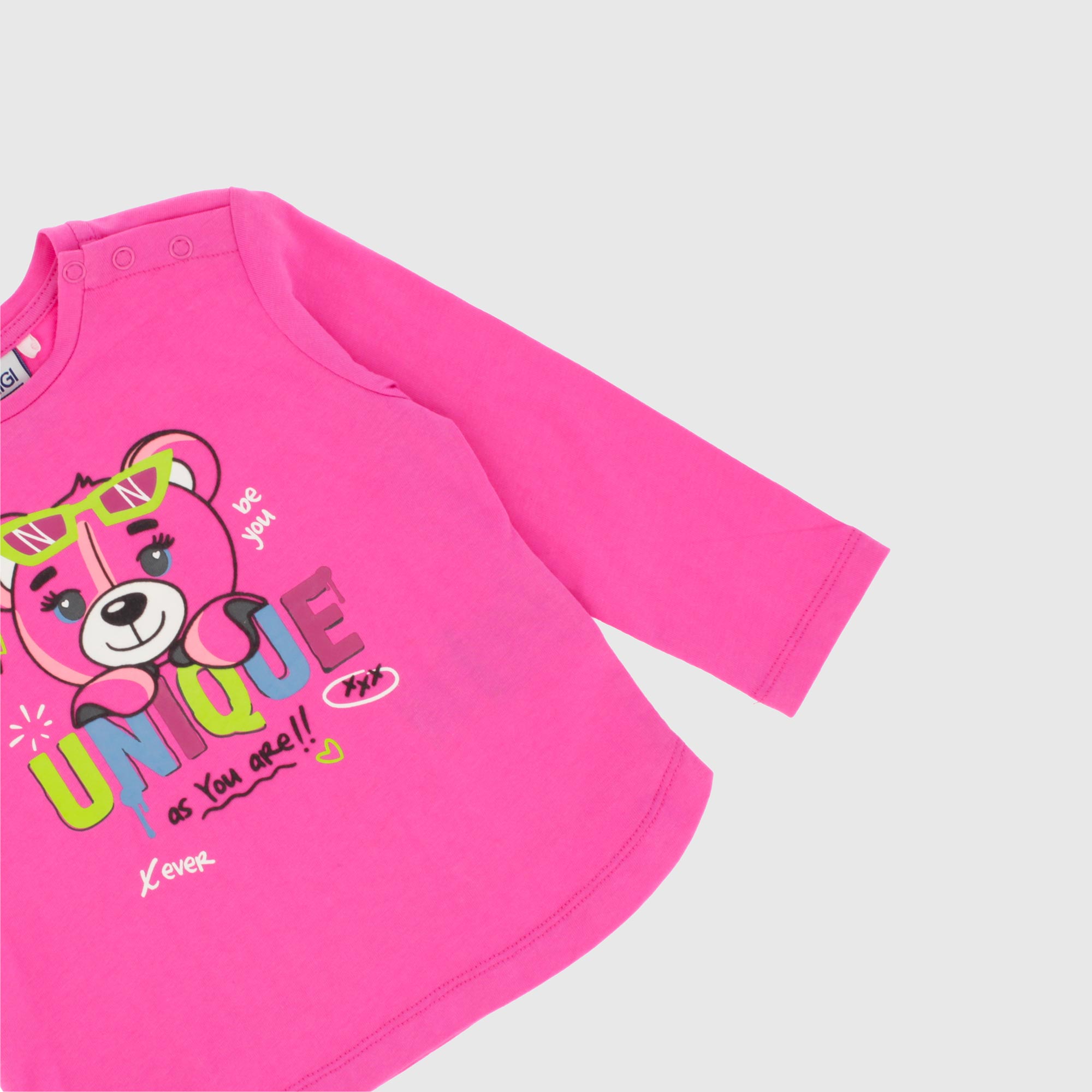 Maglietta in jersey, girocollo, a maniche lunghe. Chiusura con bottoni automatici sulla spalla. Stampa con dettagli flock sul davanti.