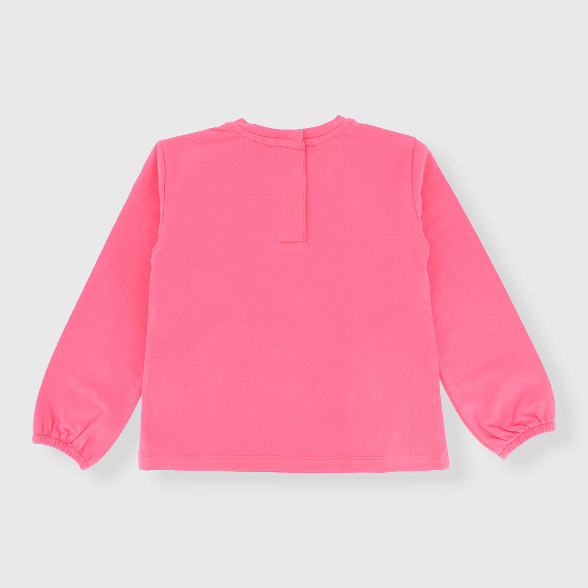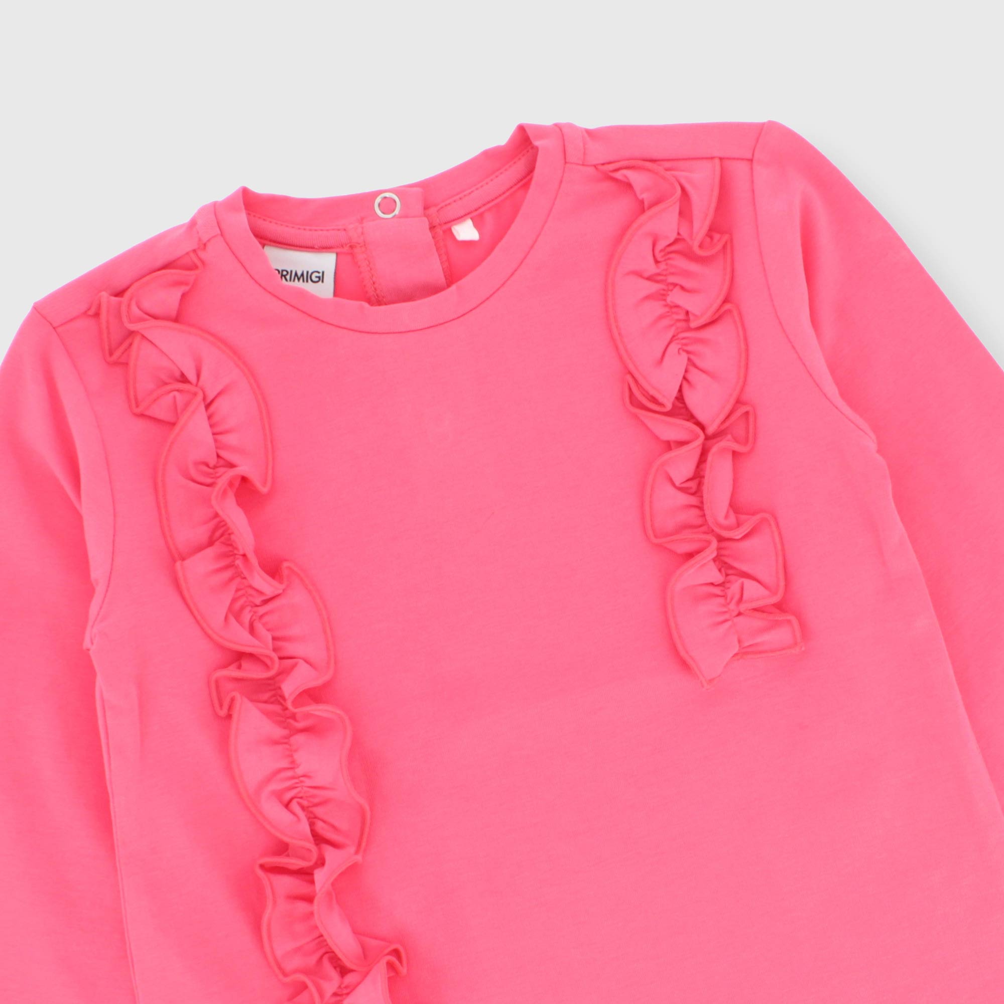 Maglietta in jersey elasticizzato, girocollo, a maniche lunghe. Chiusura con bottoncini automatici sul retro. Volants applicati sul davanti. Polsini con elastico.