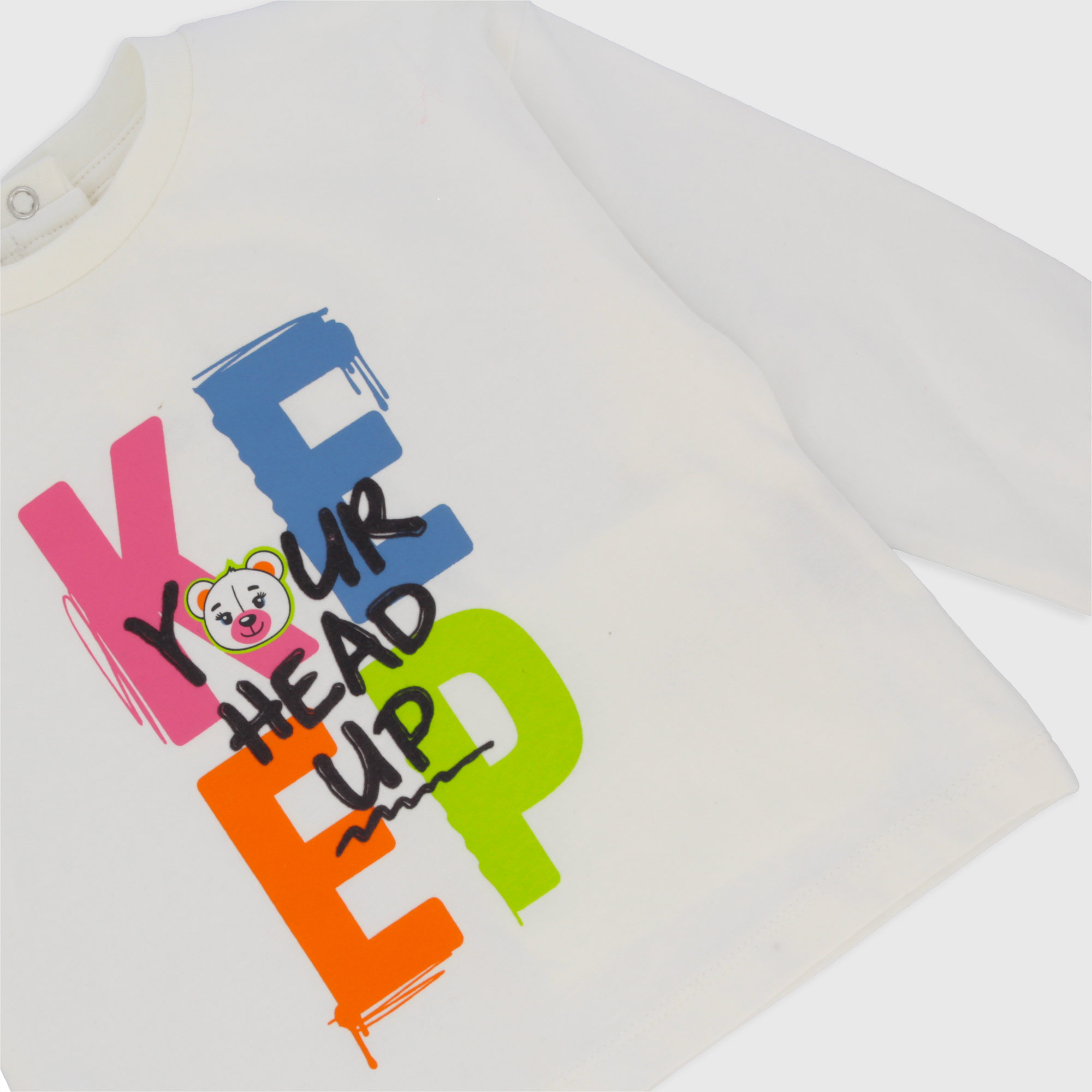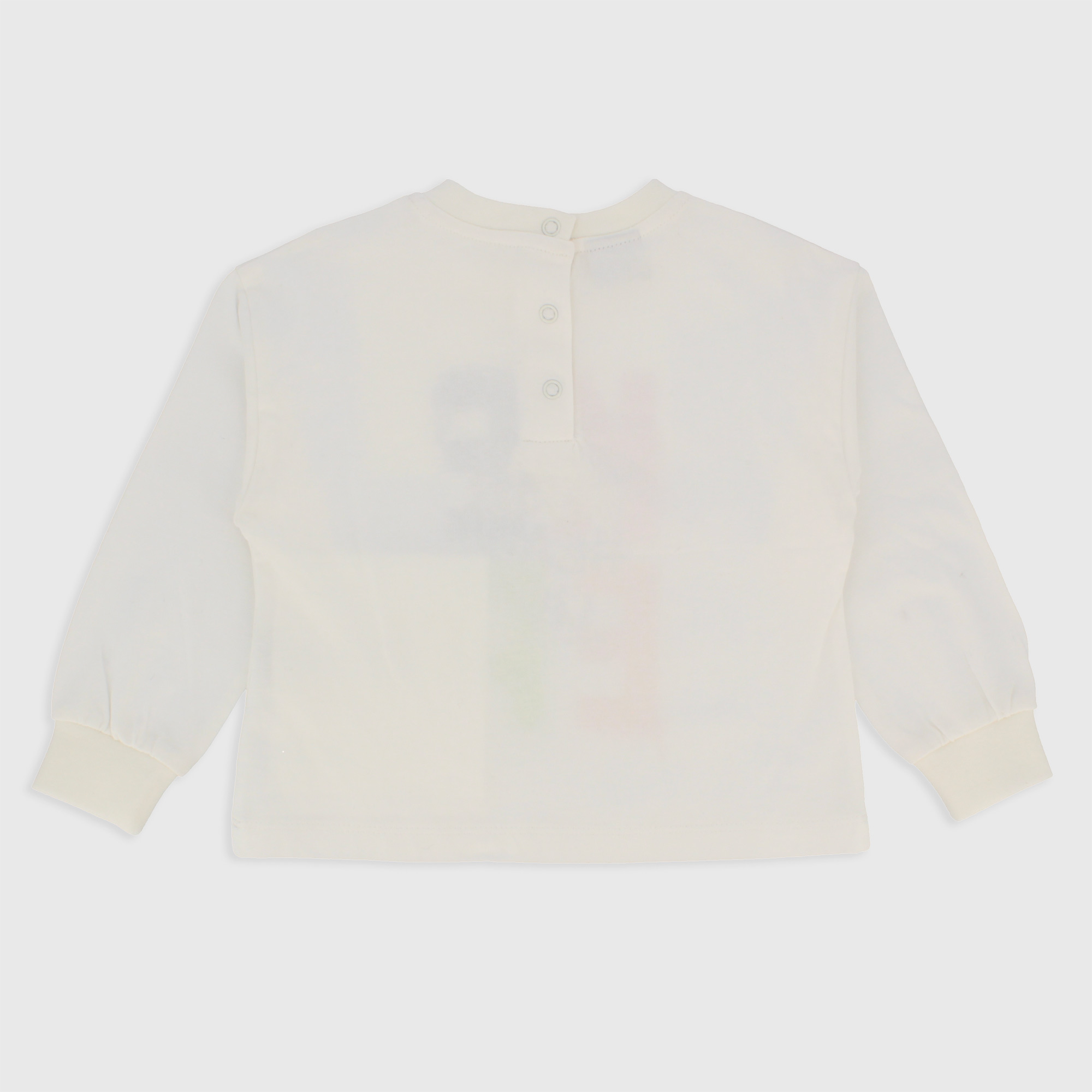 Maglietta in jersey, girocollo, a maniche lunghe. Chiusura con bottoni automatici sul retro. Stampa con dettagli flock sul davanti. Polsini in costina.