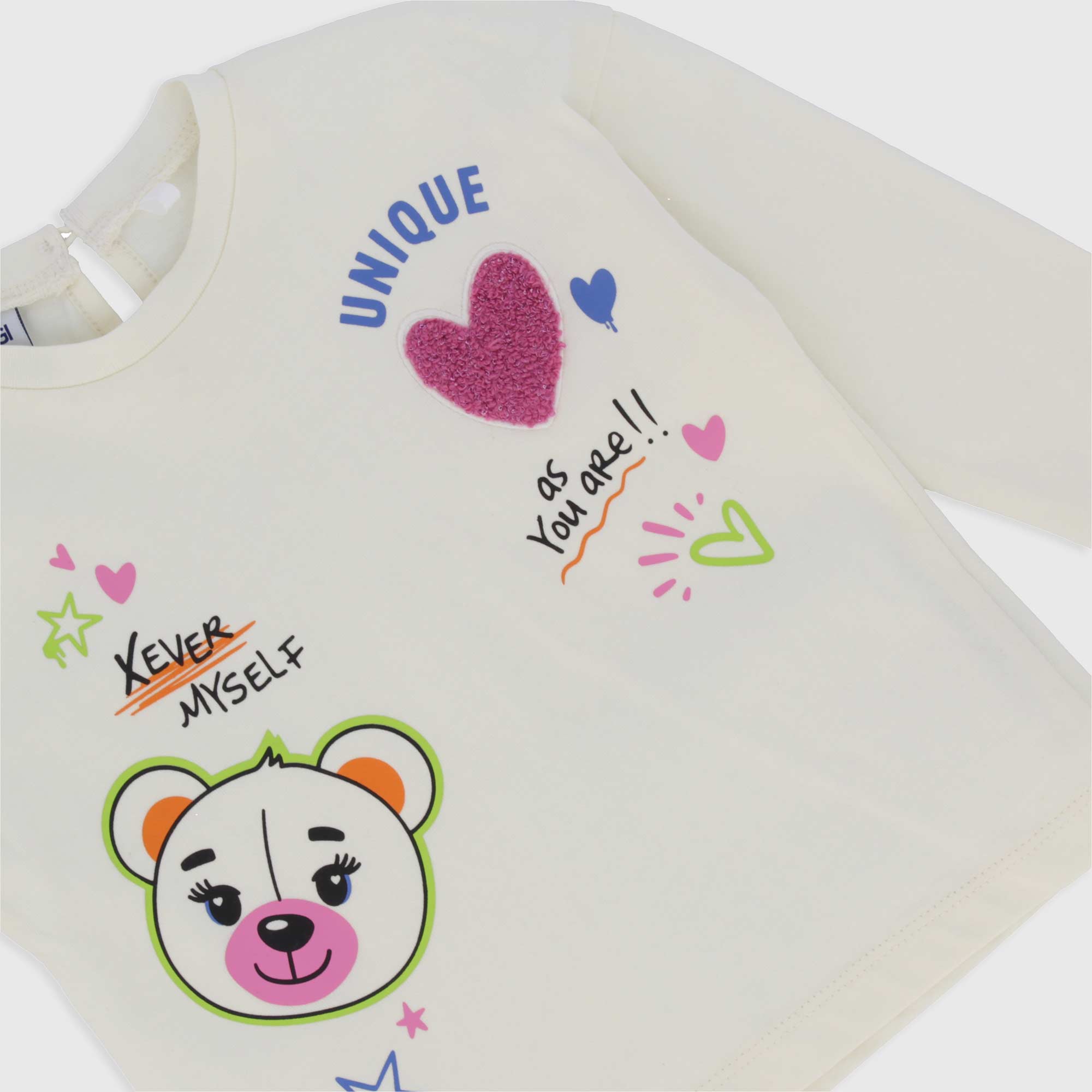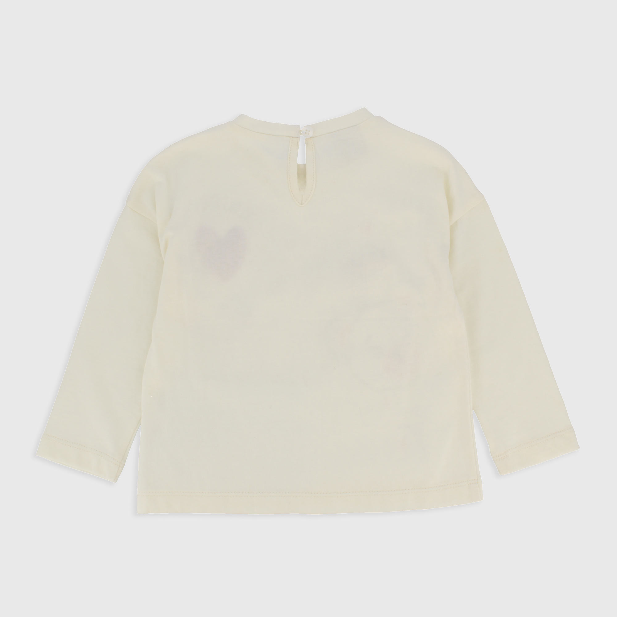 Maglietta in jersey, girocollo, a maniche lunghe. Chiusura a goccia con bottone sul retro. Stampa con applicazione effetto spugna sul davanti.