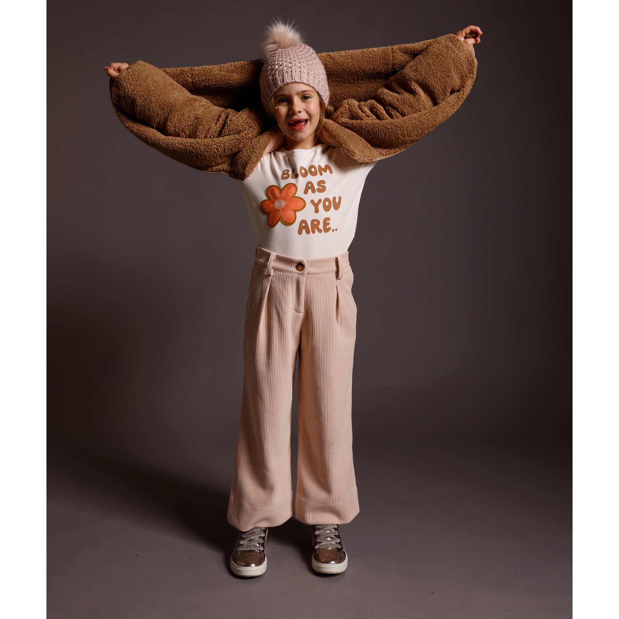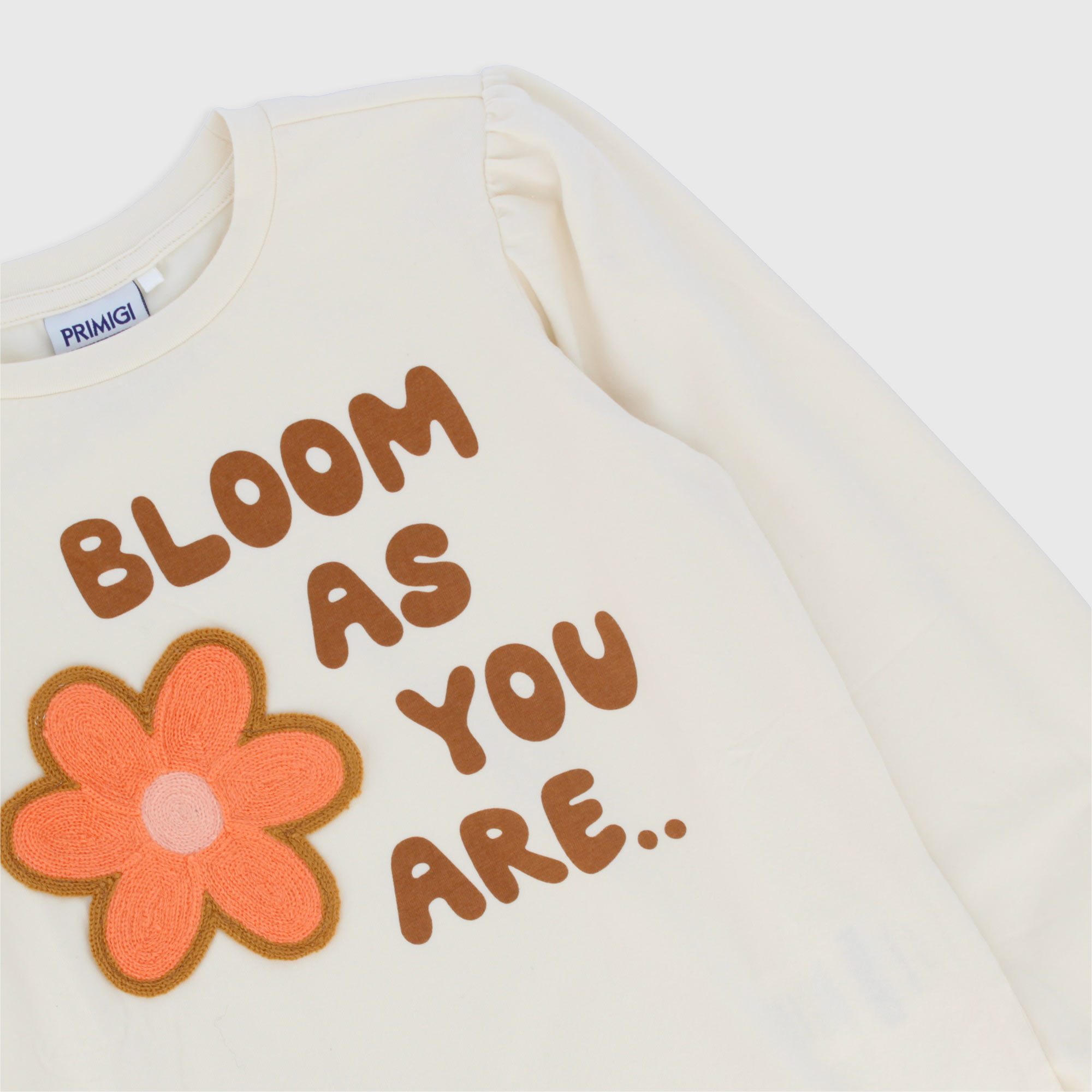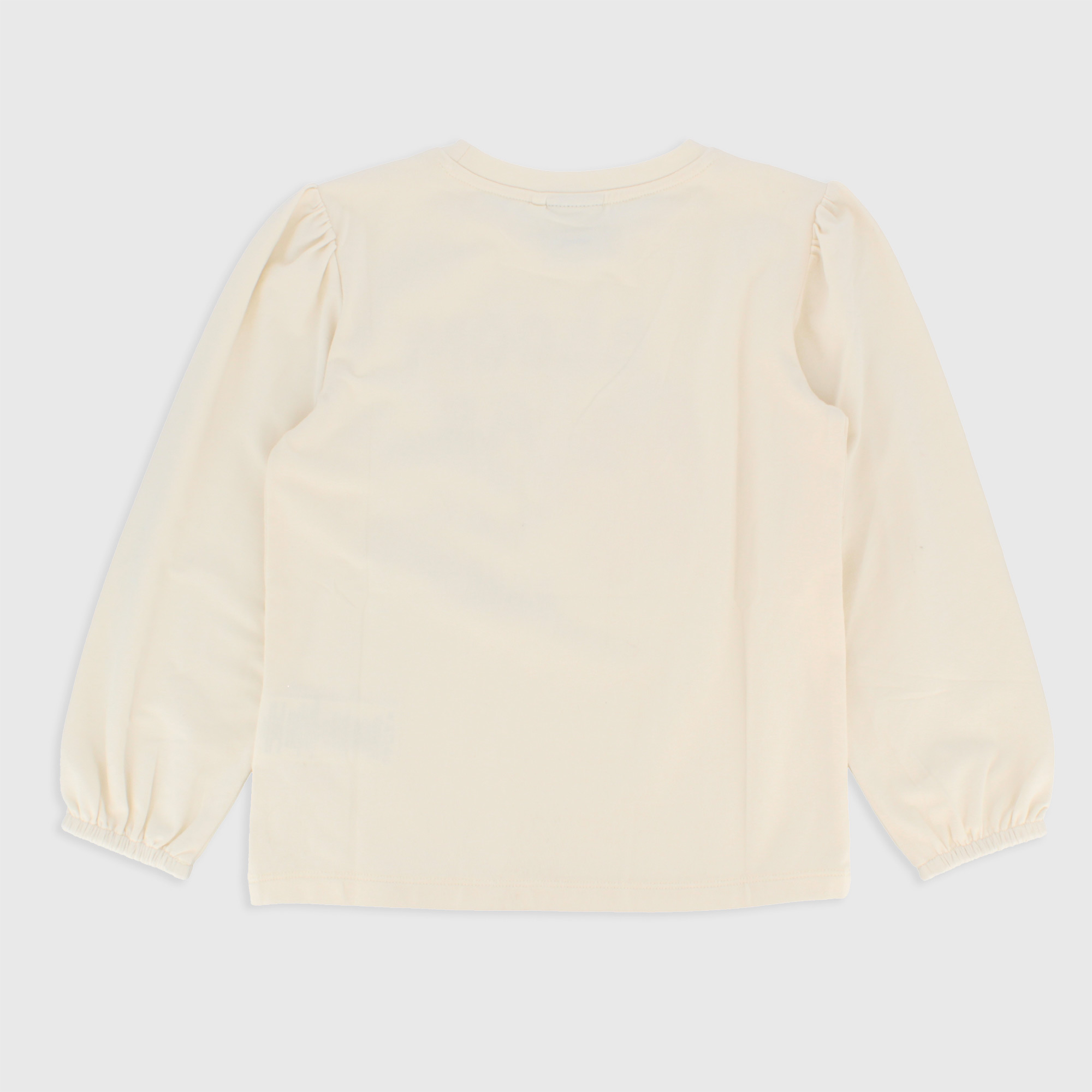 Maglietta in jersey elasticizzato, girocollo, con maniche lunghe a palloncino. Stampa e applicazione a fiore sul davanti, logo glitter stampato sul retro. Polsini con elastico.