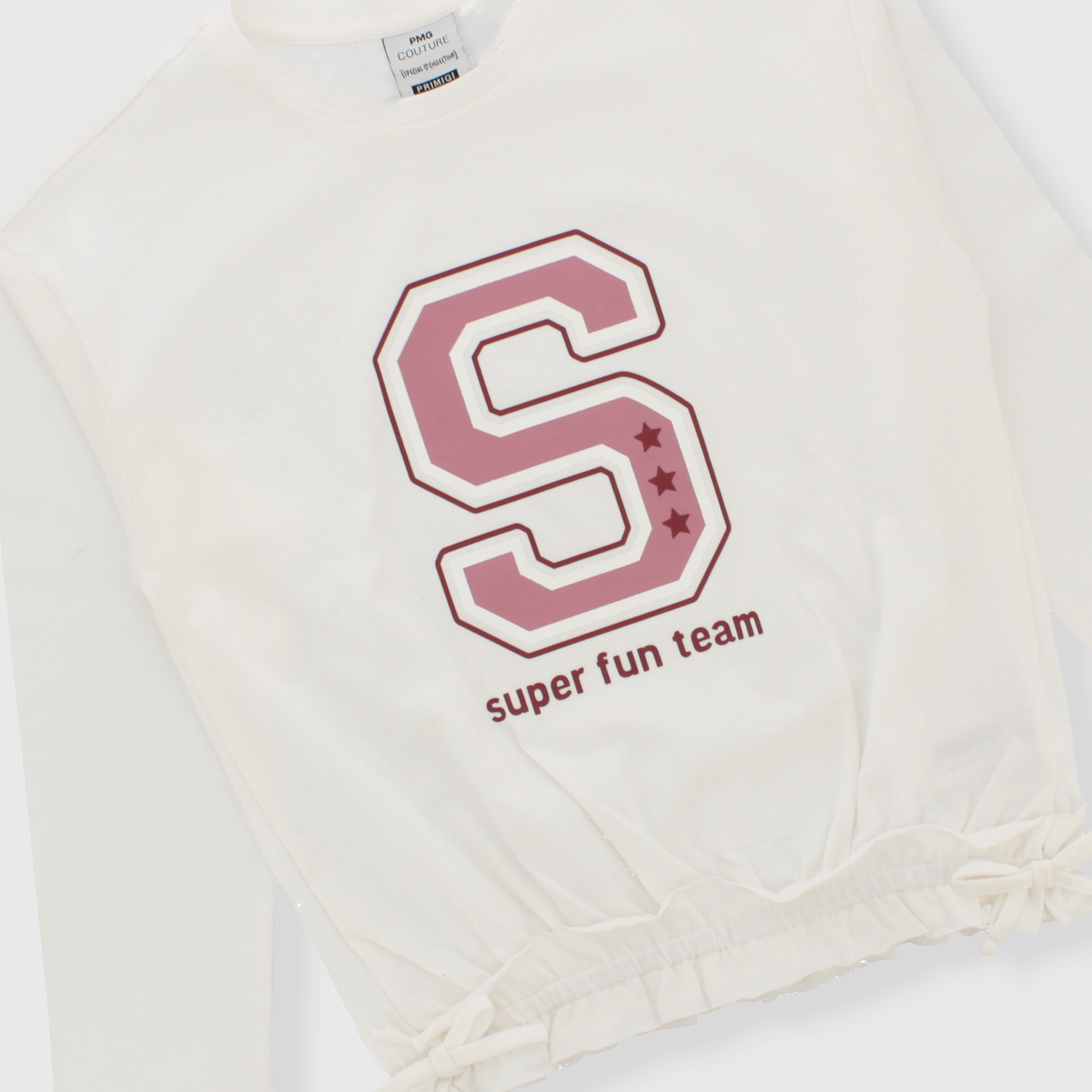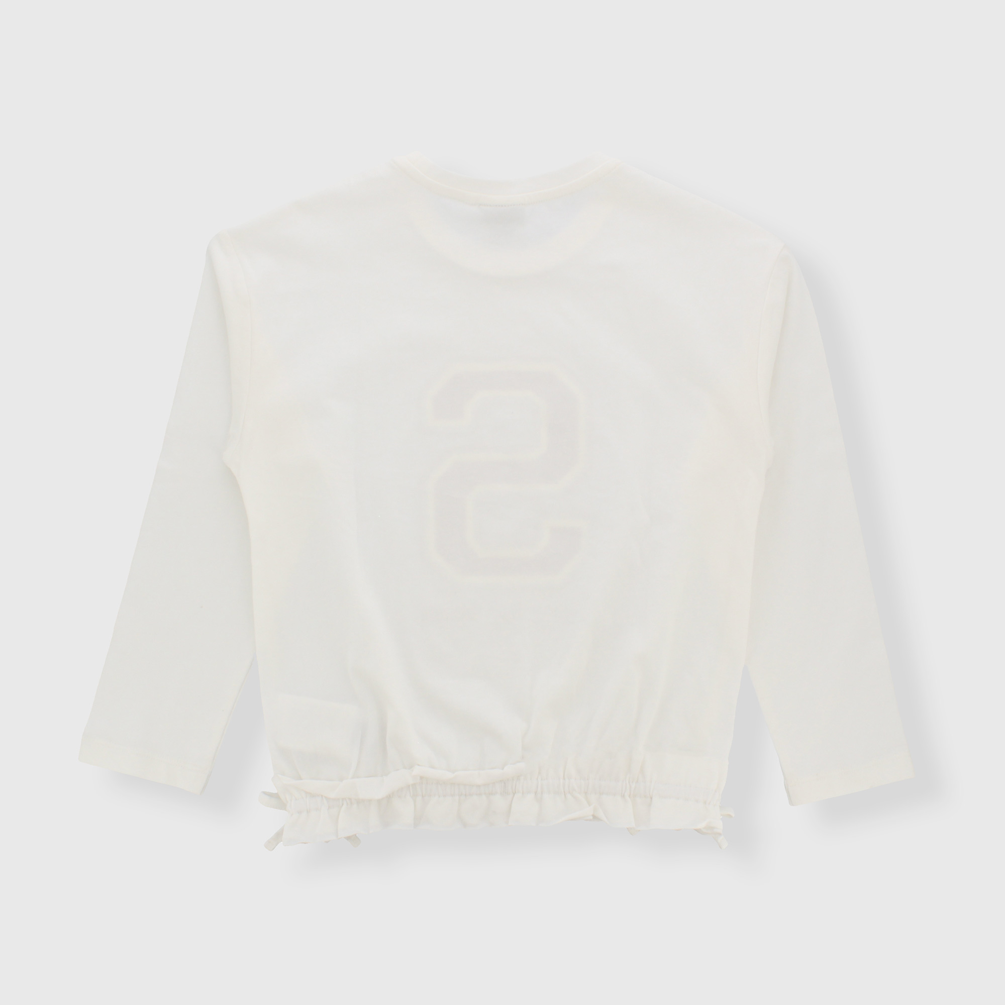 Maglietta in jersey, girocollo, a maniche lunghe. Stampa sul davanti. Fondo arricciato con volants e fiocchetti applicati.