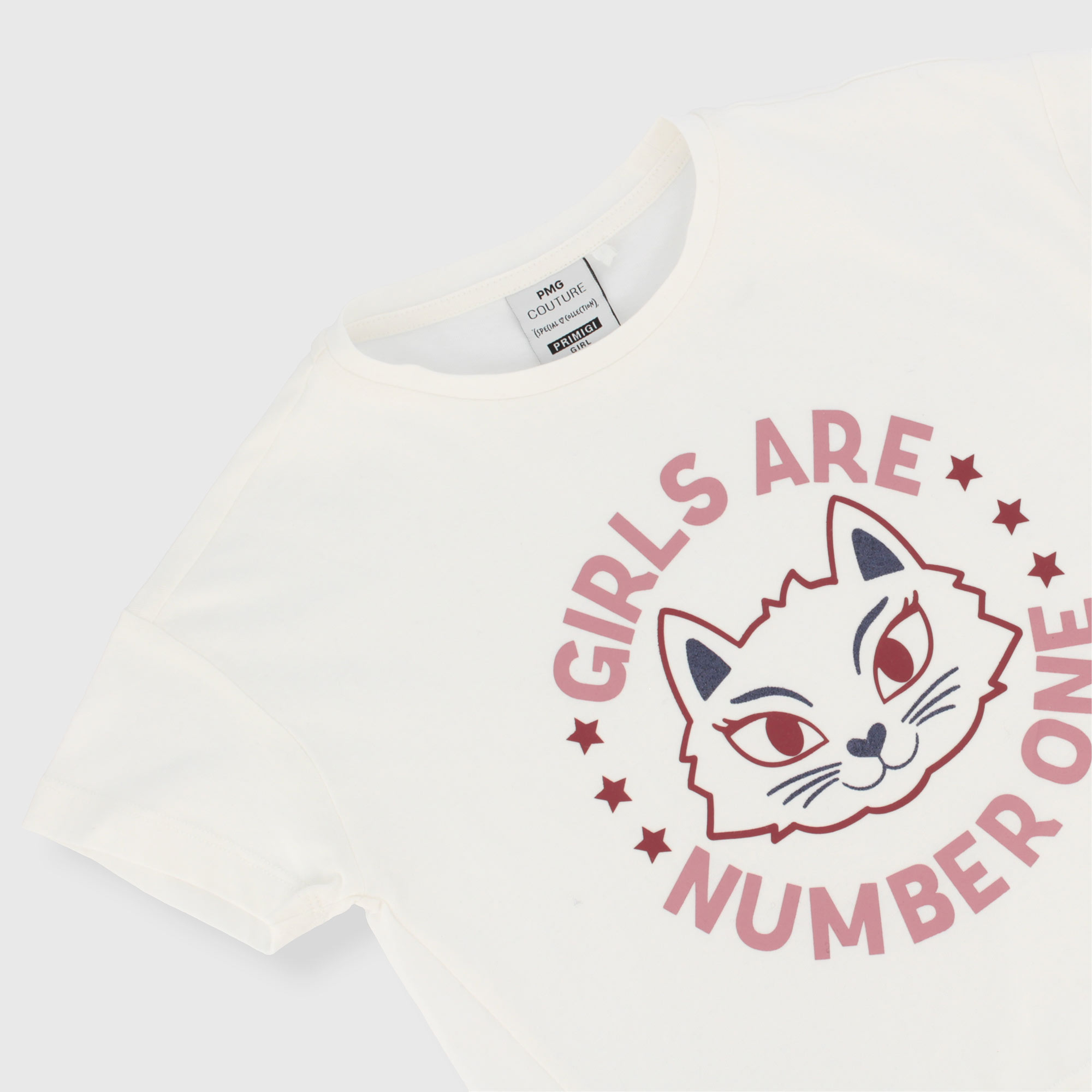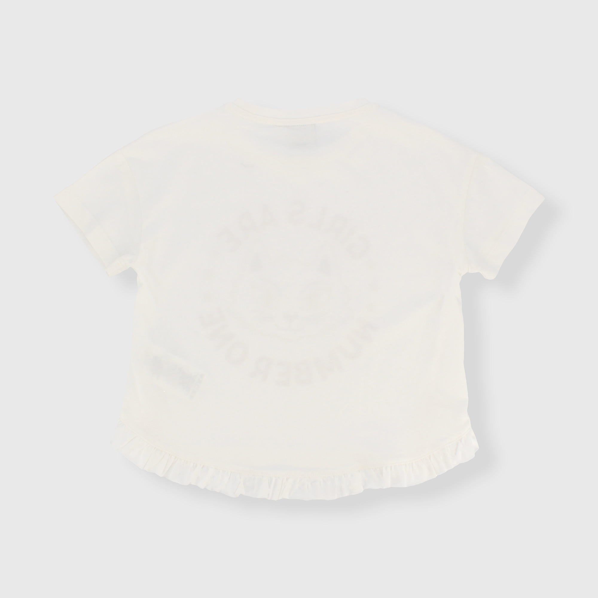 Maglietta in jersey, girocollo, a maniche corte. Stampa con dettagli glitter sul davanti. Volants sul fondo nella parte posteriore.