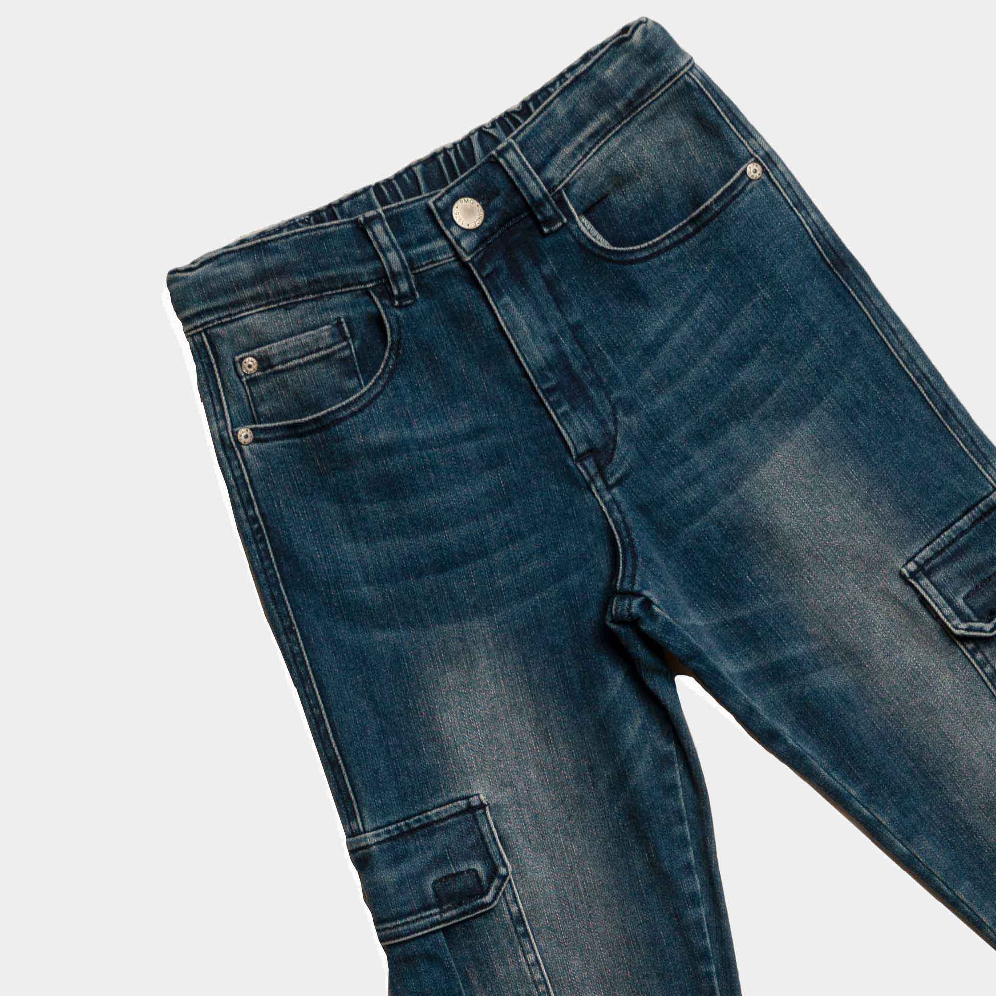 Pantalone cargo in jeans con vita regolabile all'interno. Chiusura con bottone e zip. Passanti in vita. Tasche sul davanti, e tasconi laterali.