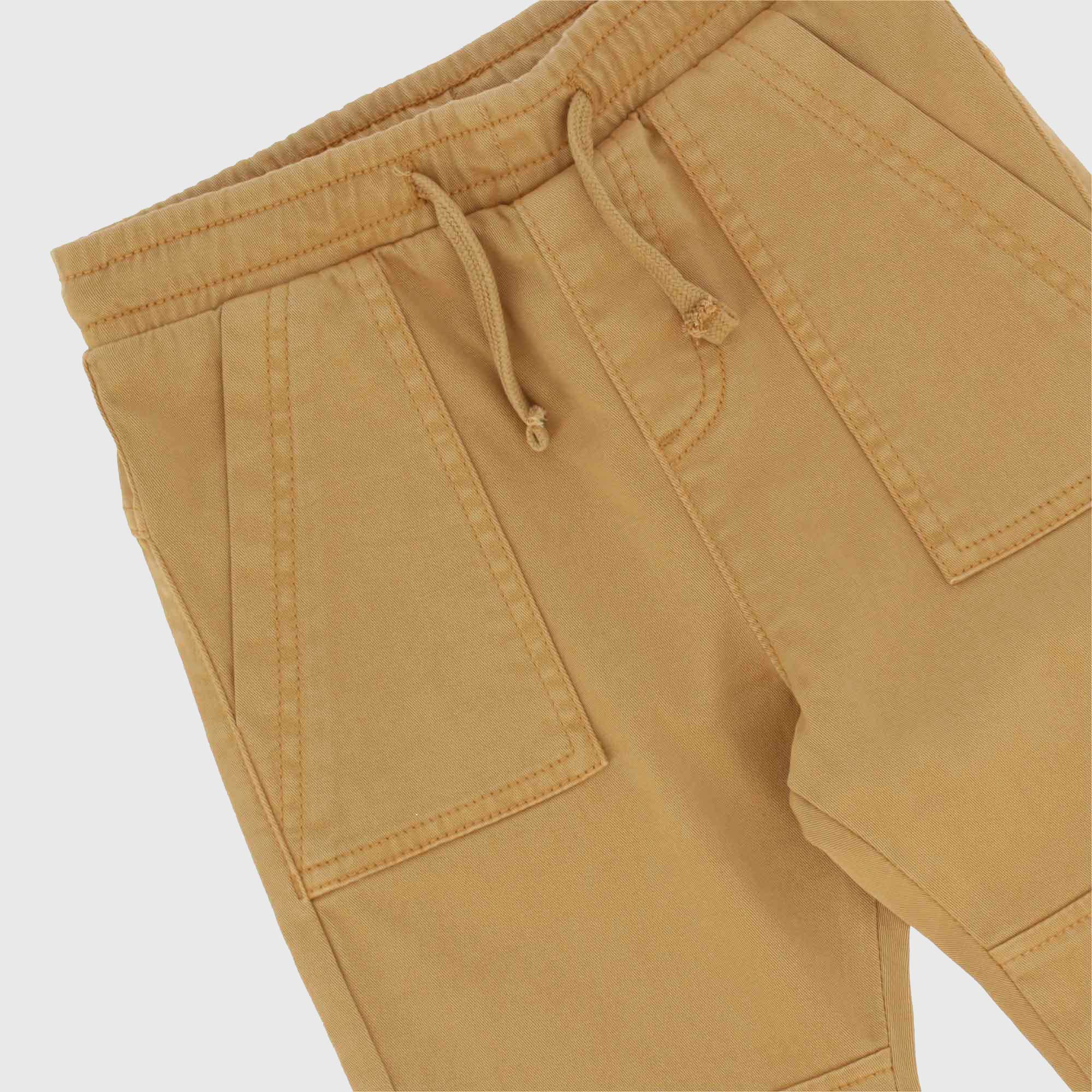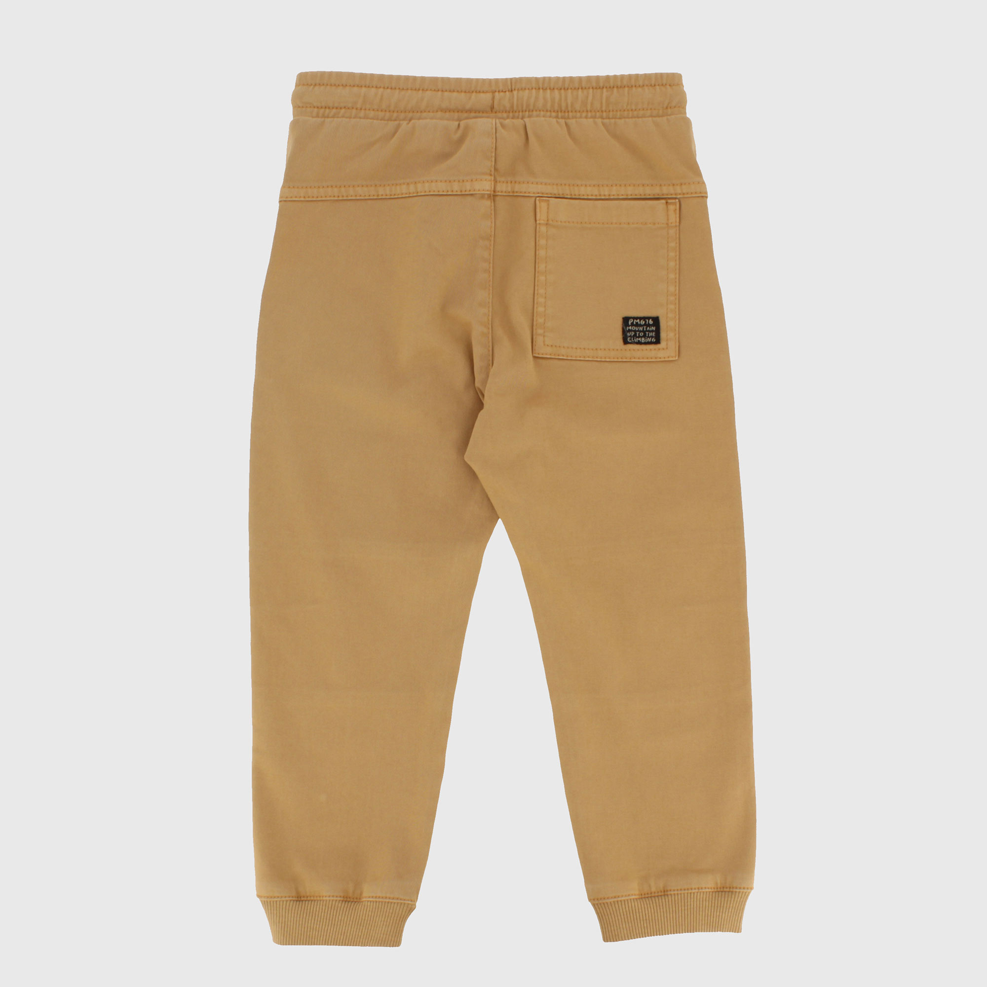 Pantalone in gabardina con vita elasticizzata e lacci sul davanti. Tasche alla francese anteriori, a toppa sul retro. Fondo in costina.