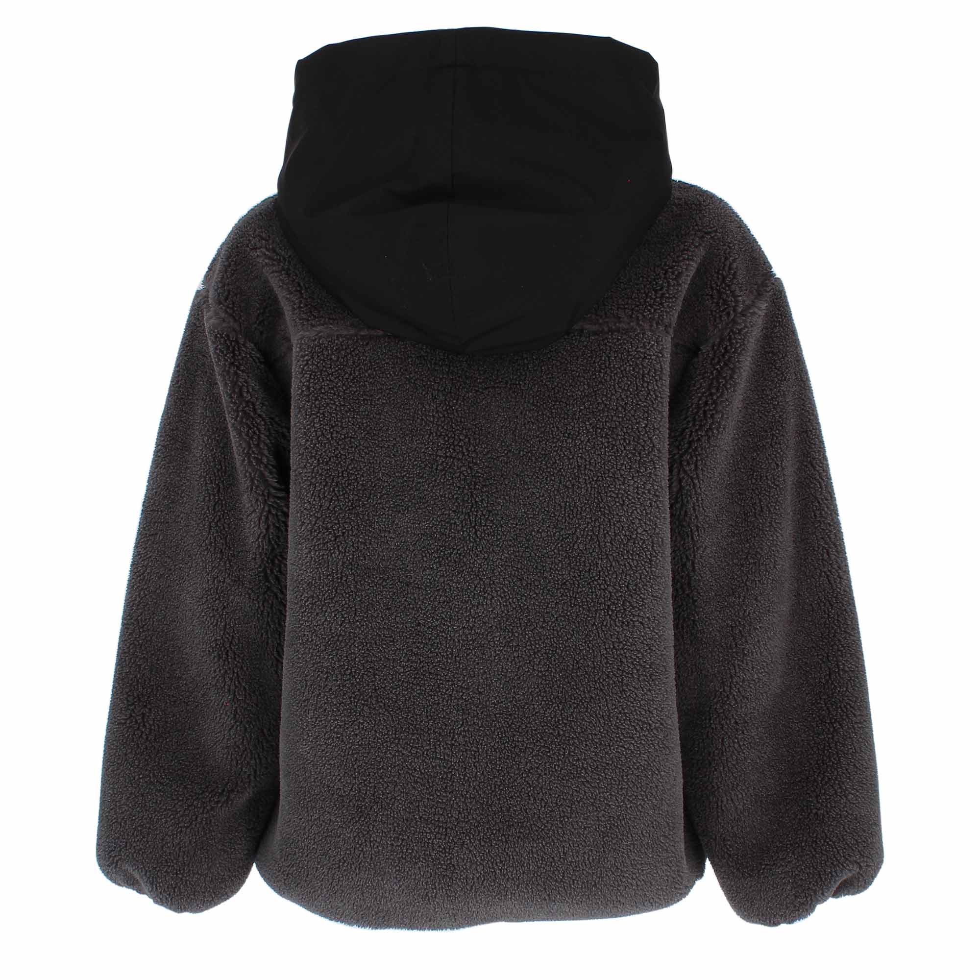 Felpa in teddy pile con cappuccio rivestito in nylon, a maniche lunghe. Chiusura con zip sul davanti. Tasche laterali e taschino in nylon con zip.