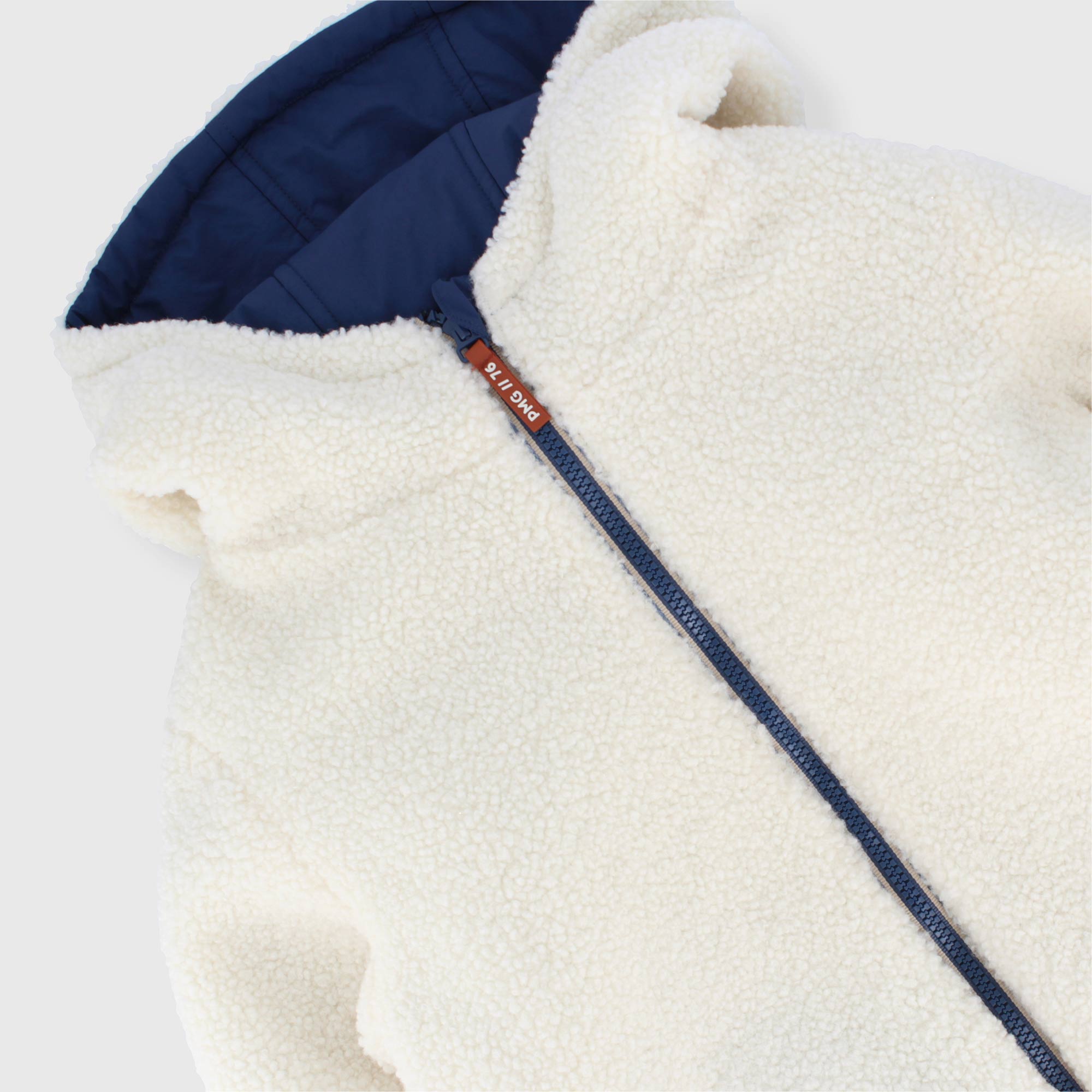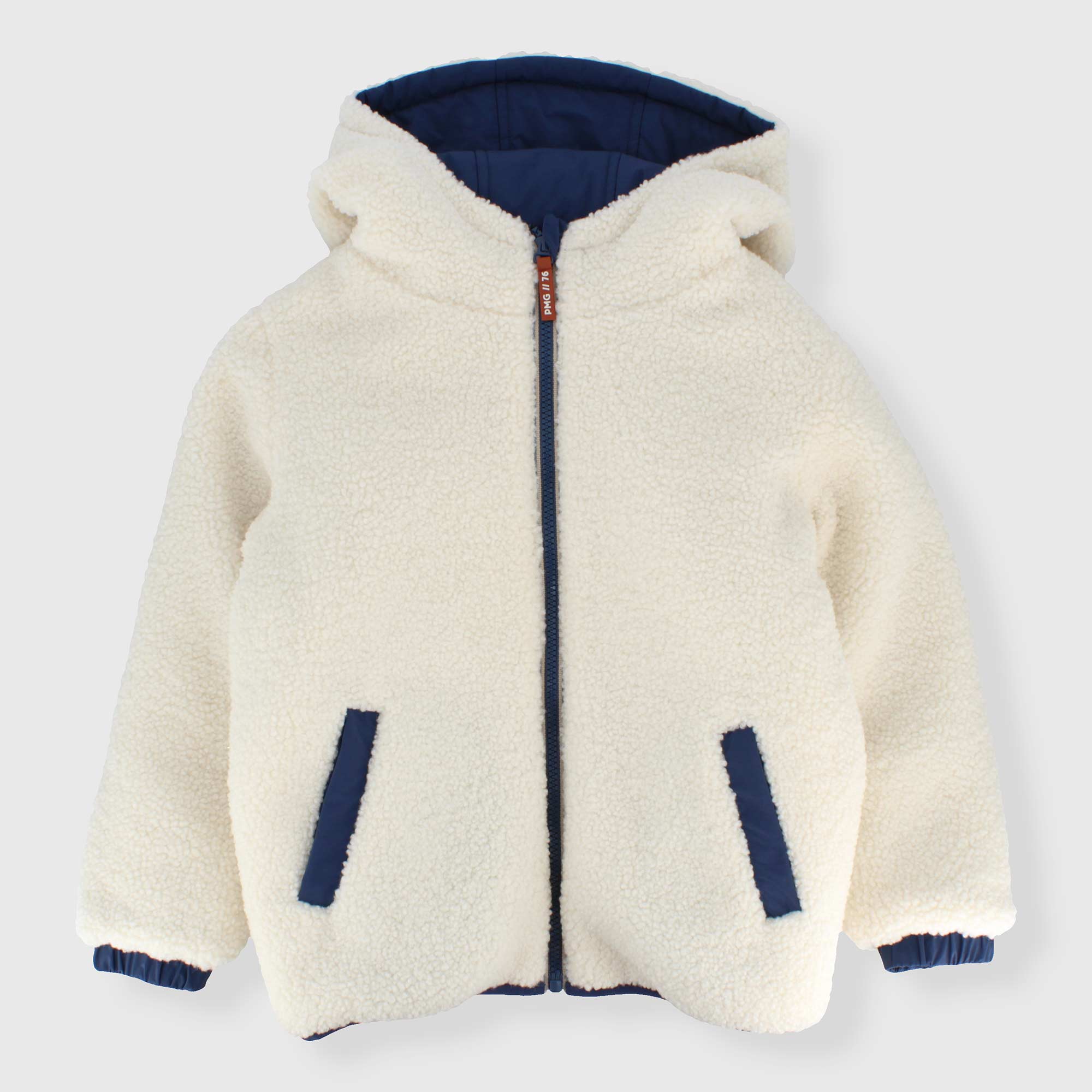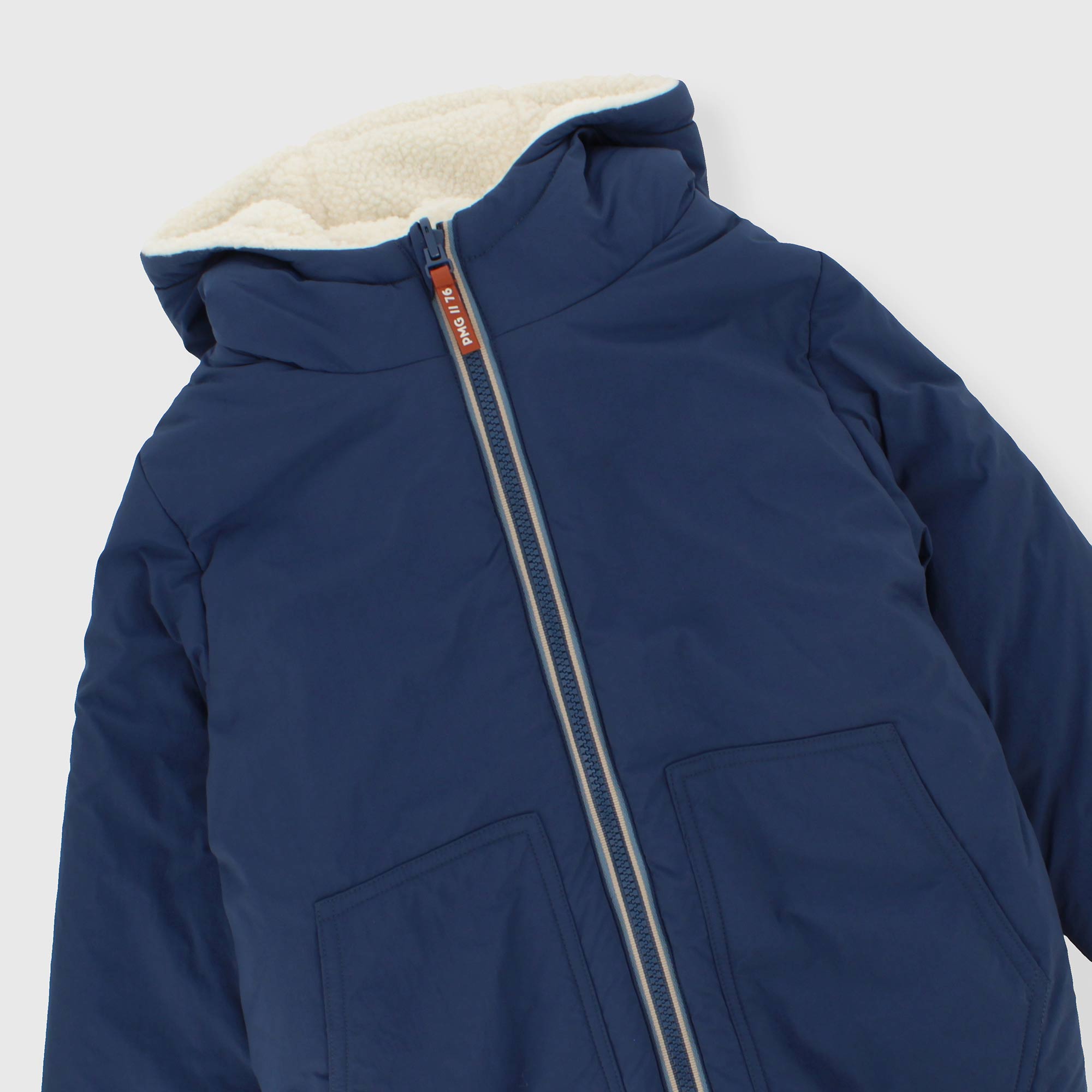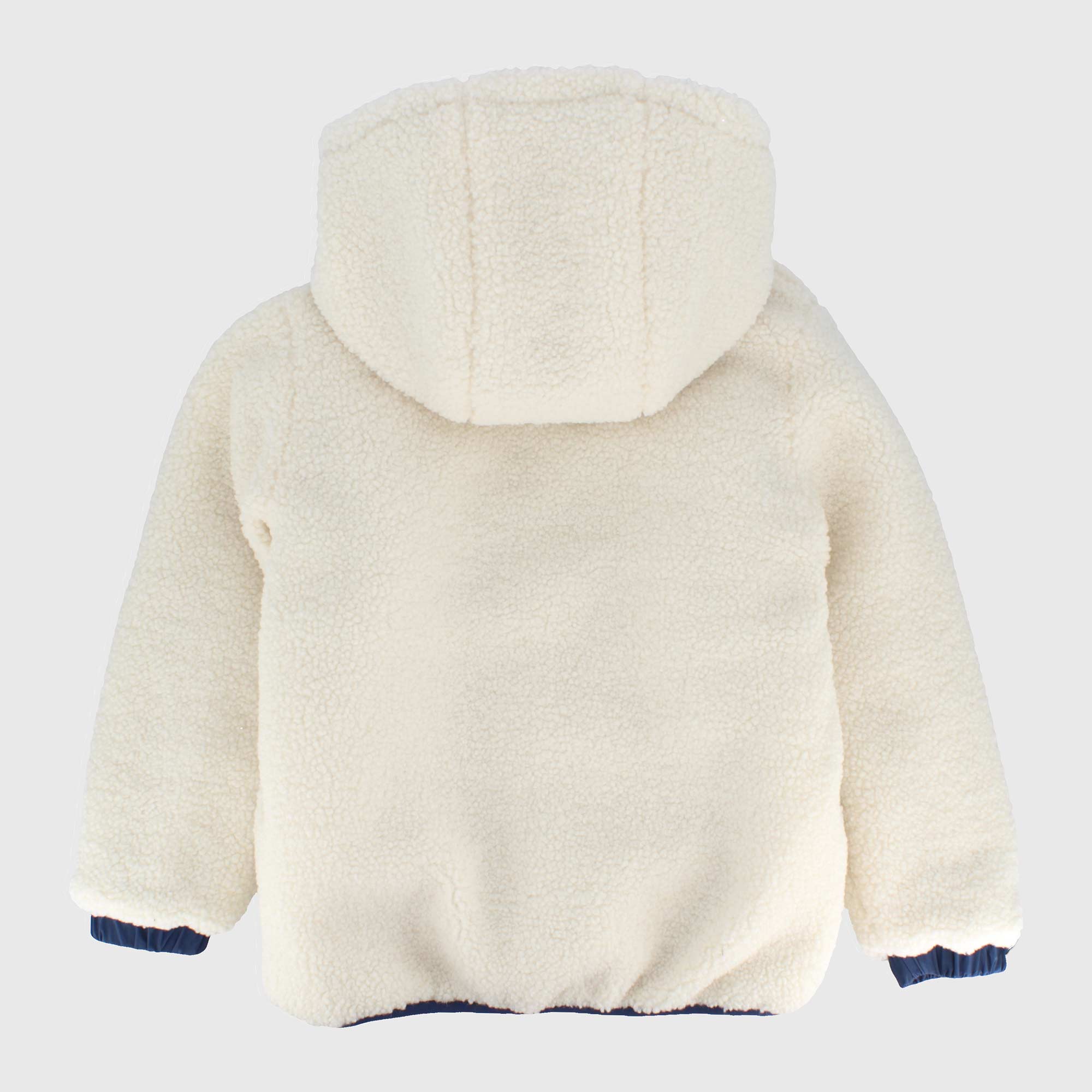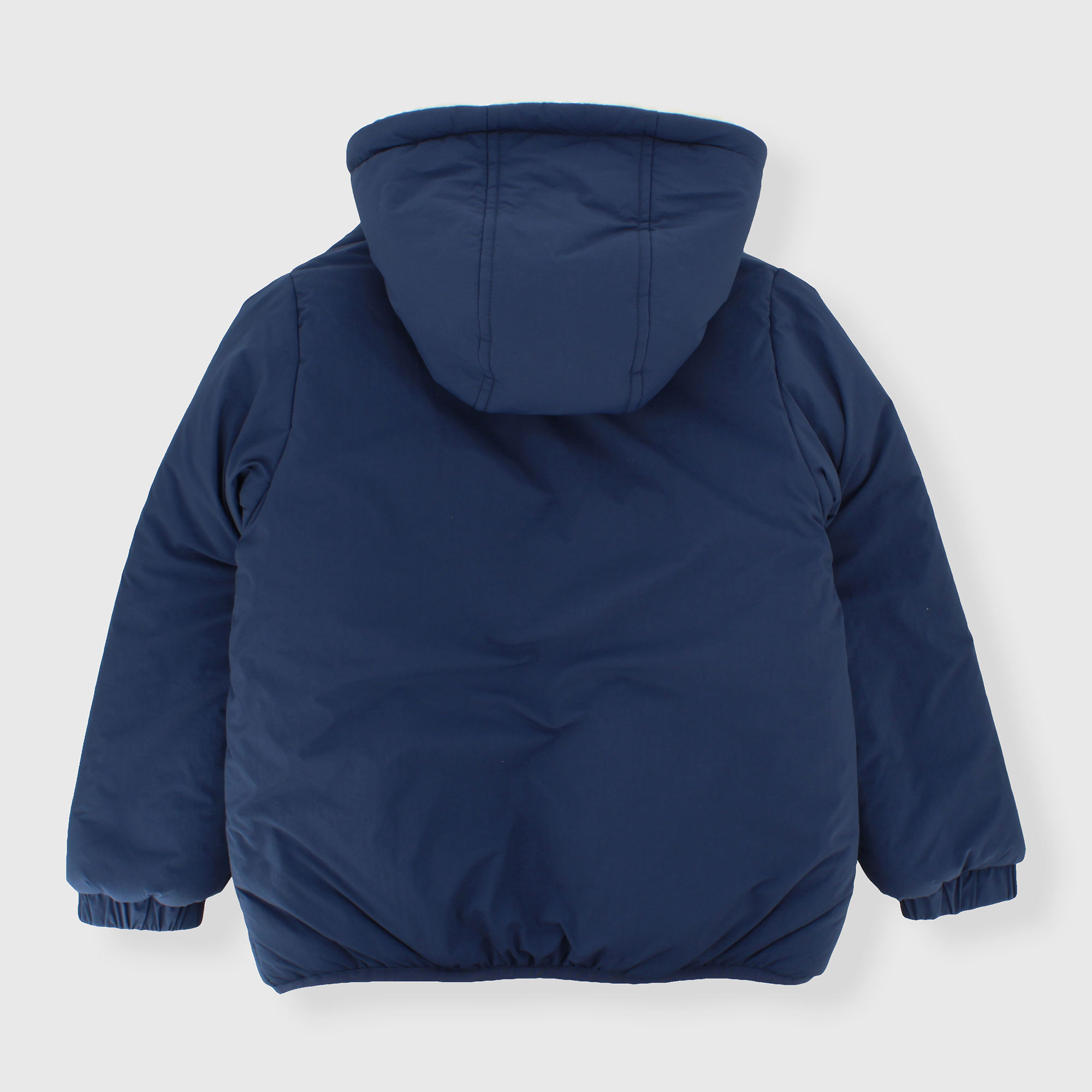 Giubbino reversibile con cappuccio, a maniche lunghe. Un lato in nylon con tasca a marsupio , un lato in pelliccetta ecologica con tasche a filetto. Chiusura con zip sul davanti. Polsini elasticati.