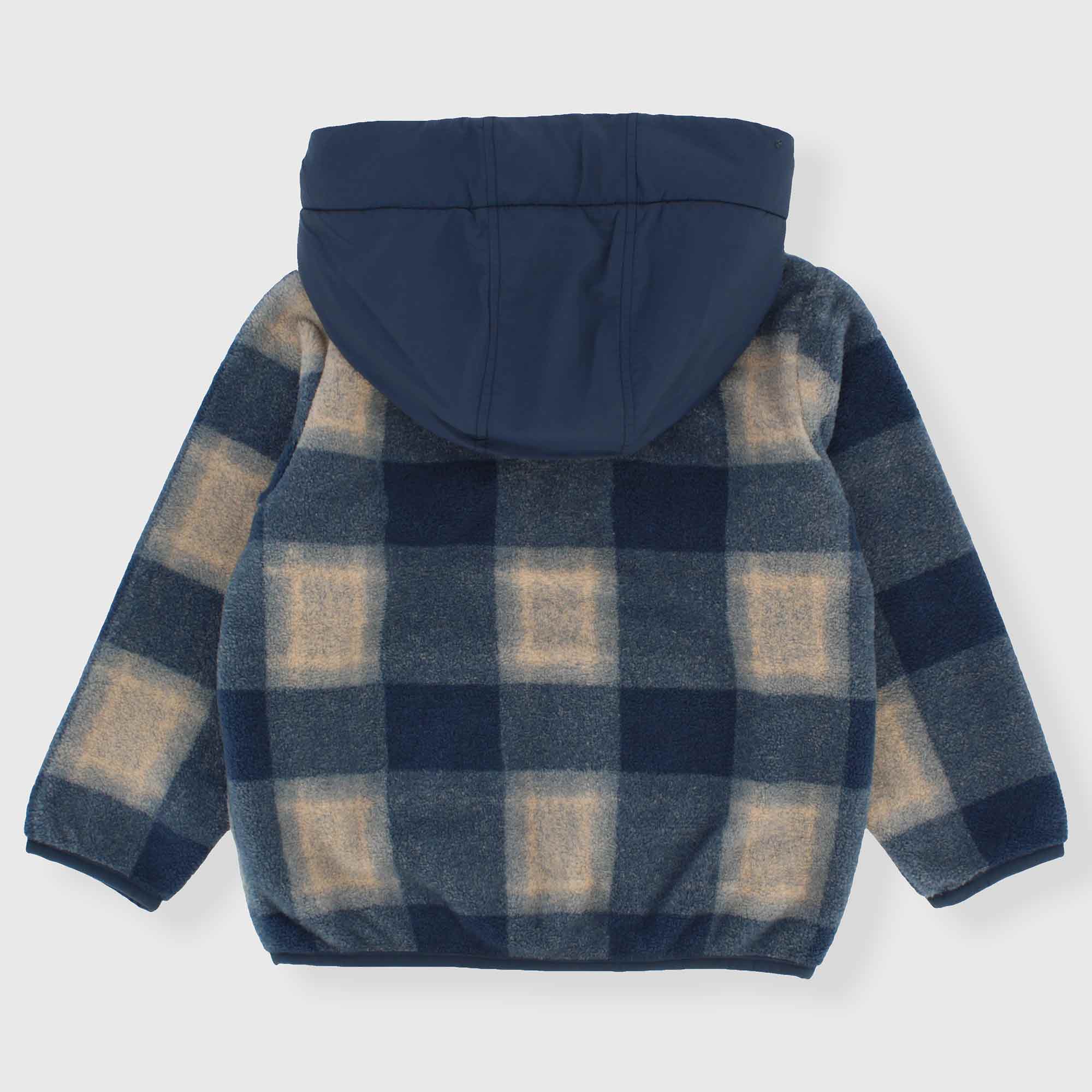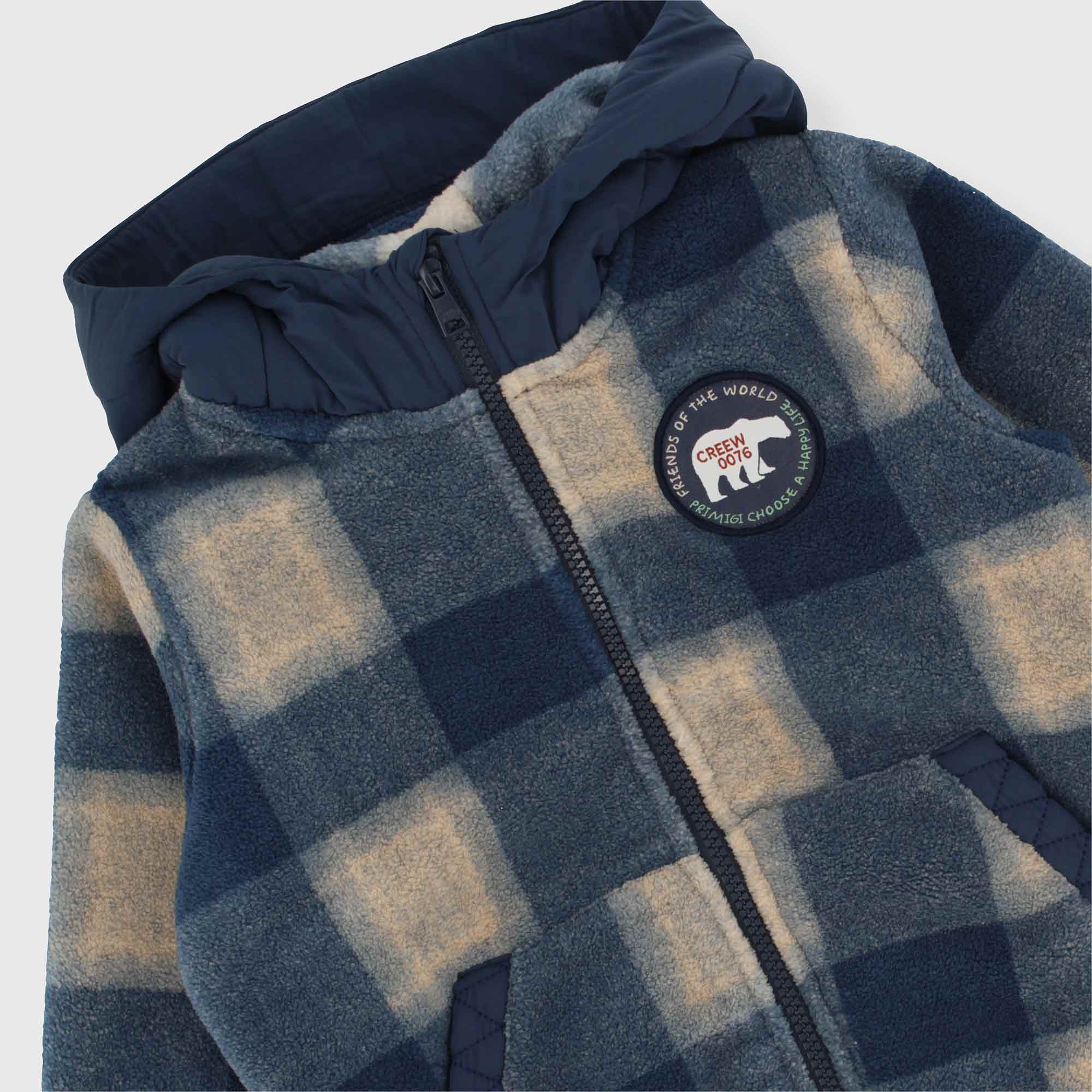 Felpa in pile a quadri, con cappuccio in nylon, a maniche lunghe. Chiusura con zip frontale. Tasche laterali a filetto.