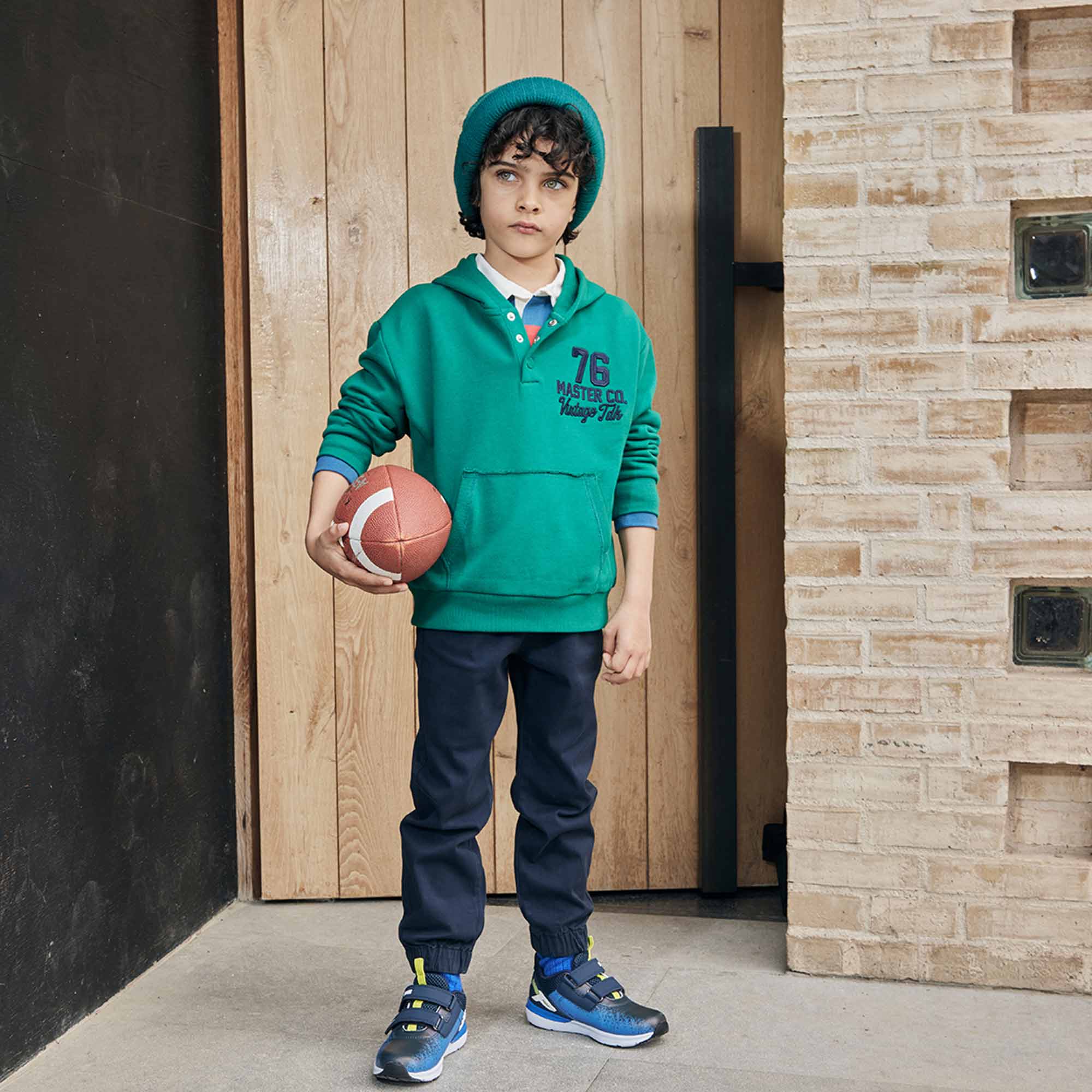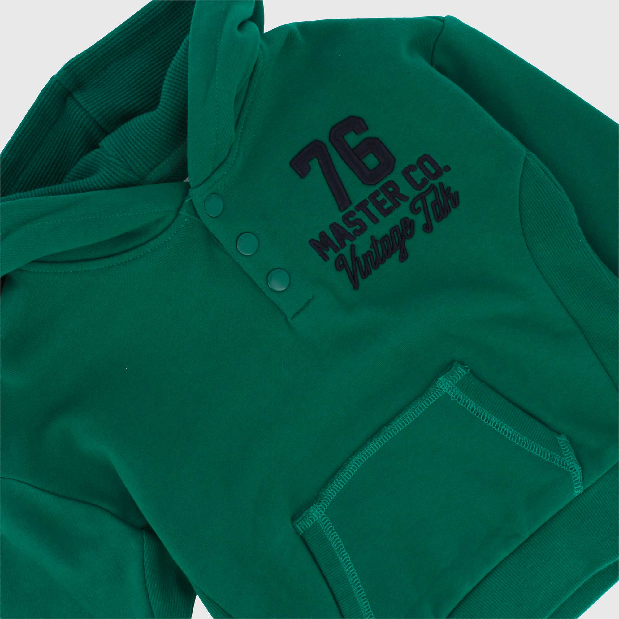 Felpa con cappuccio rivestito in costina, a maniche lunghe. Bottoncini automatici , tasca a marsupio e ricamo sul davanti. Inserti laterali, polsini e fondo in costina.