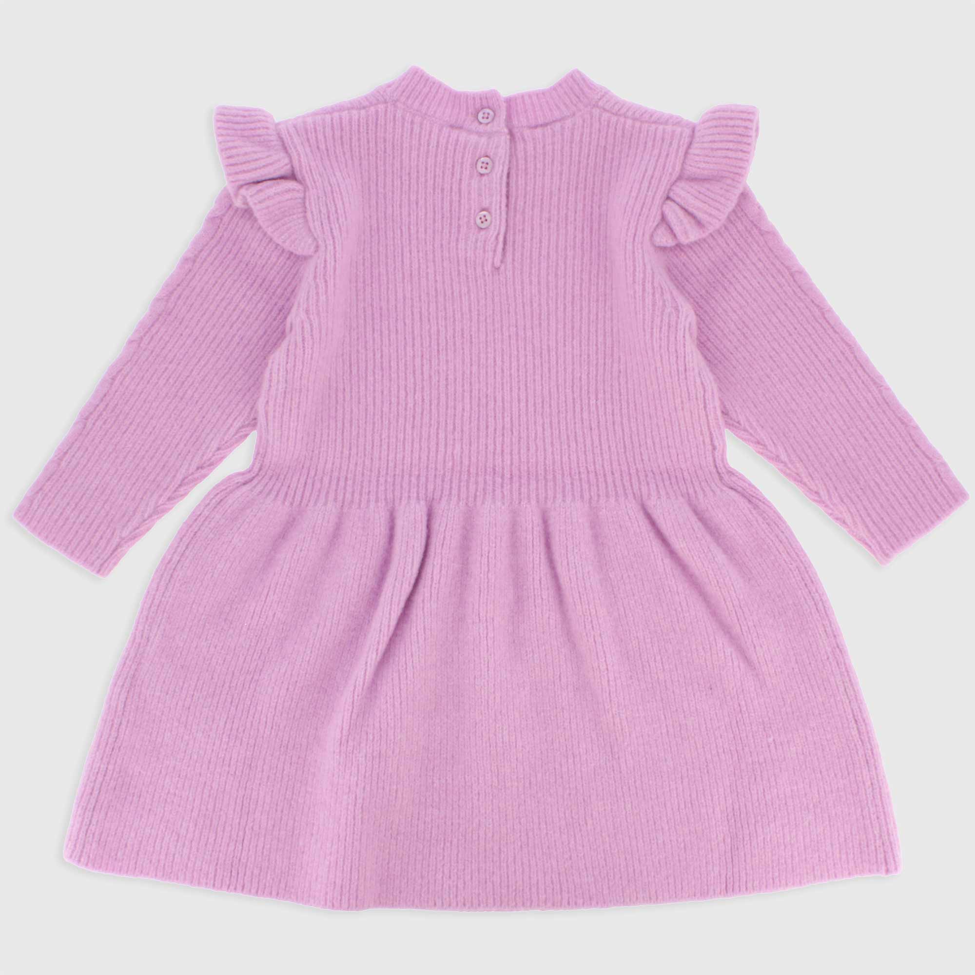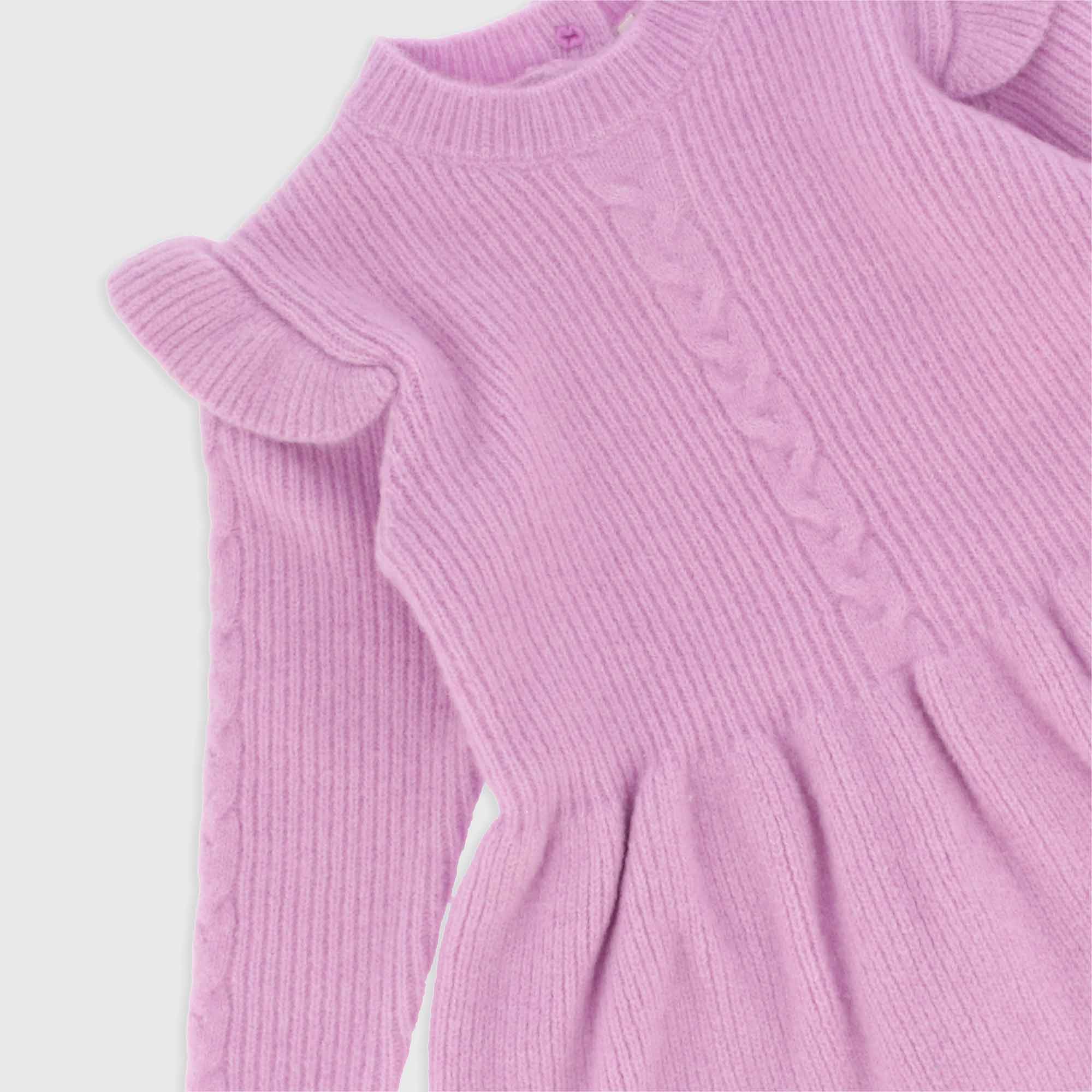 Vestito in morbida maglia con collo rotondo, a maniche lunghe. Chiusura con bottoncini sul retro. Piccoli volants sulle spalle. Lavorazione a trecce.