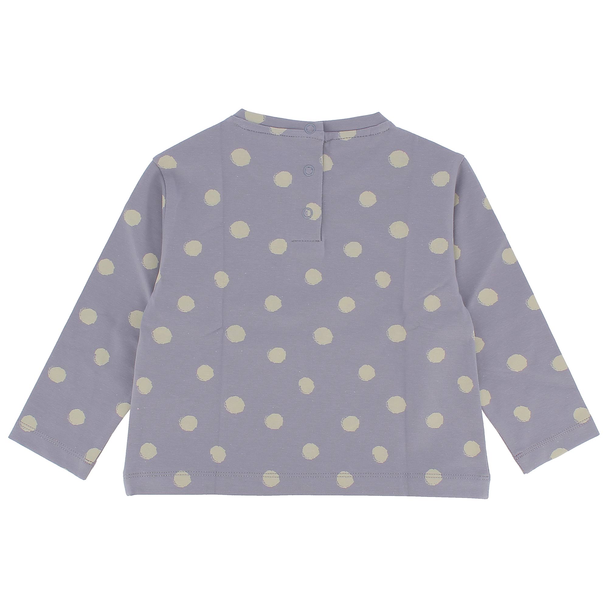 Maglietta in jersey girocollo a maniche lunghe. Chiusura con bottoni automatici sul retro. Stampa all over con pois, e stampa sul davanti. Questo capo è ecosostenibile perché realizzato prevalentemente con cotone organico.