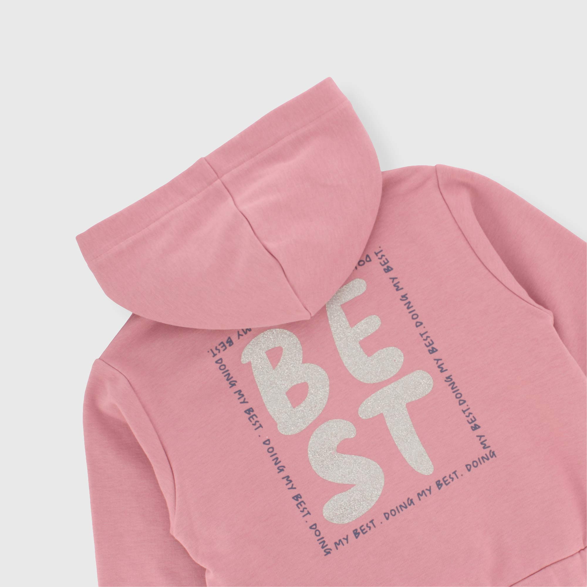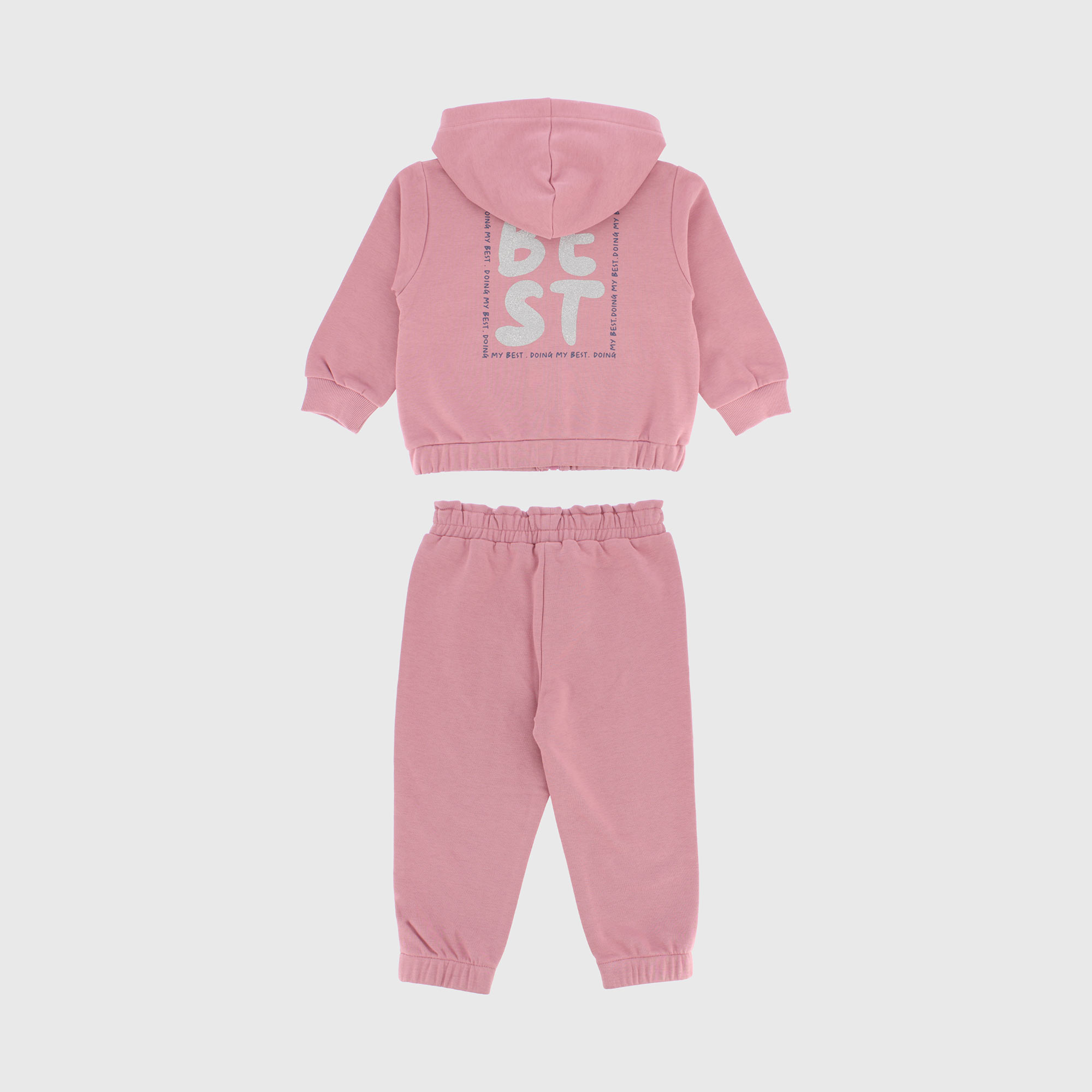 Tuta composta da due pezzi. Felpa con cappuccio, con maniche lunghe. Chiusura con zip sul davanti. Tasca a marsupio. Stampe glitter sul davanti e sul retro. Pantalone in felpa con vita elasticizzata e fondo elasticato.