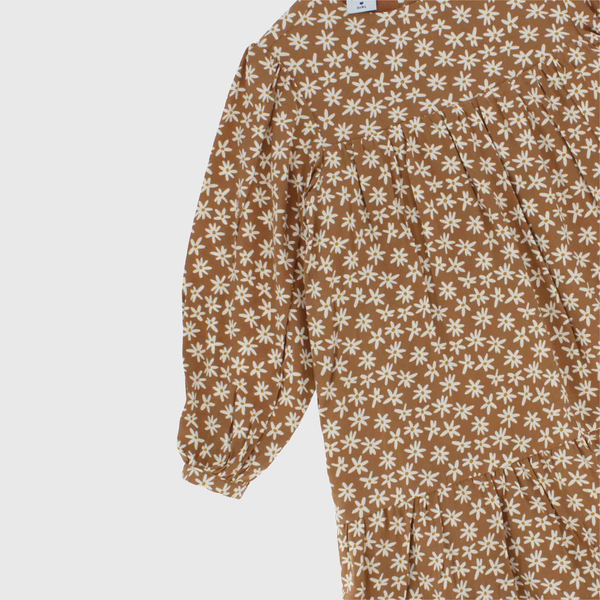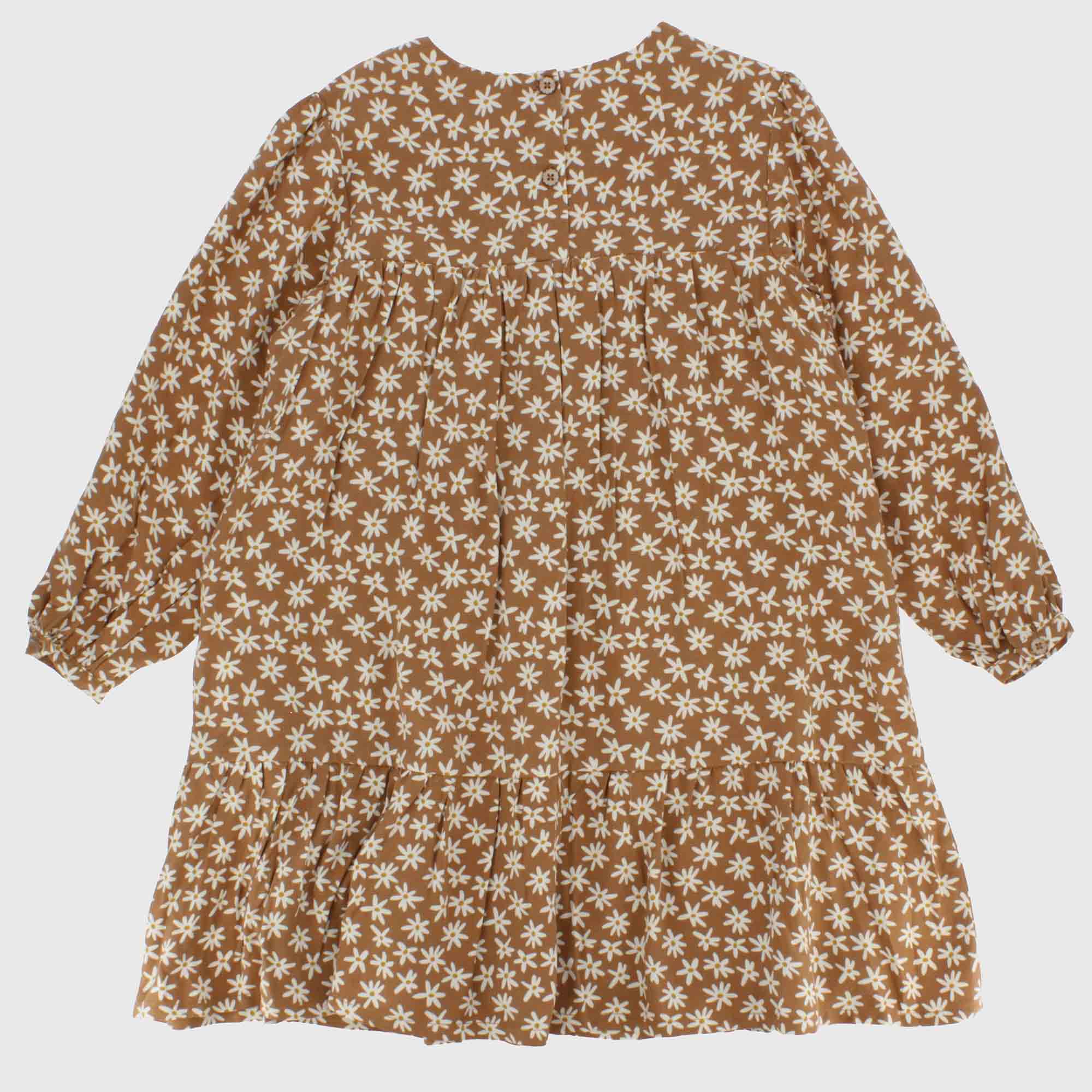 Vestito in tessuto stampato a fiori, con collo rotondo. Maniche lunghe a sbuffo con bottoncino sul fondo. Chiusura con bottoncini sul retro. Interno foderato.