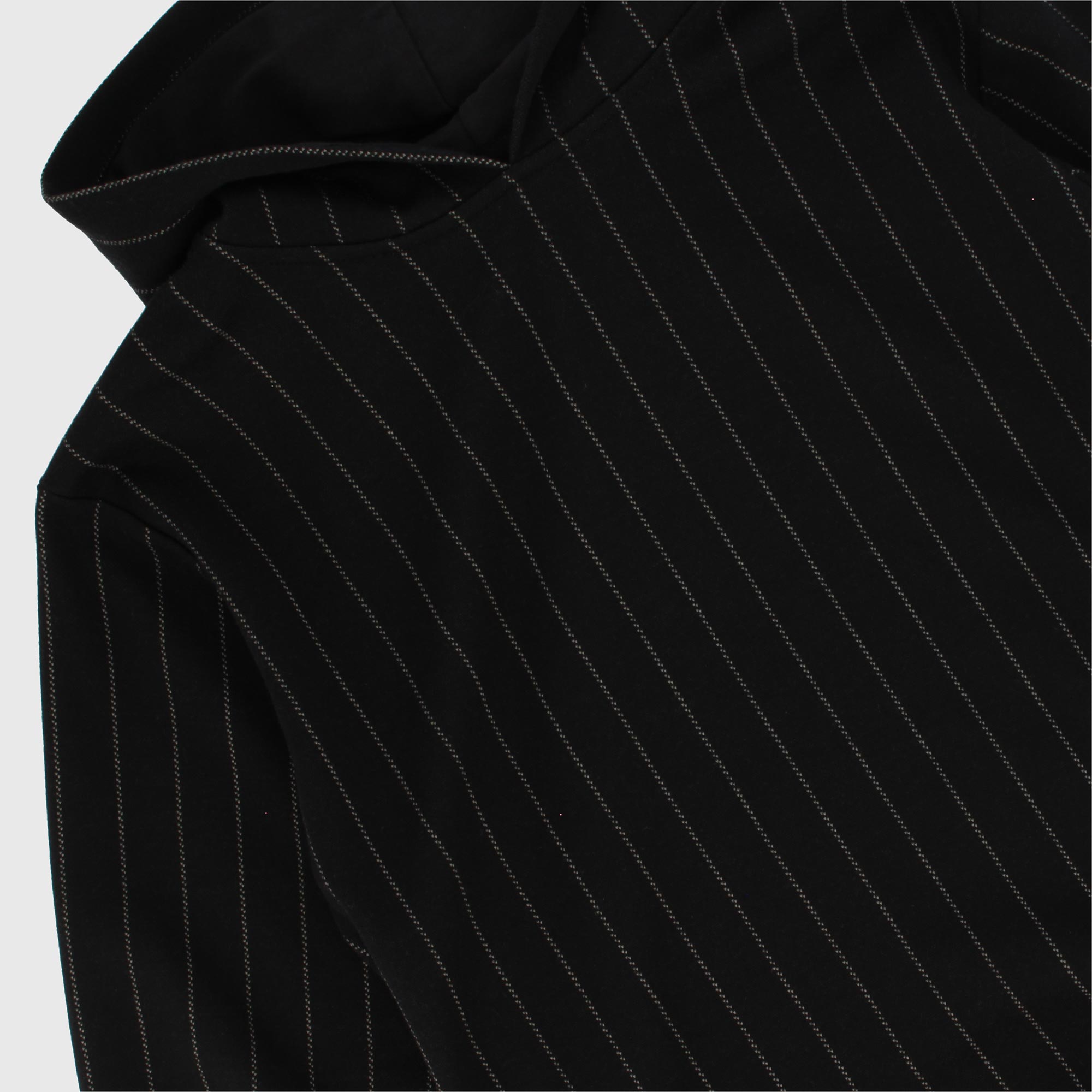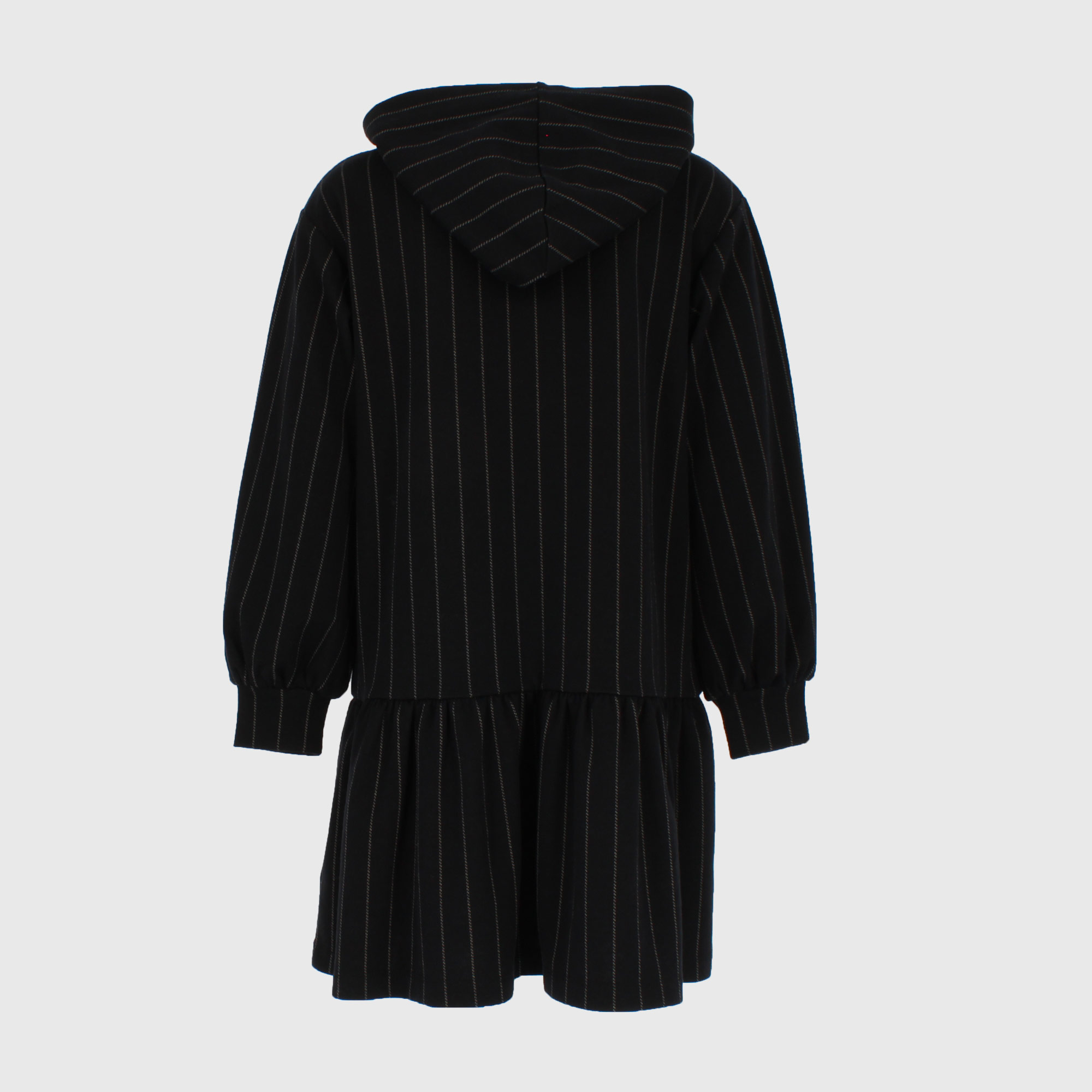 Vestito in tessuto gessato con cappuccio e maniche lunghe a palloncino.