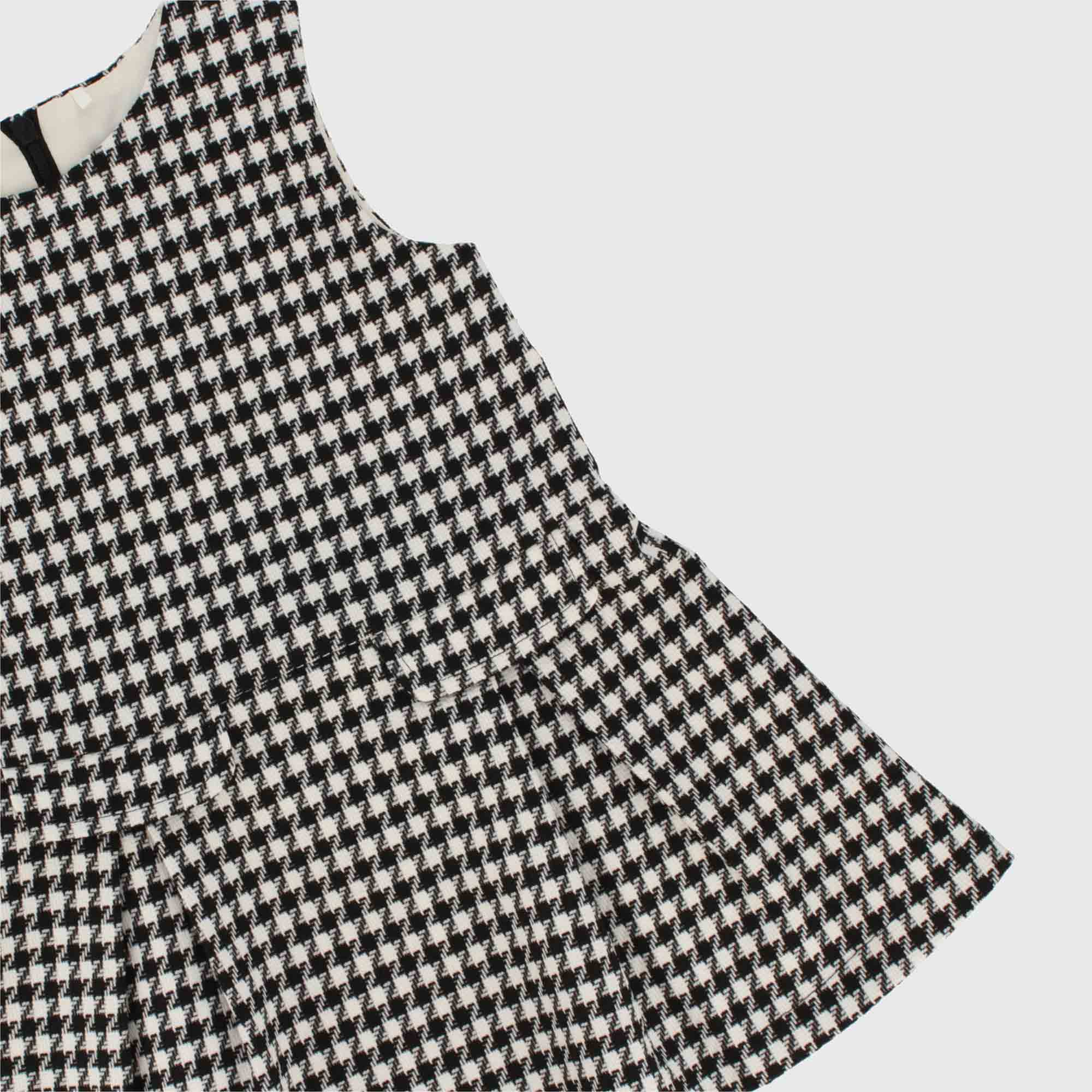 Vestito pied de poule senza maniche. Chiusura con zip sul retro. Finte tasche sul davanti. Gonna a pieghe. Fodera interna.