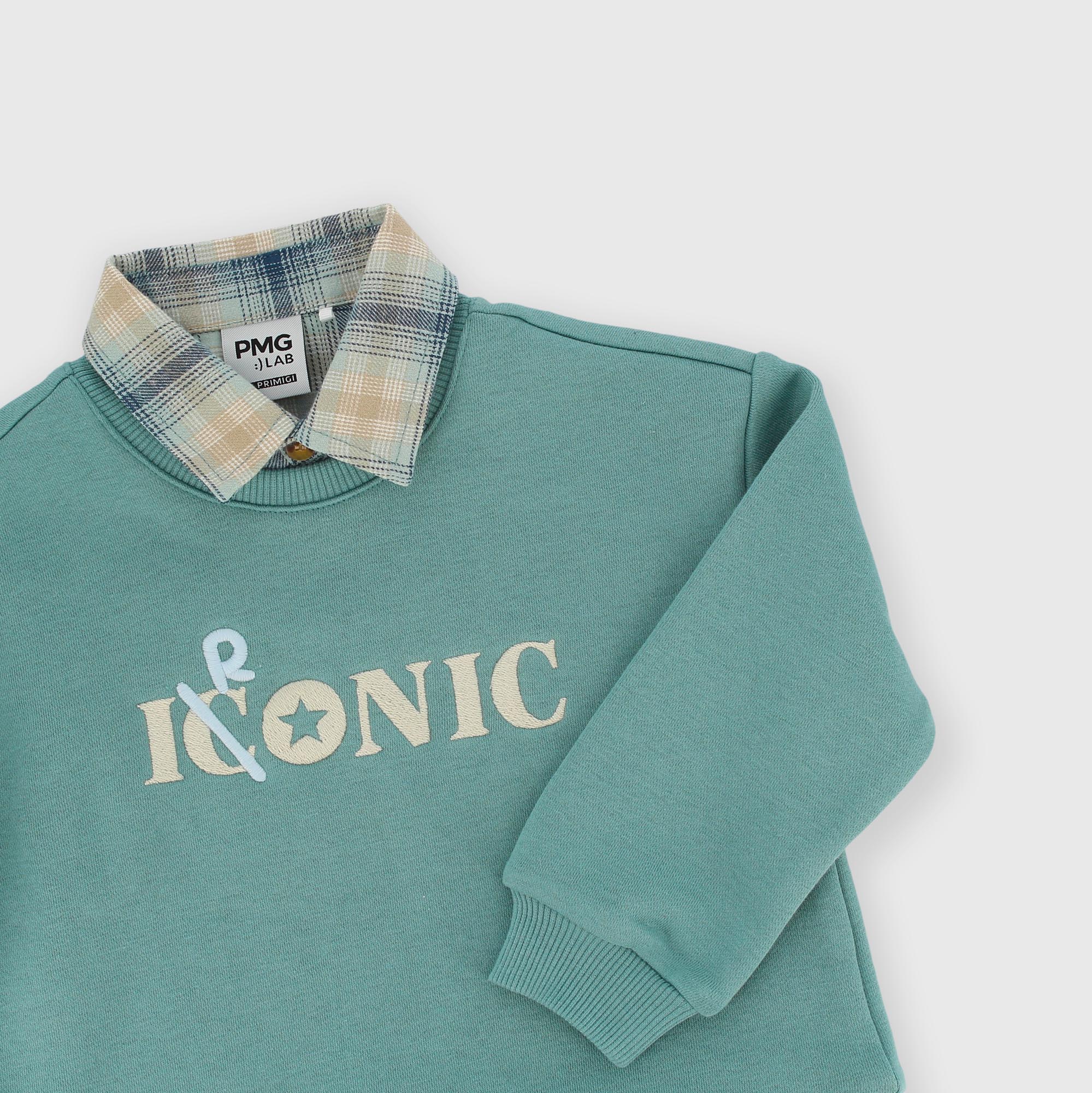 Felpa a maniche lunghe con finta camicia a quadri applicata sotto. Ricamo sul davanti. Collo e polsini in costina.
