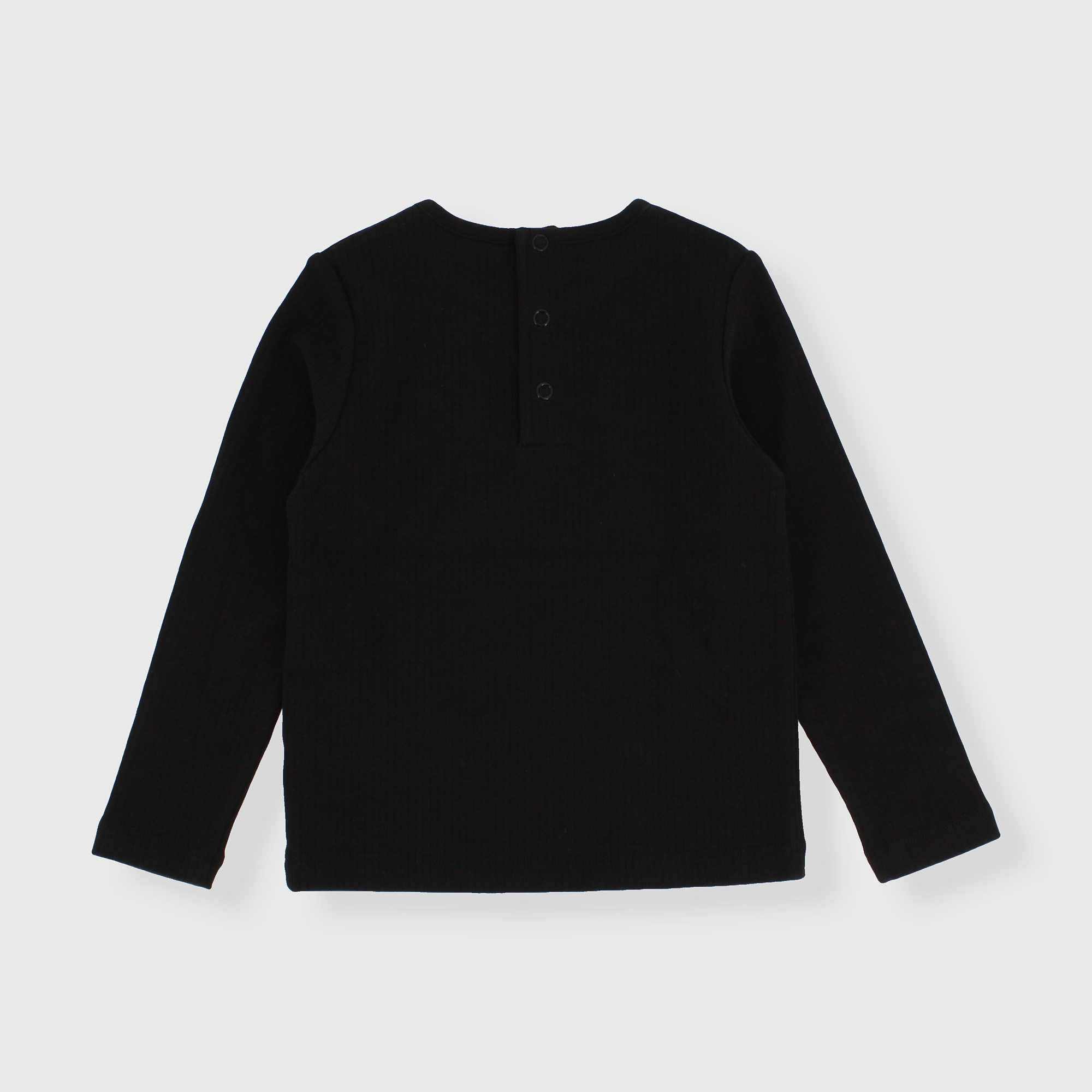 Maglietta a costine, girocollo, a maniche lunghe. Chiusura con bottoncini automatici sul retro.