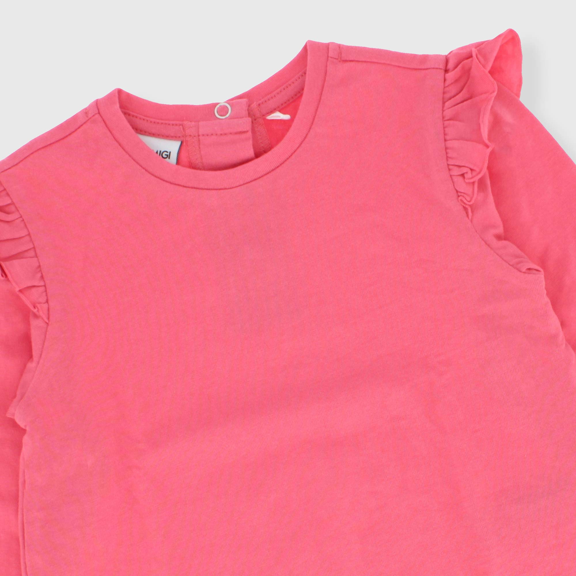 Maglietta in jersey, girocollo, a maniche lunghe. Chiusura con bottoncini automatici sul retro. Volants sullo scollo.
