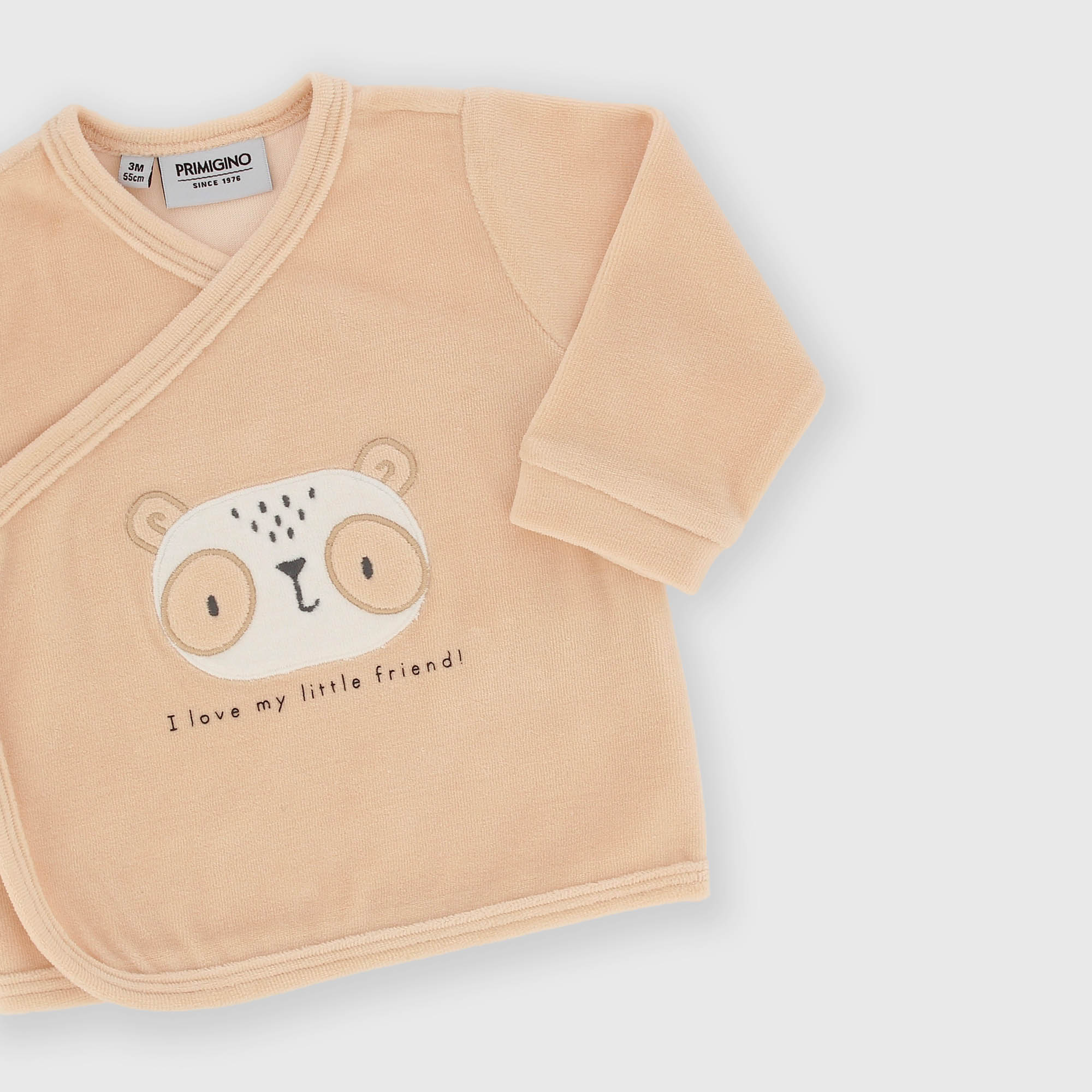 Scaldacuore in ciniglia a maniche lunghe. Abbottonatura a kimono. Stampa panda sul davanti.