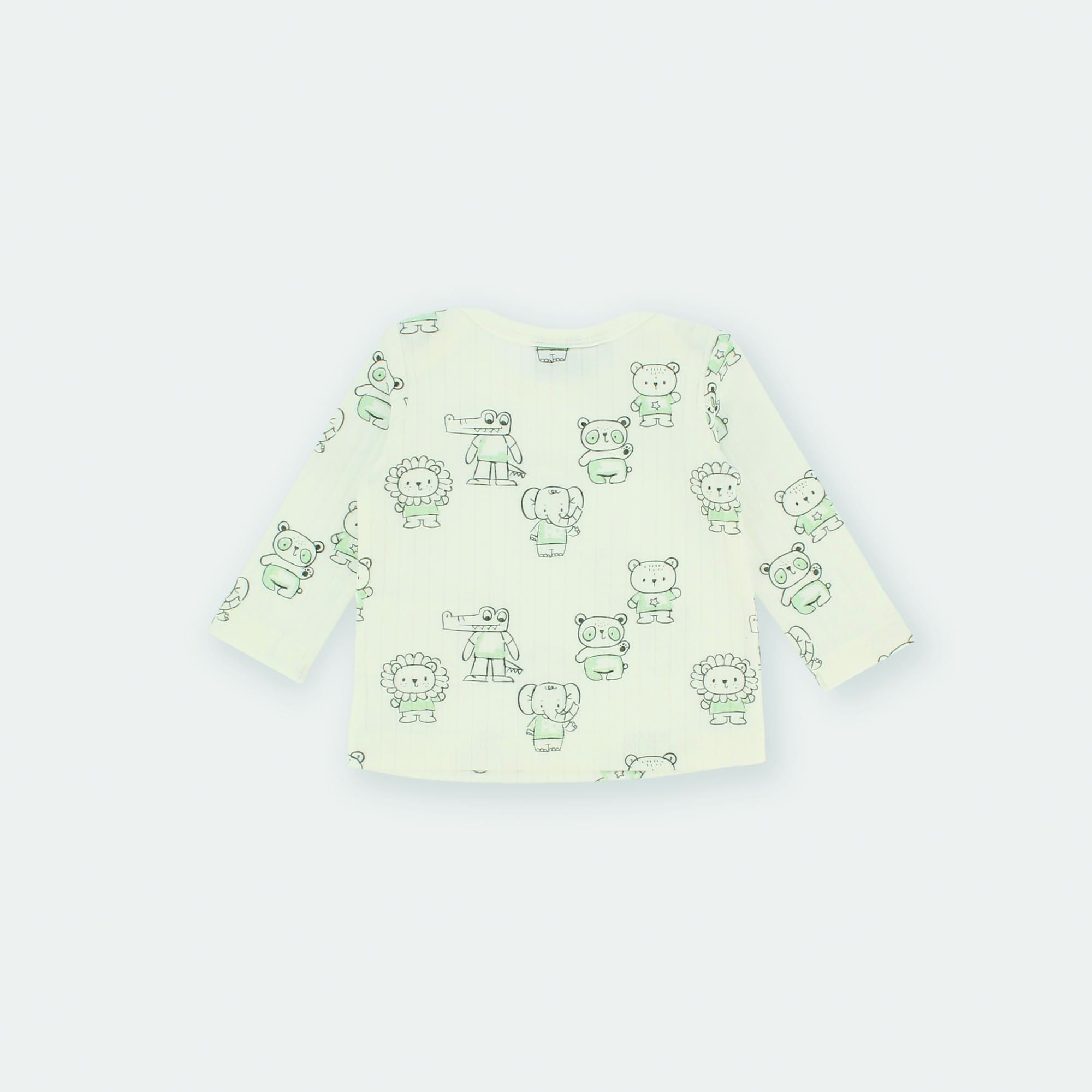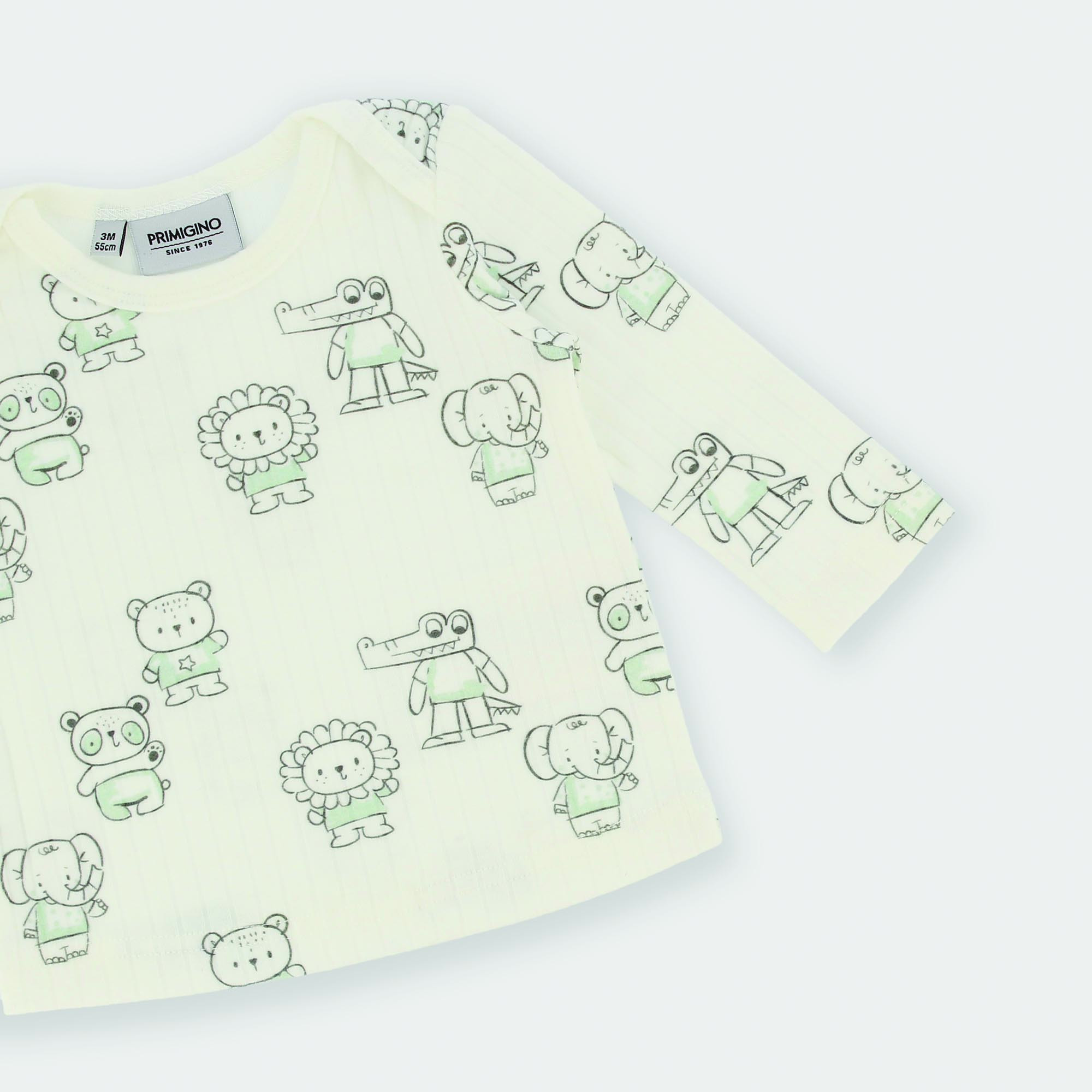 Maglietta in costina, girocollo, a maniche lunghe. Stampa all-over animaletti.