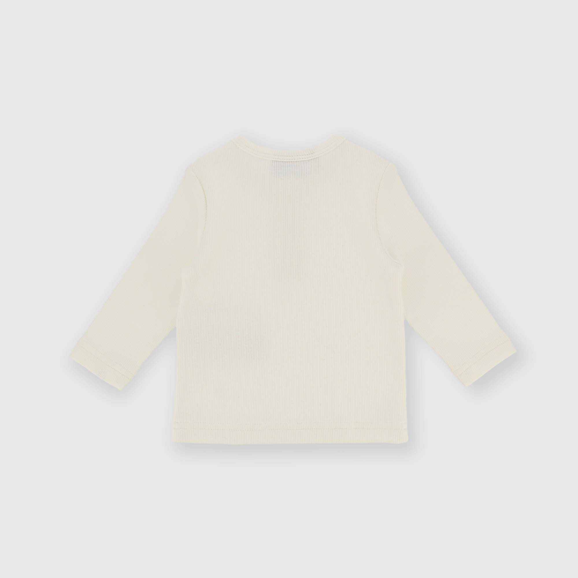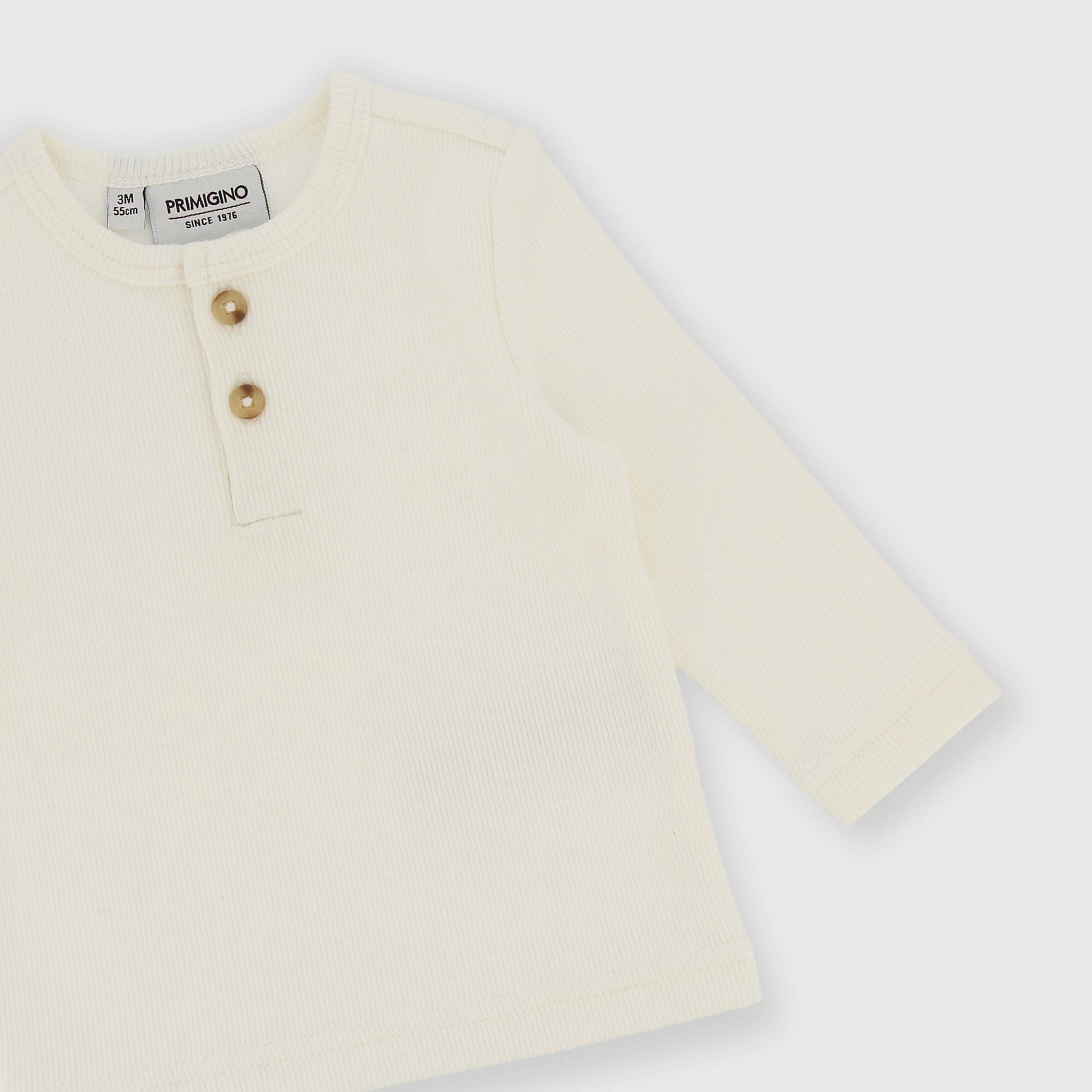 Maglietta serafino in costina, girocollo, a maniche lunghe. Bottoncini sullo scollo.