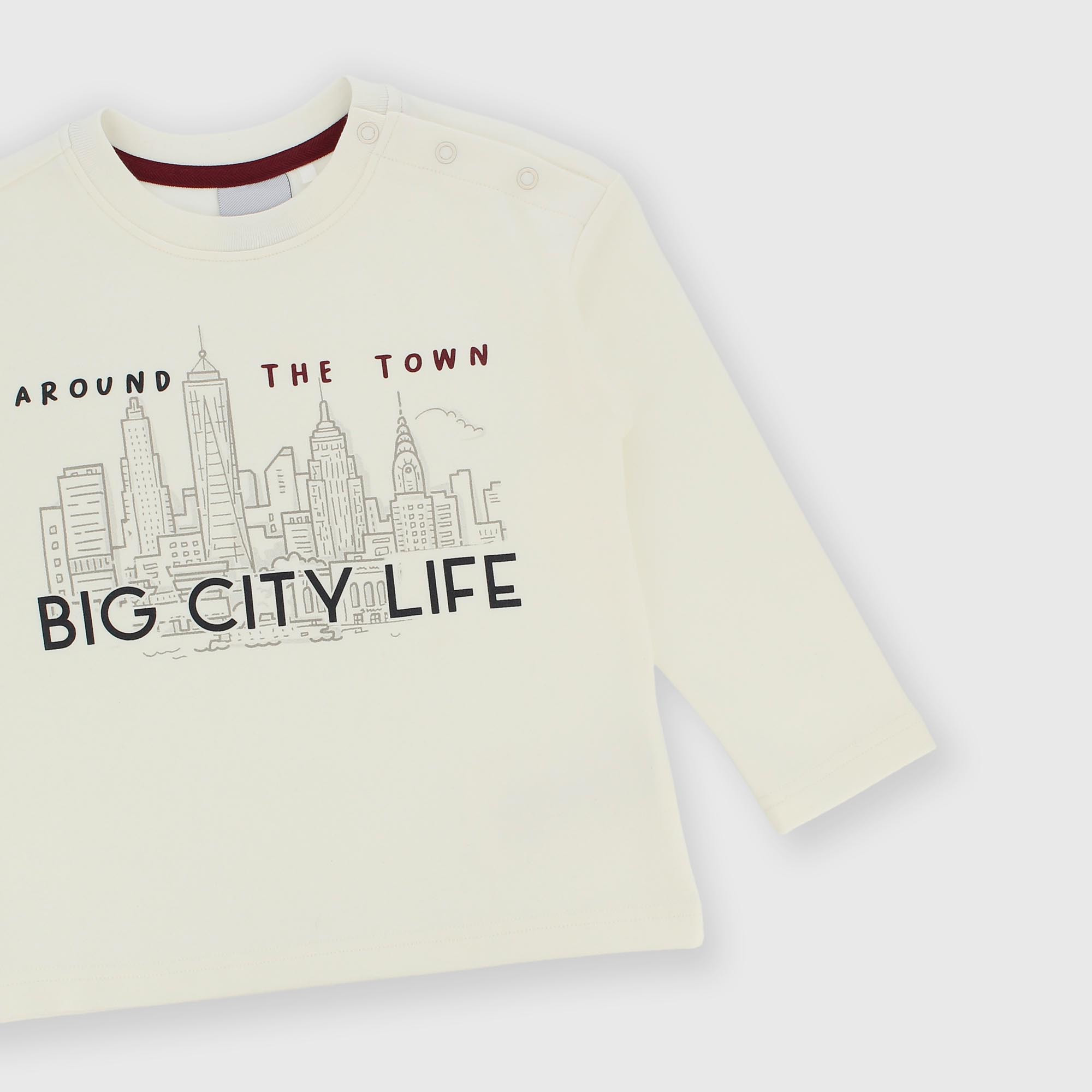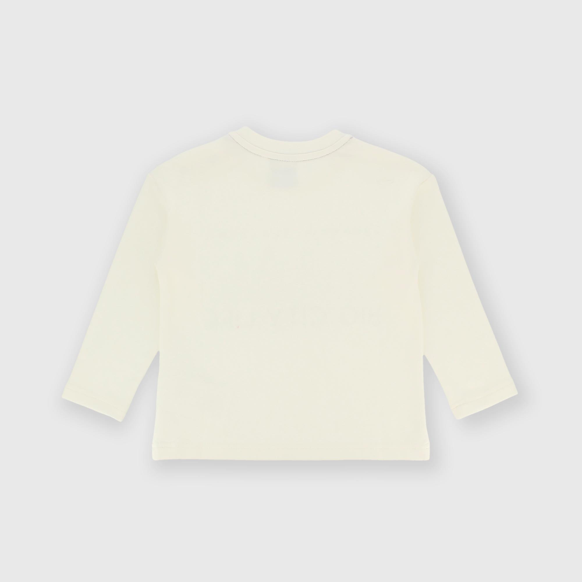 Maglietta in caldo cotone, girocollo, a maniche lunghe. Chiusura posteriore con bottoncini automatici. Stampa sul davanti.